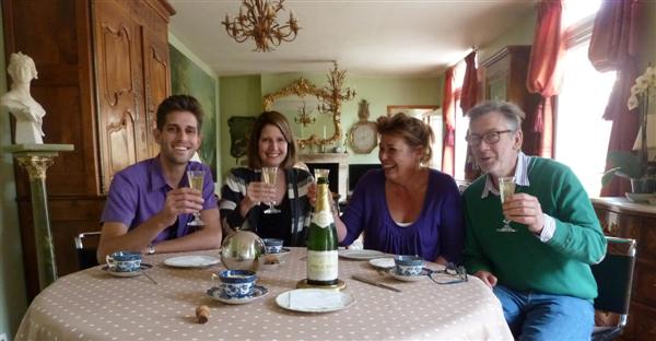 After a six hour delay, Renée finally landed in Paris to meet up with Alexander and the hunt is on. Our first stop, just outside Paris, was a visit to see Frederic and Annie. Twelve years of working together means sharing personal milestones as well. They have just become grandparents for the first time, so naturally a bottle of champagne was in order.