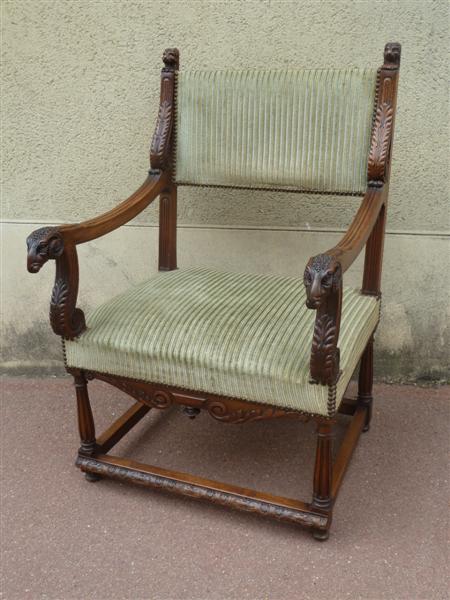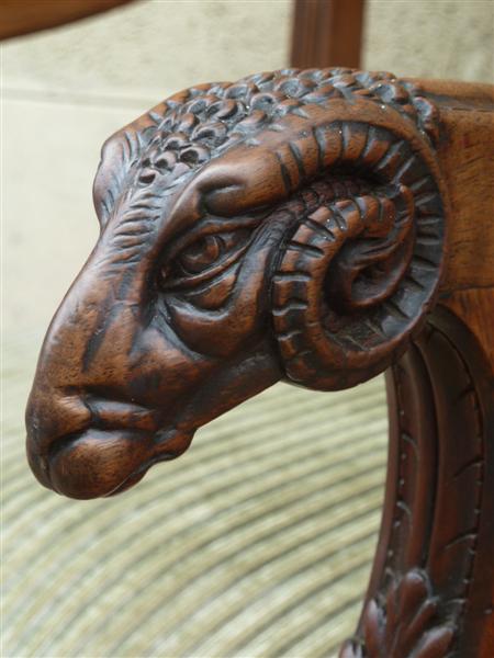Exquisitely hand carved walnut armchair with rams' heads. Nineteenth century. |