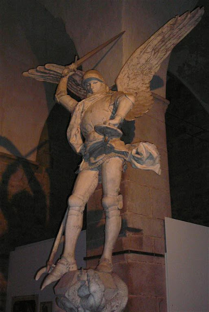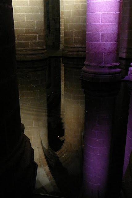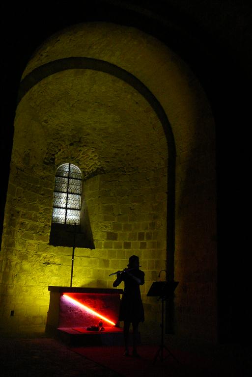 The visit of the abbey at night takes on a spiritual quality not felt during the day. The abbey is dark inside with only niches and columns lit here and there. A harpsichord is being played in one large hall and futher on a viola. Then a narrow corridor and ancient stone steps before we arrive at an altar where a soloist is playing the flute. The visitors walk in hush tones through the abbey. Sounds of a heartbeat, a ticking clock, birds in the cloister are heard in various rooms. The passing of time, the beauty of stillness. Finally, a harpist is playing in the chapel where the monks used to gather for mass, and we leave this place pensively, solemnly, a visit to treasure within.