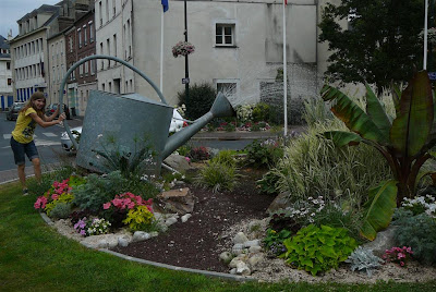 Camille stopped to water flowers in the "rond point" (or round-about) while zipping to our next town.