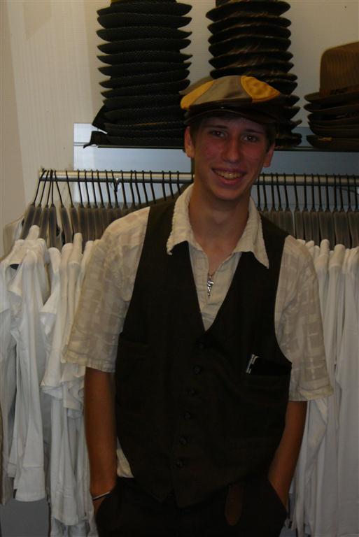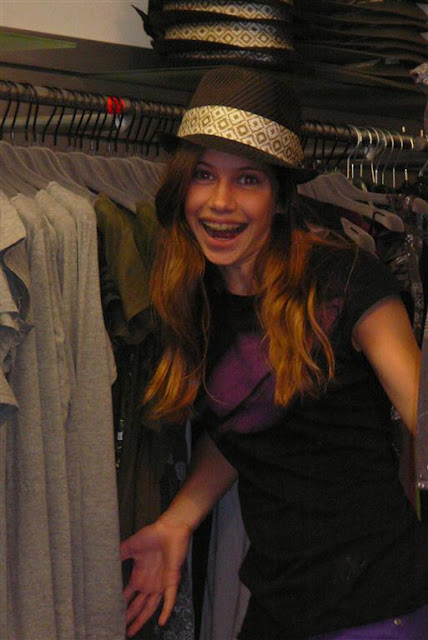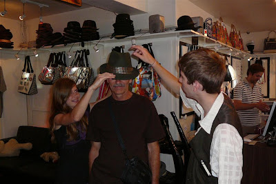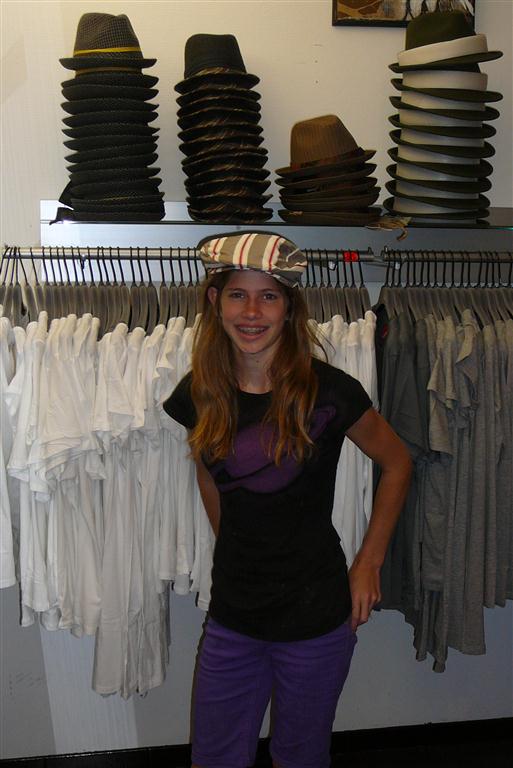 Traveling with teens has its spontaneous moments—like trying on hats in a local shop.