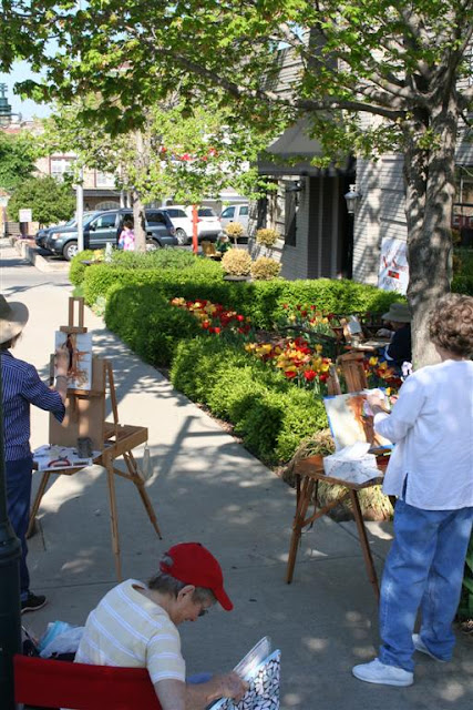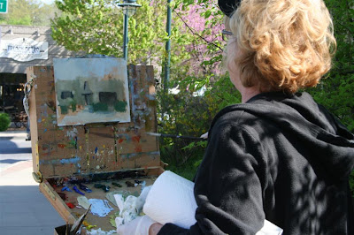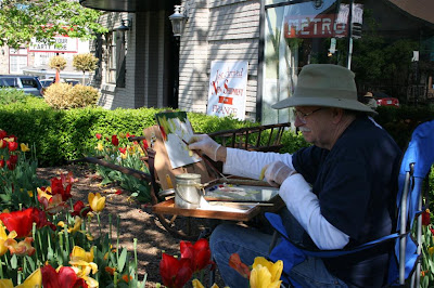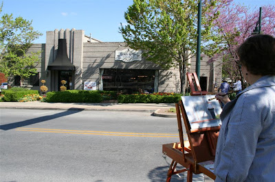 The Plein Air Painters of the Ozarks were at French Metro Antiques this morning painting in the garden. A dozen painters were sprinkled around the building, some painting a still life we had set up with antique objects from the shop, others capturing the tulips. Their works will be displayed in our shop on May 6 during First Thursday Art Walk in Fayetteville.