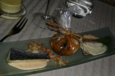 One great thing about this part of our work is our reward system. After a long day of hunting for antiques, we can always look forward to an authentic French meal. Sometimes it’s a brasserie, sometimes a creperie, but every few days we make time for something really special. Last night we treated ourselves to one of our favorite restaurants and ordered the chef’s “degustation” or tasting menu. For three hours, we were regaled with course after course, each a surprise selected by the chef. By the end of the meal, we had eaten foie gras, crab, lobster sauce, seabass, seabream, sole, duck breast, beef tenderloin, wild hare, three desserts, and a dozen cheeses. Of course there’s no way to capture the flavors or even the beauty of the presentation, but below are some photos of a few of the courses.