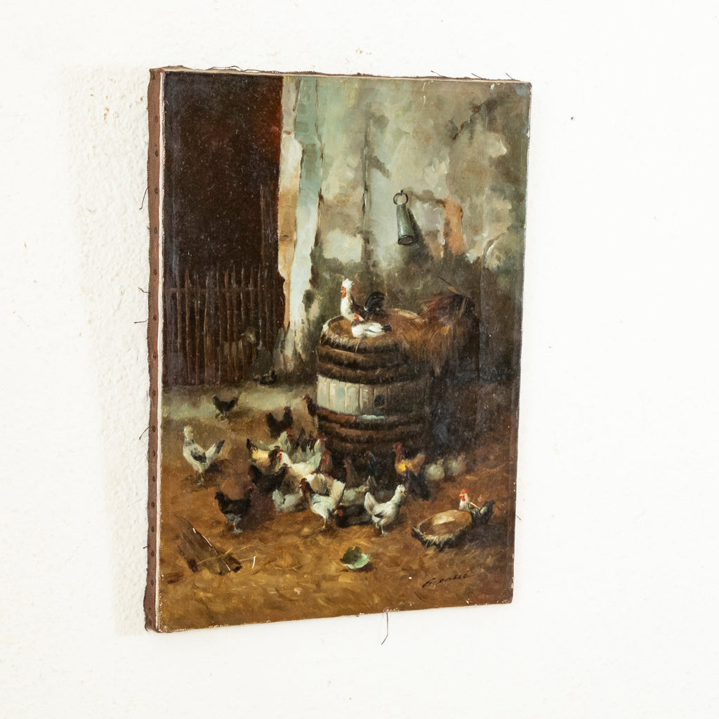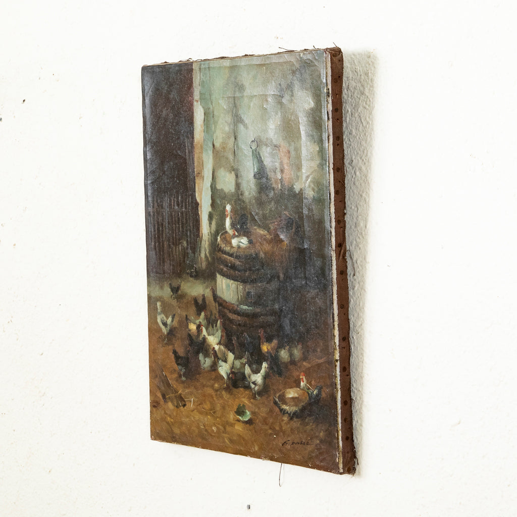 Nineteenth century oil on canvas. Farm scene with chickens. 15.5" H X 12" W