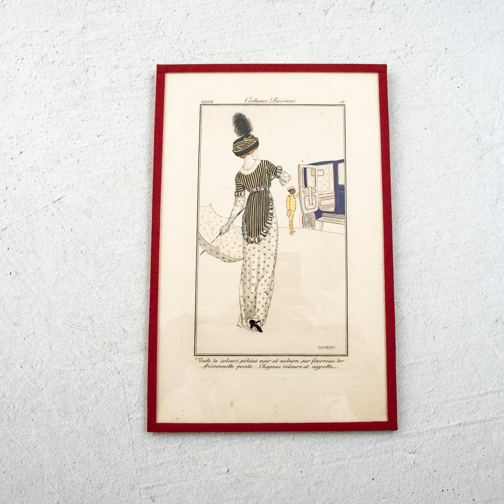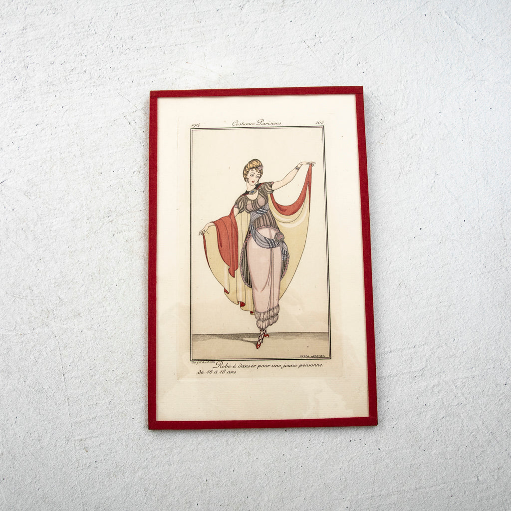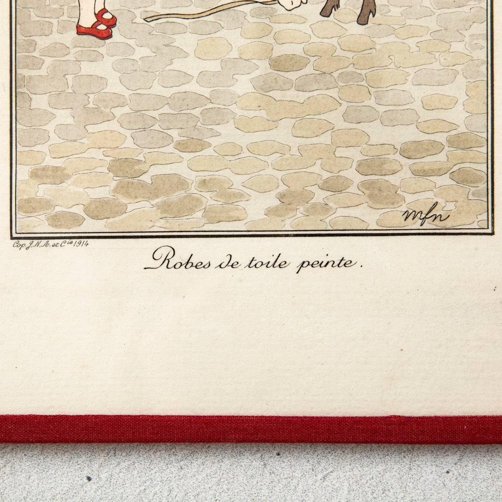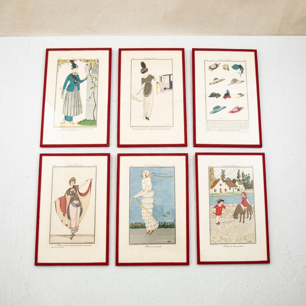 Early twentieth century women's fashion engravings. Each was hand colored with watercolor for the Jardin des Modes, a small booklet given to women to choose dress styles. c. 1910-1915. Six...