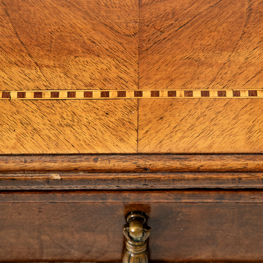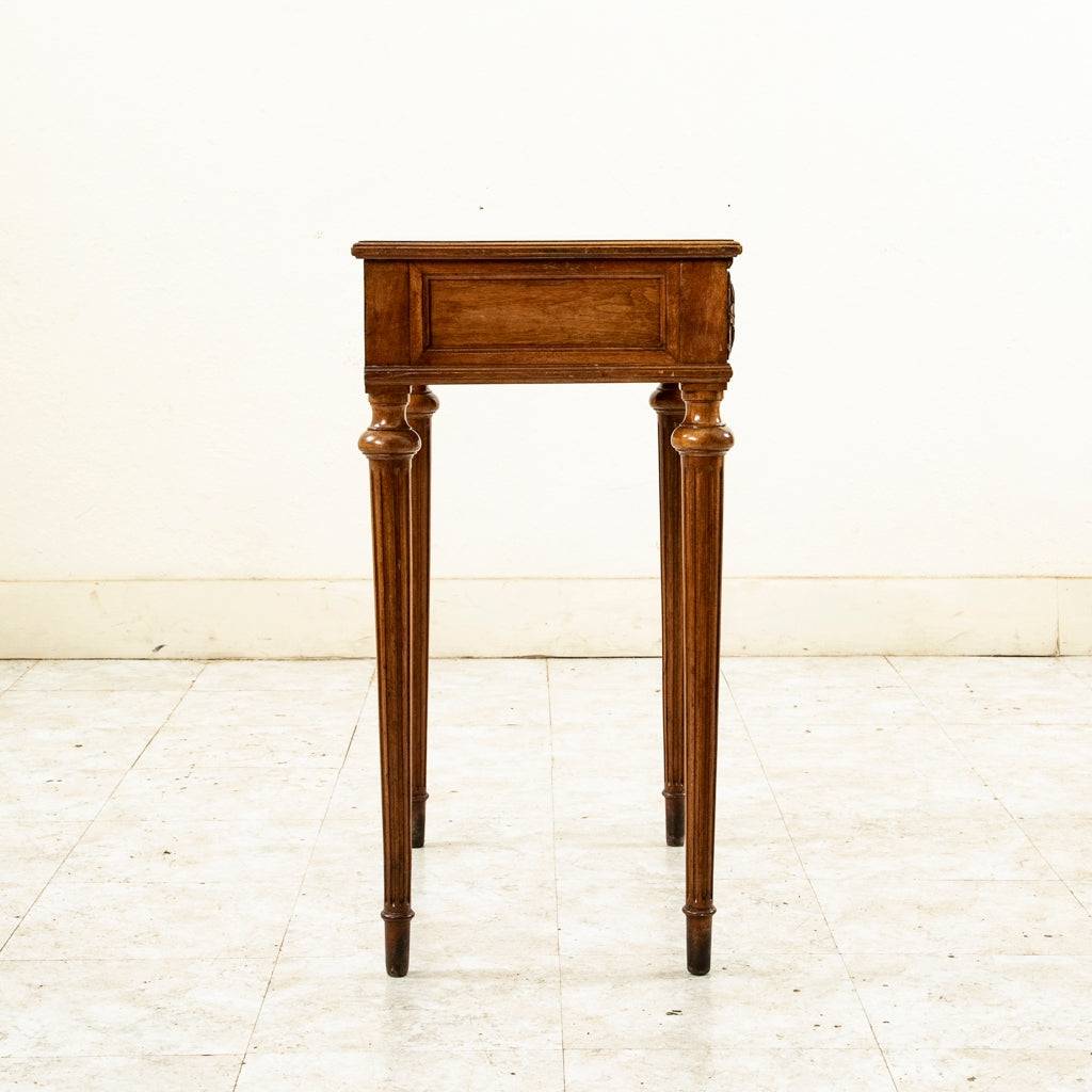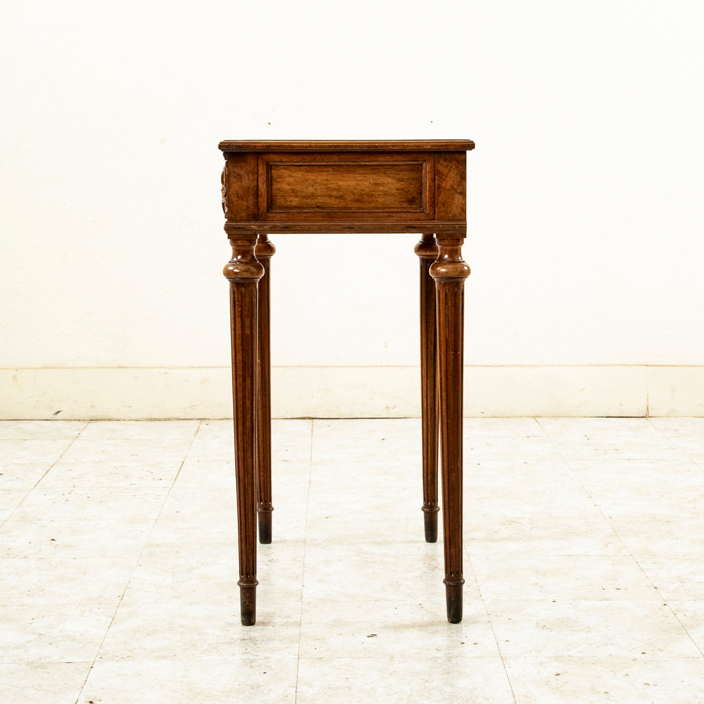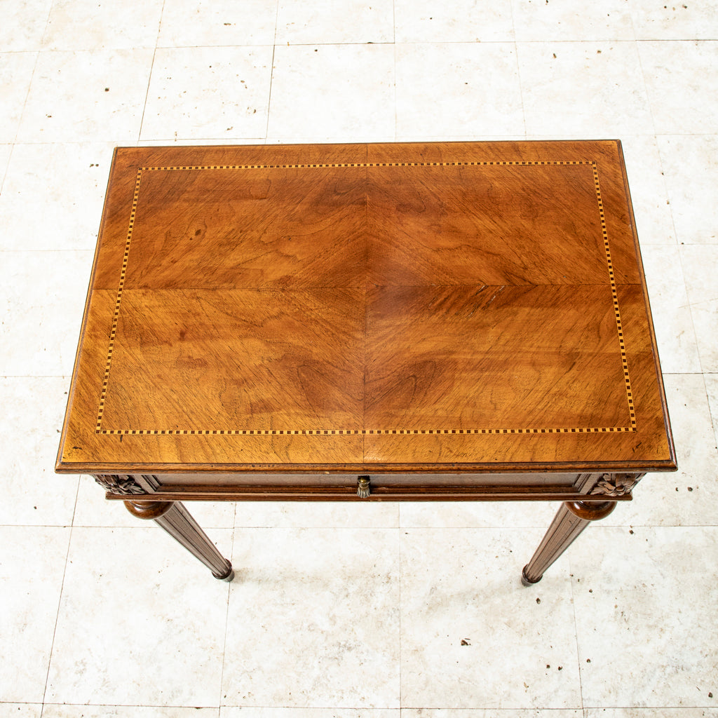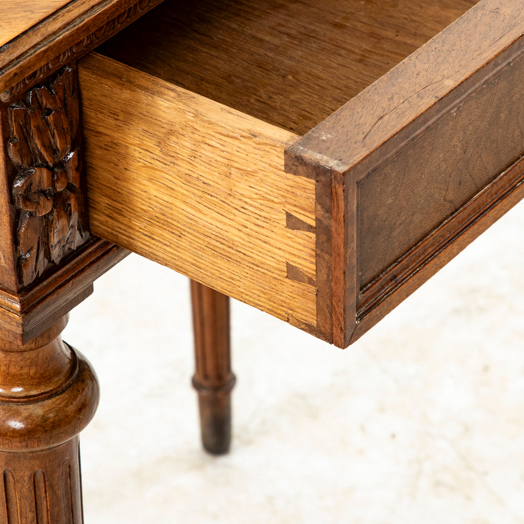 Hand carved walnut Lous XVI style side table with single drawer and marquetry inlay on the top. Bronze drop tassel handle. c. 1930. 30.5" H X 24" W X...