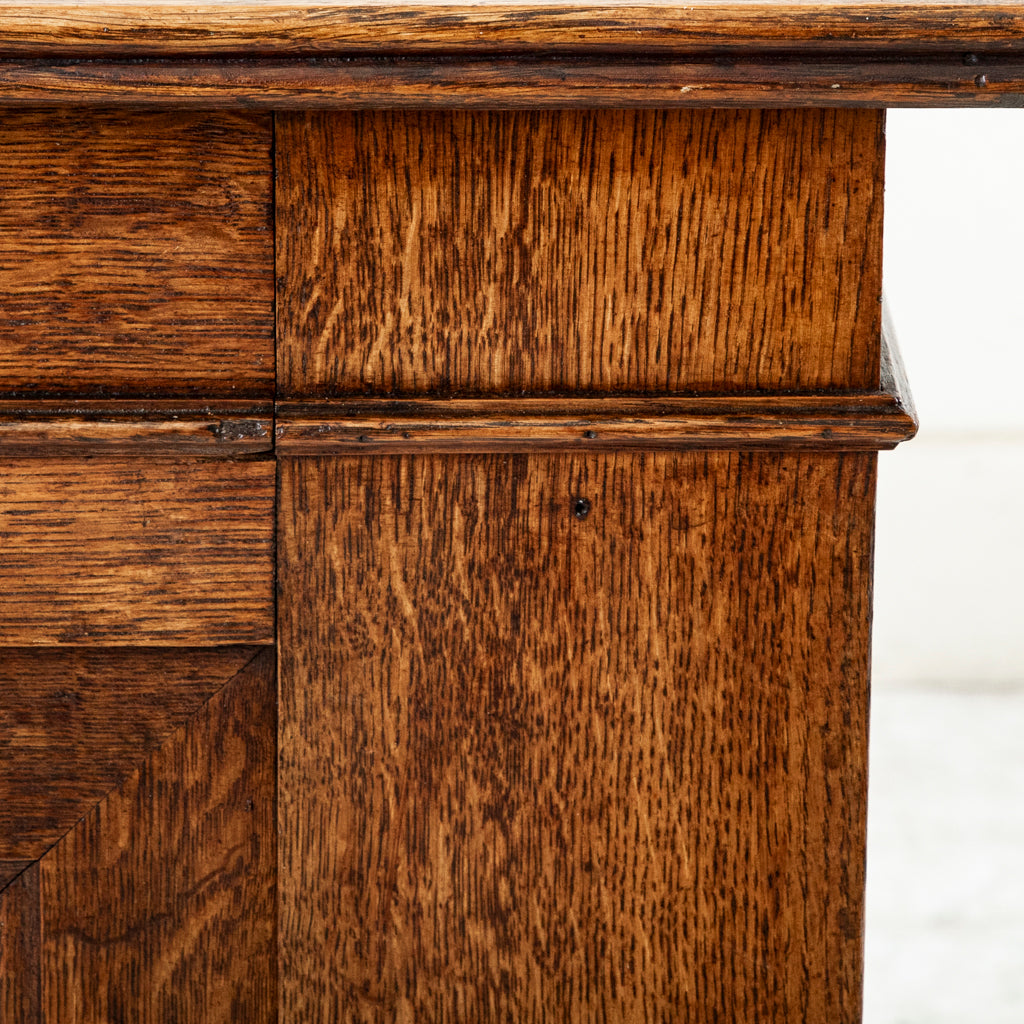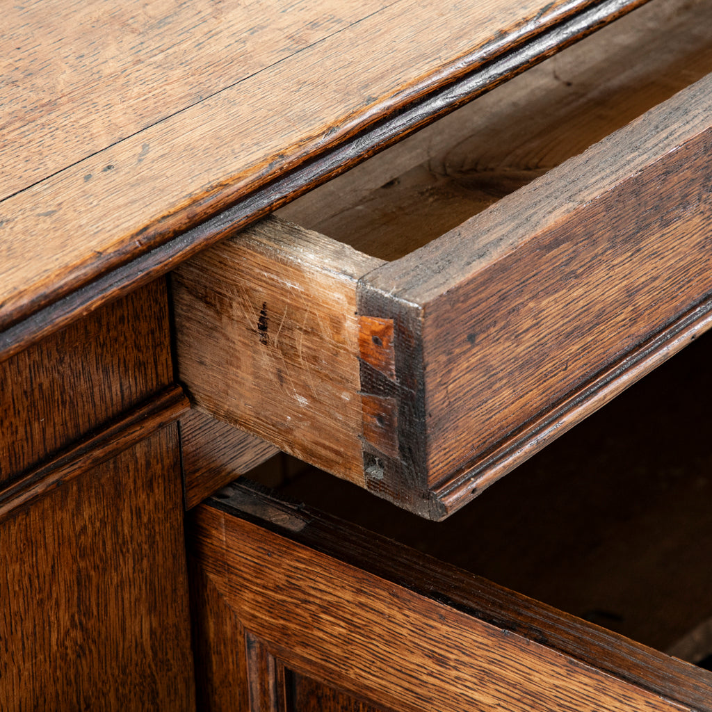 Late eighteenth century oak Louis XV enfilade with three drawers and three doors. Three interior shelves. Back of the sideboard is all hand hewn. Includes three keys. c. 1770. ...