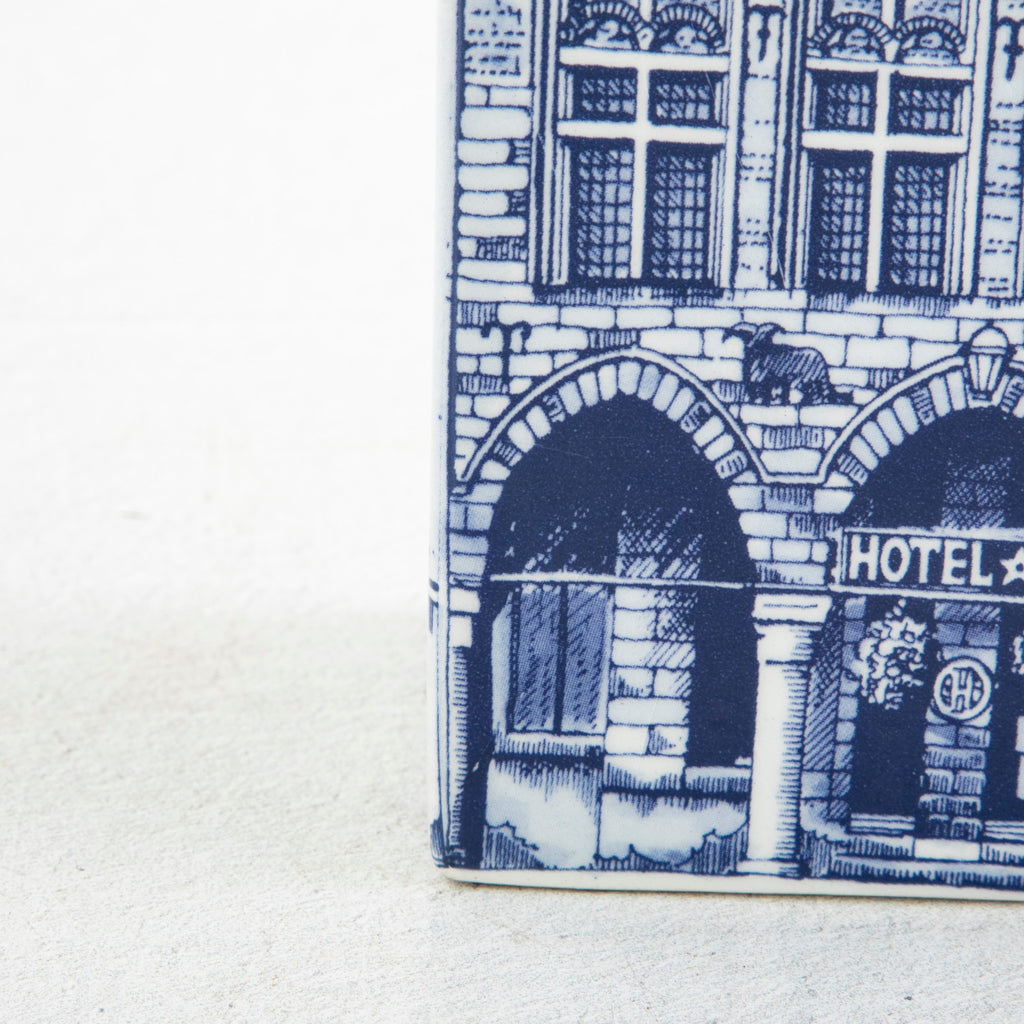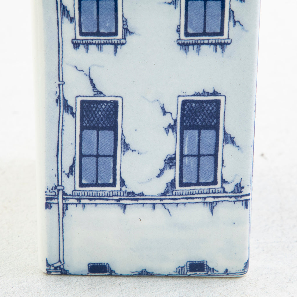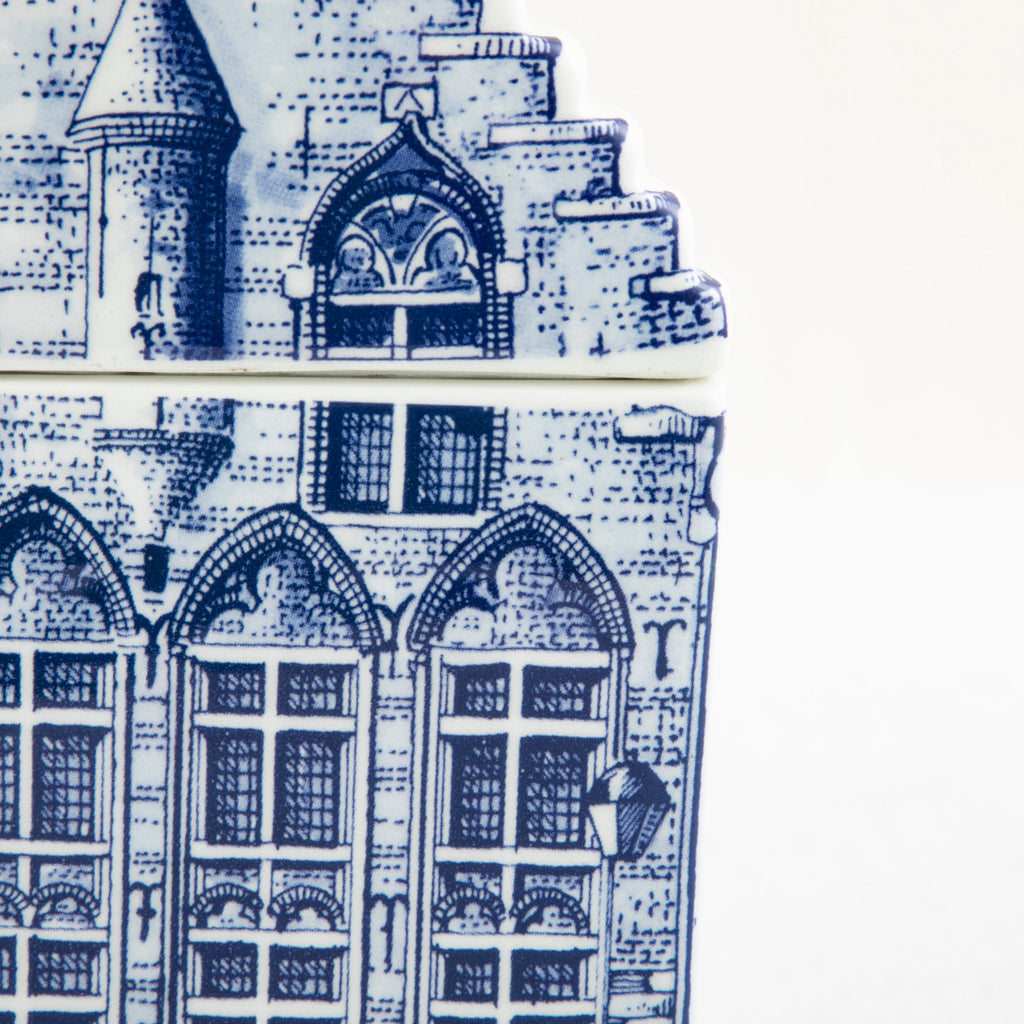 Porcelain spice pot or canister in the shape of a Dutch house. 8" H X 4" W X 3" D