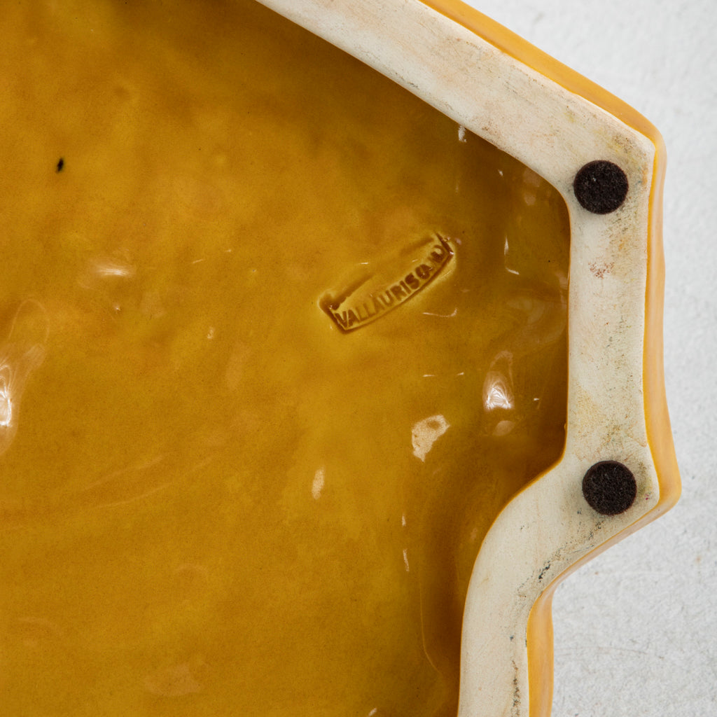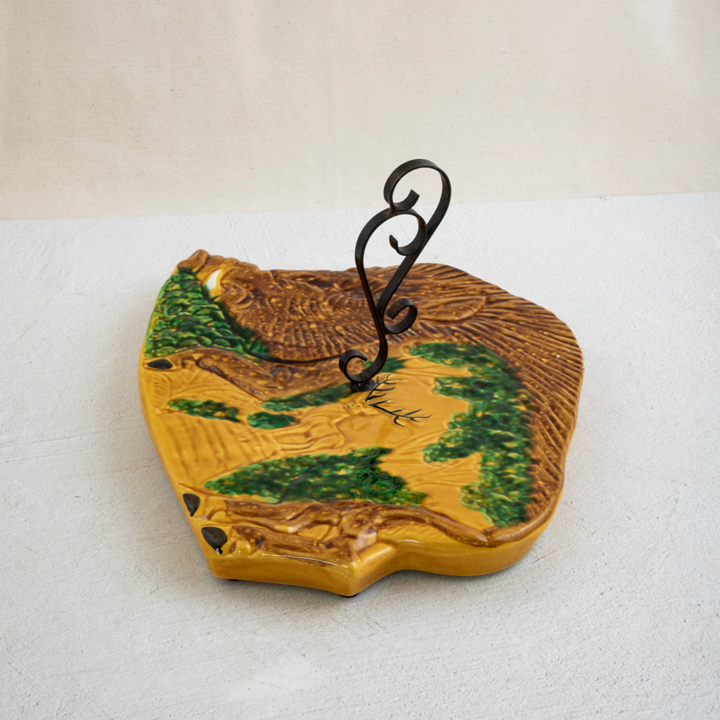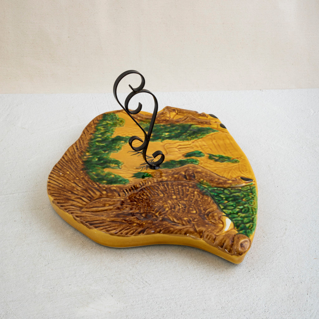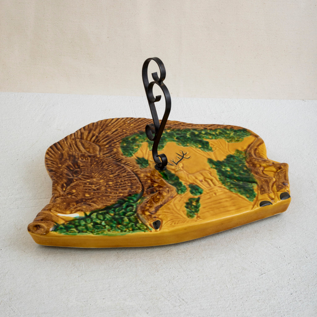 Vallauris faience cheese platter in the shape of a wild boar with metal handle. Twentieth century. 13.5" L X 10.25" W X 6" H