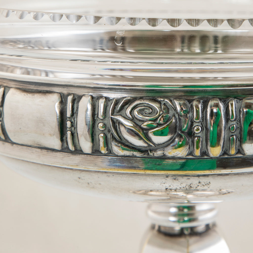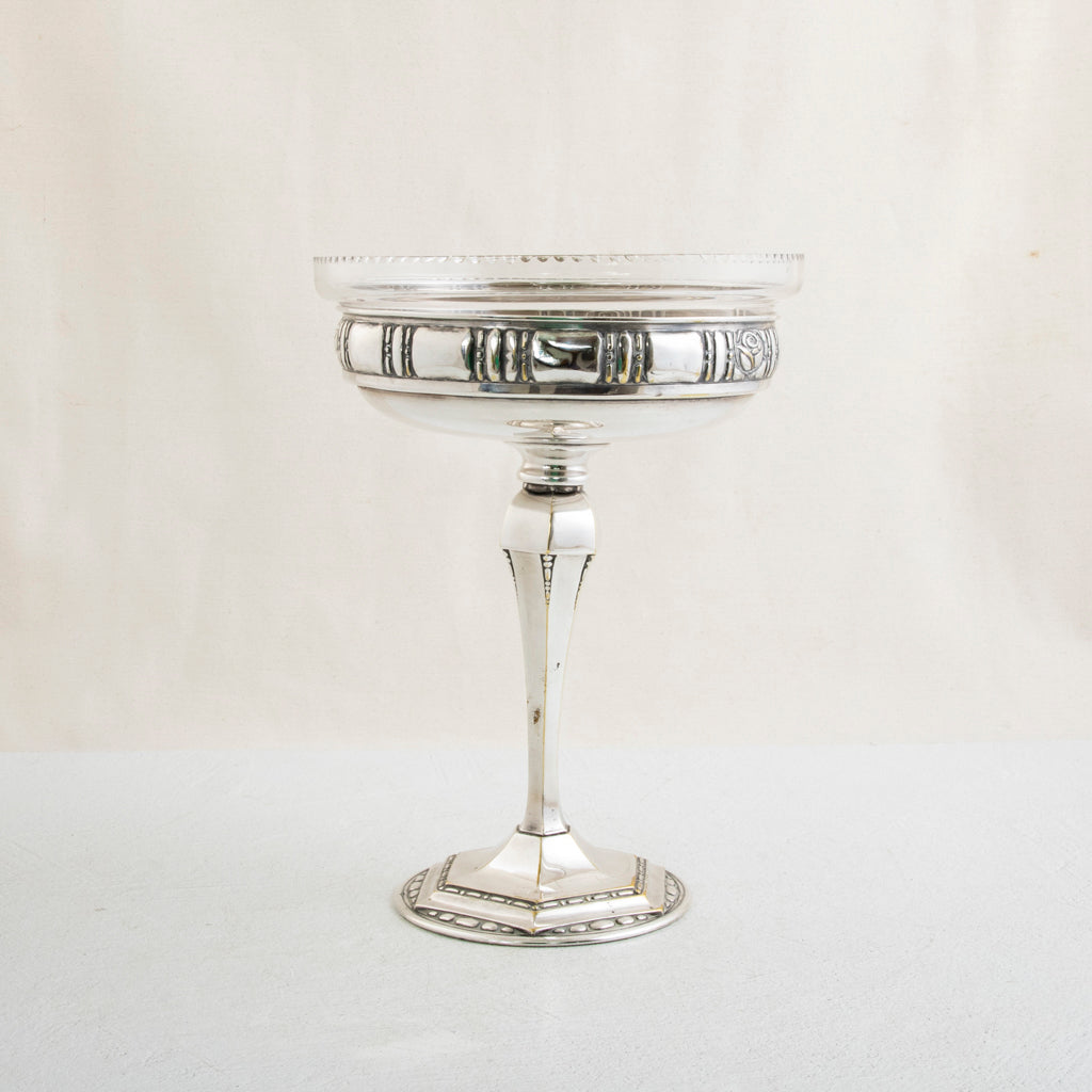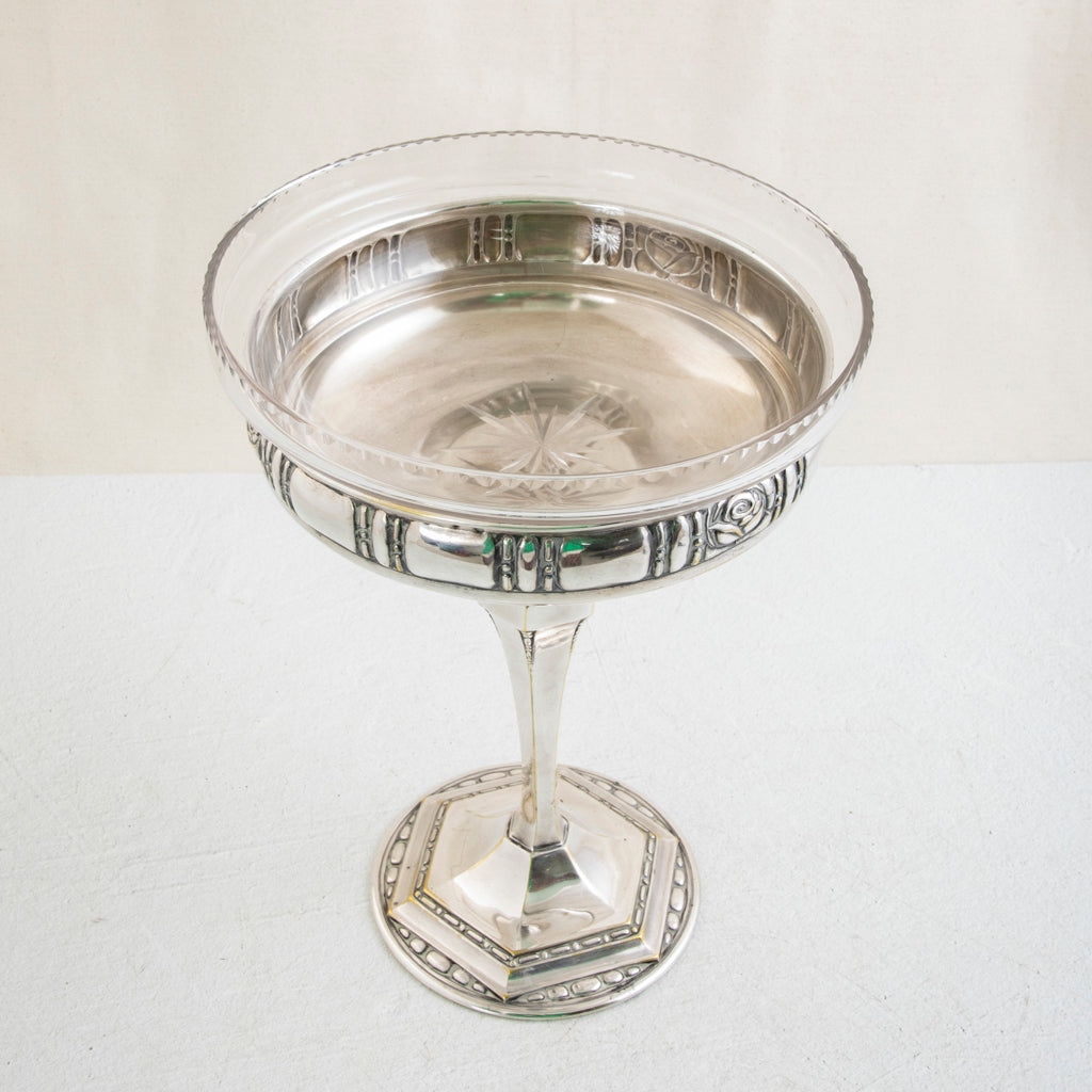 Art Deco period tall silver plate coupe with original etched glass insert, c. 1920. 12" H X 8.75" Diameter