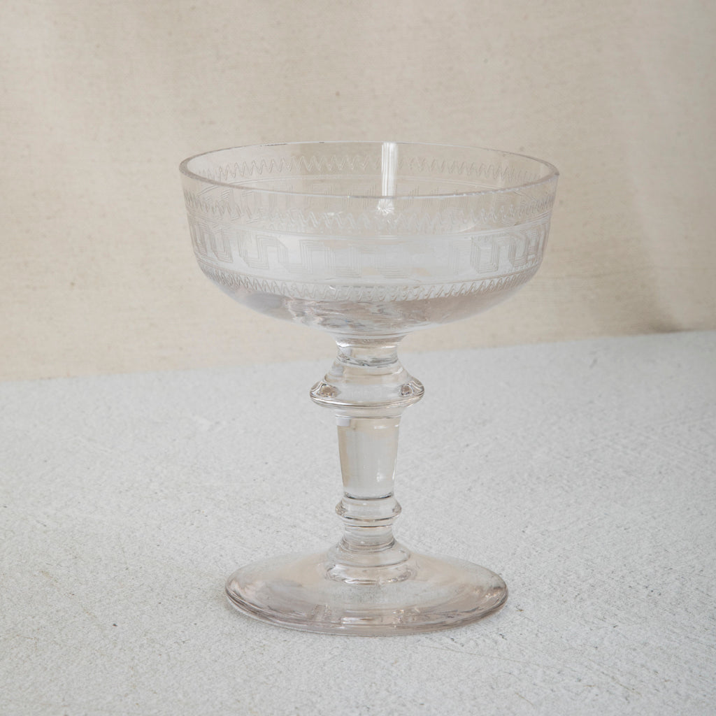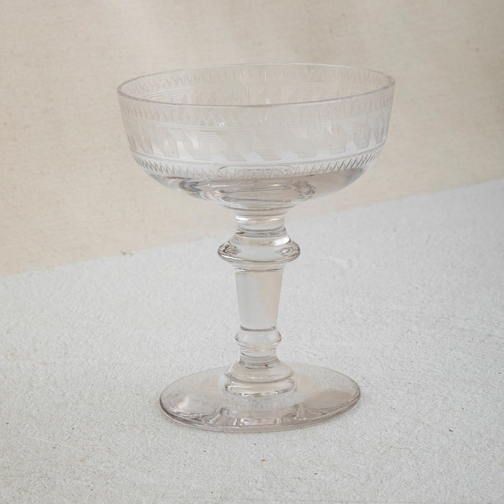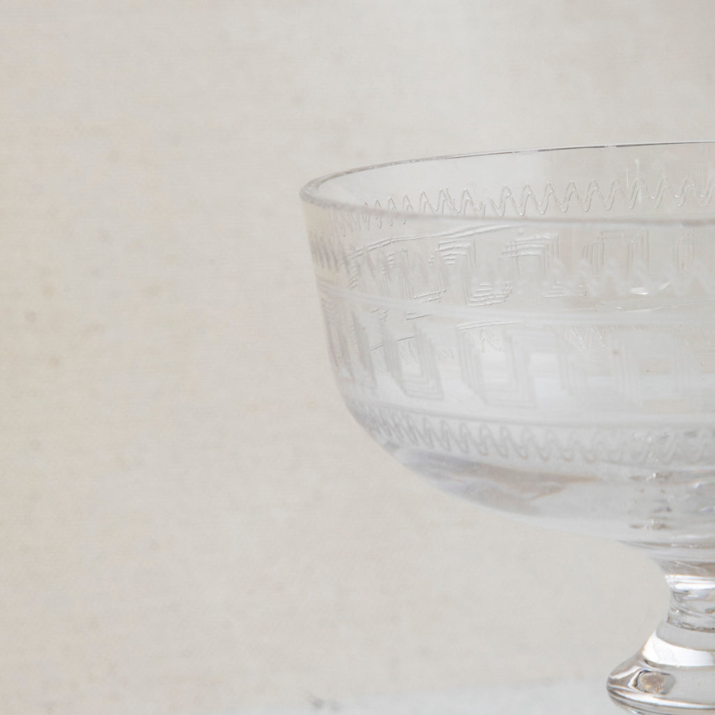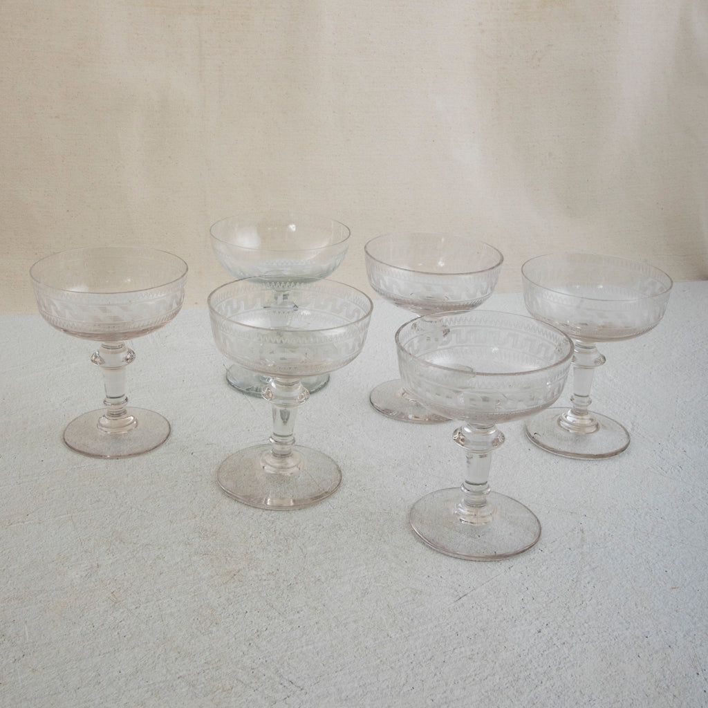 Set of six Baccarat crystal champagne coupes with etched geometric motif. c. 1920. 4.25" H X 3.5" Diameter
