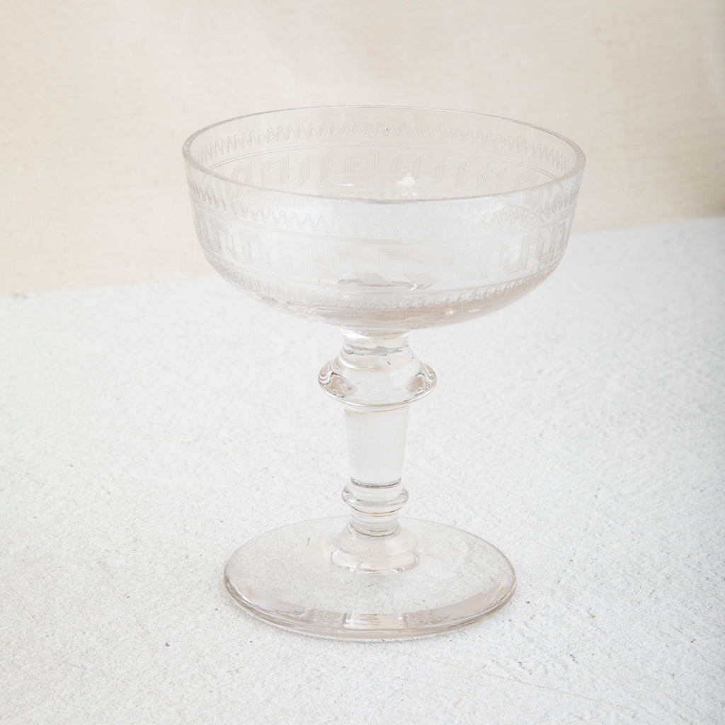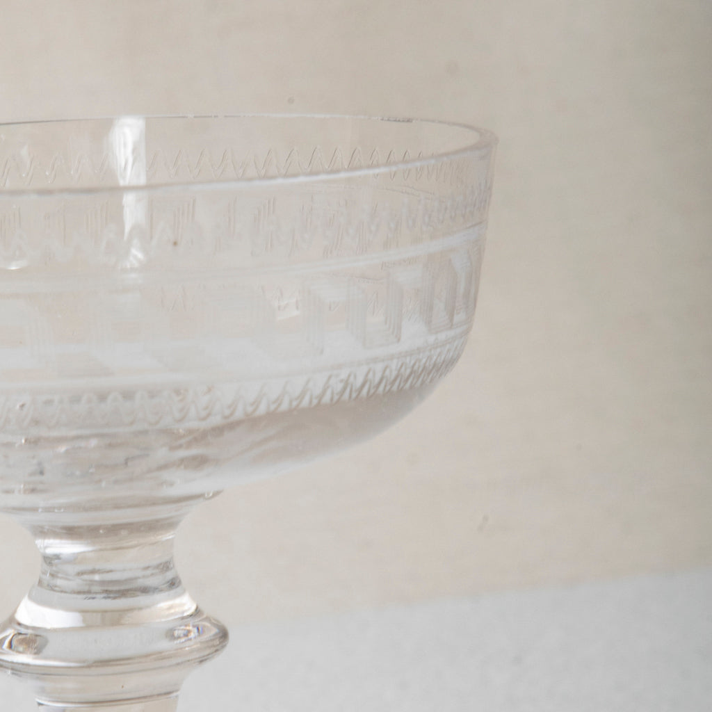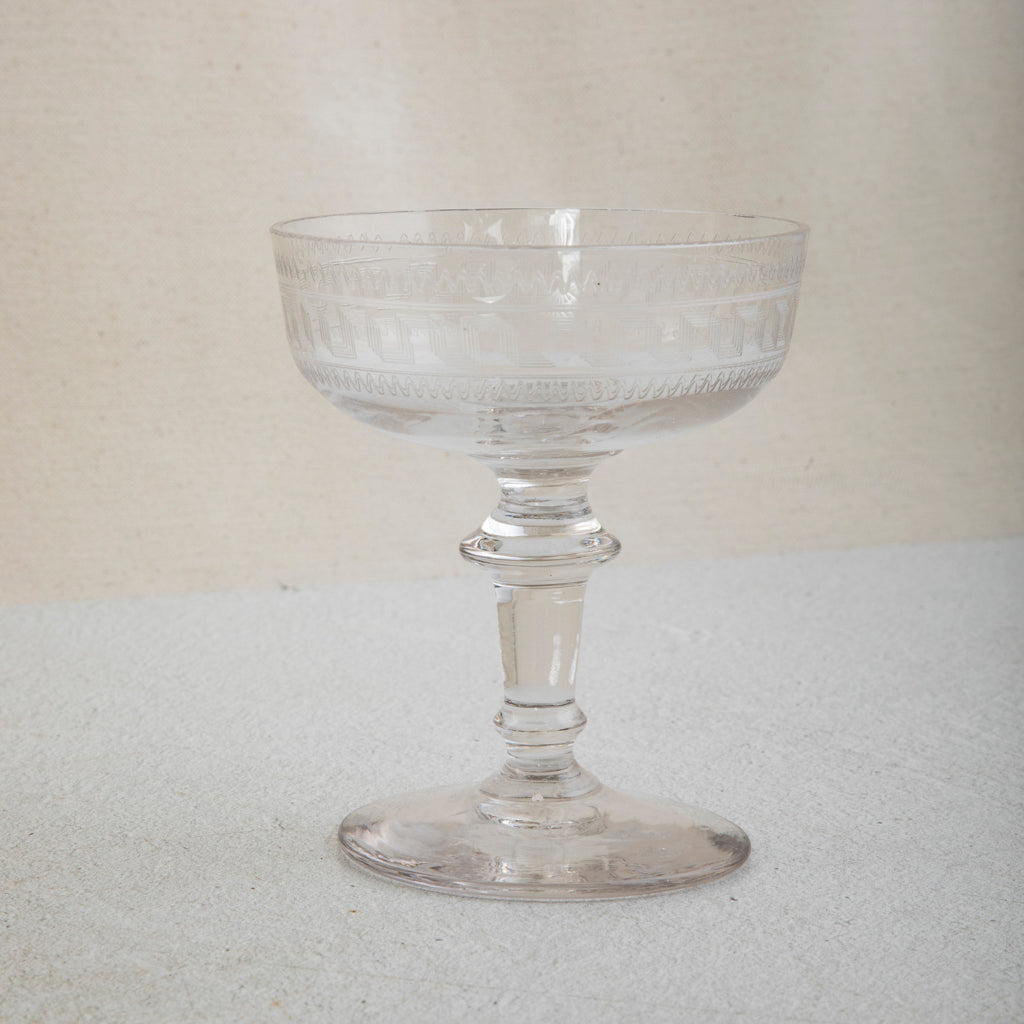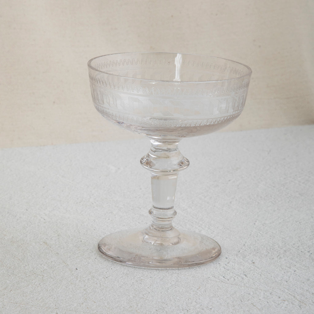 Set of six Baccarat crystal champagne coupes with etched geometric motif. c. 1920. 4.25" H X 3.5" Diameter