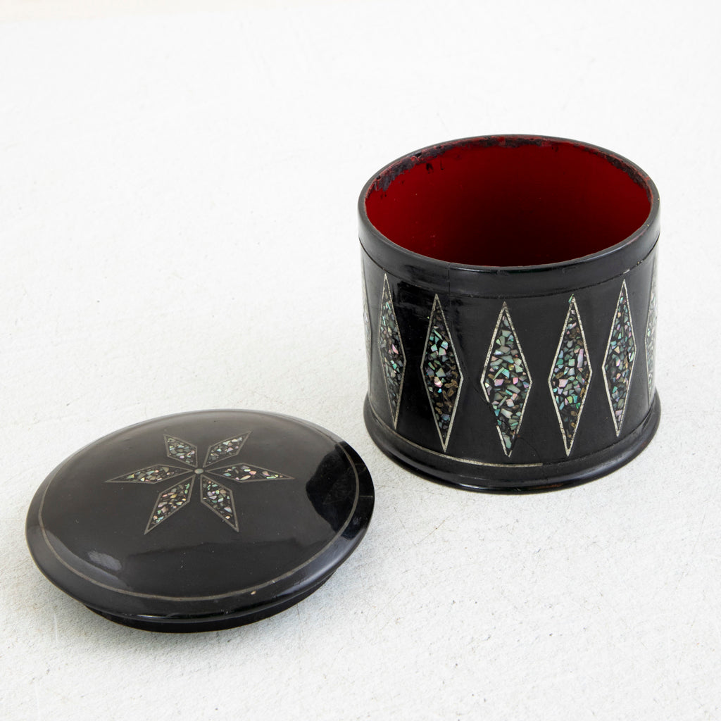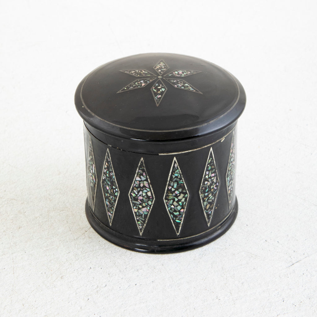 Napoleon III period papier mache powder box with mother of pearl inlay, c. 1860. 3" H X 3.5" Diameter