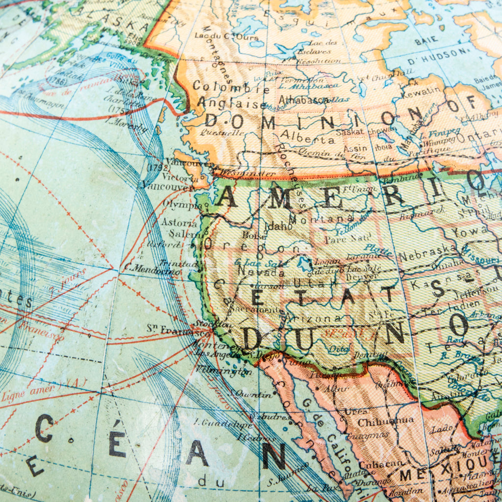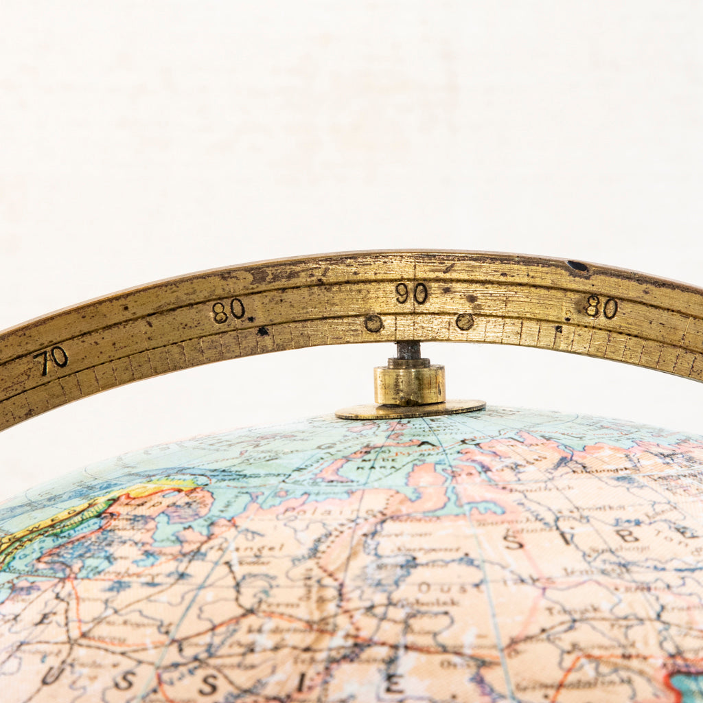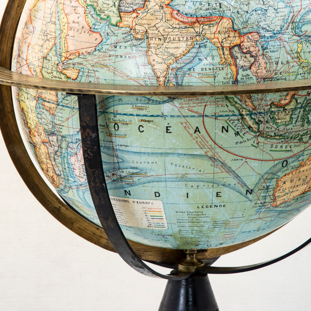 Large Napoleon III period terrestrial globe on ebonized wooden base with bronze armature, c. 1860. Edited by the French cartographer, J. Forest. 24" H X 16" Diameter