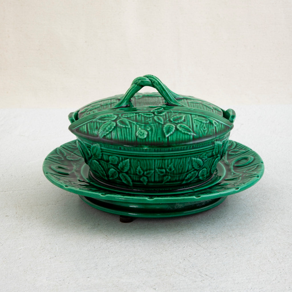 Twentieth century green Majolica dish with lid. Originally used for butter. 3.5" H X 7.5" Diameter