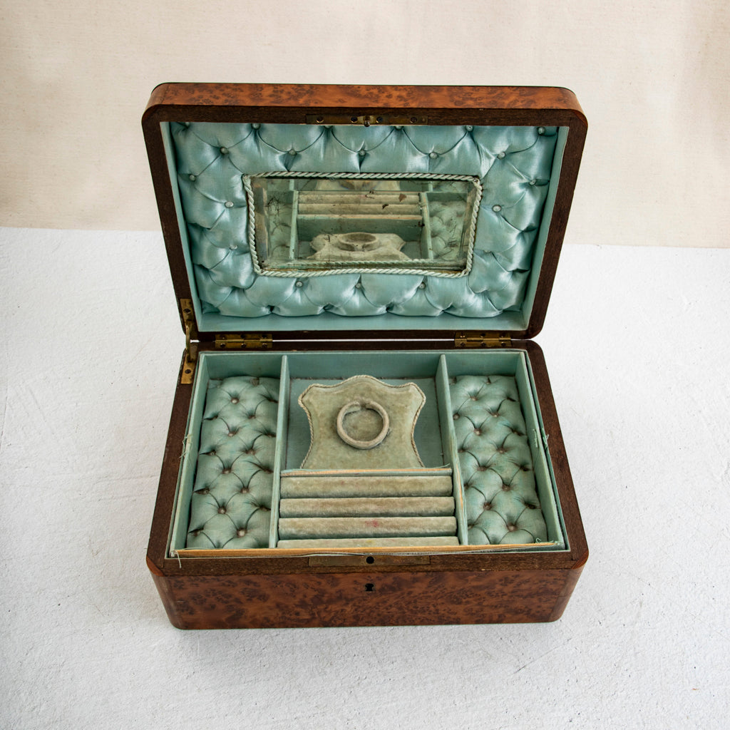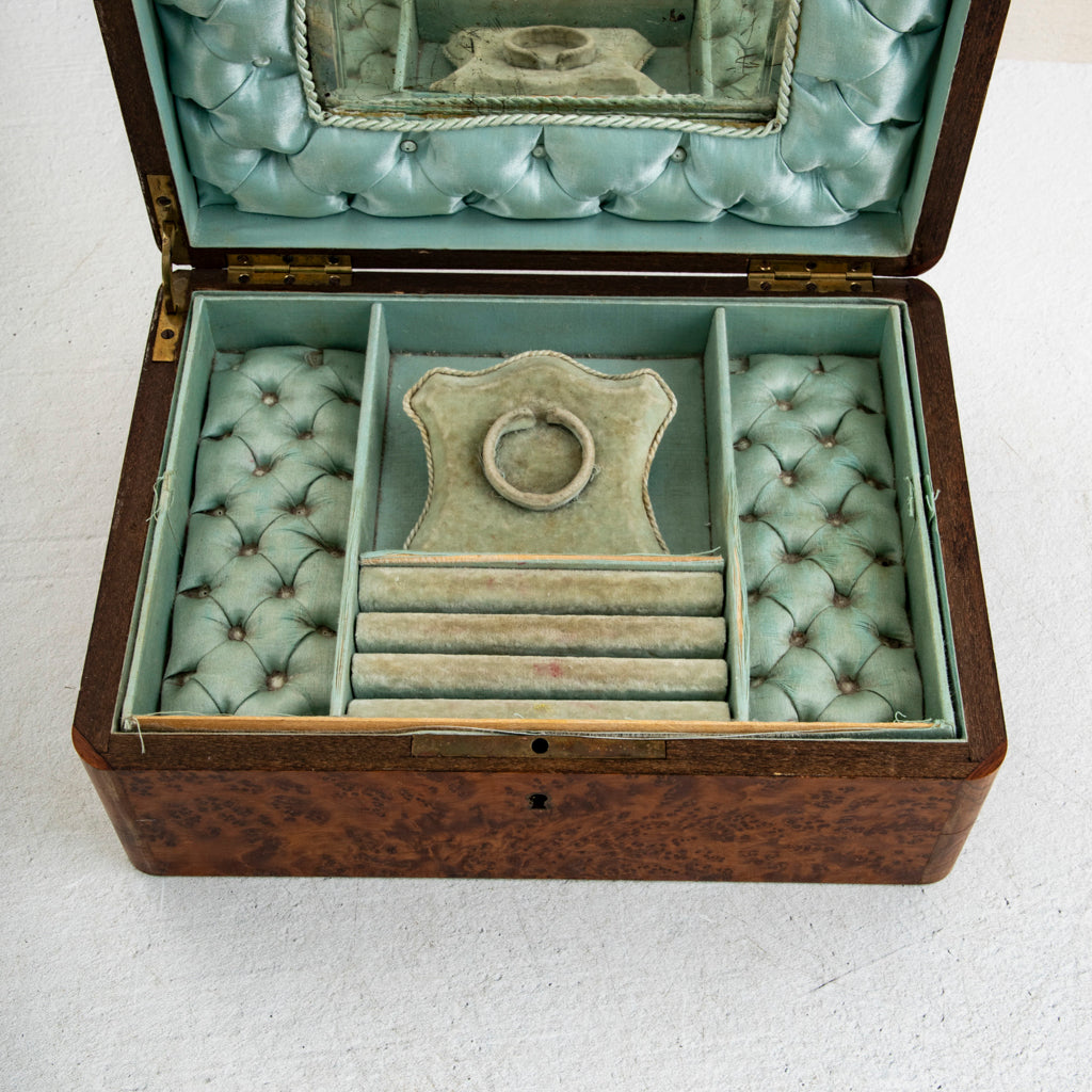 Napoleon III period marquetry jewelry box, c. 1860. Tufted divided interior with lift out tray for jewelry pieces and mirror in the lid. Rosewood, thuya wood, and ebonized pearwood with...