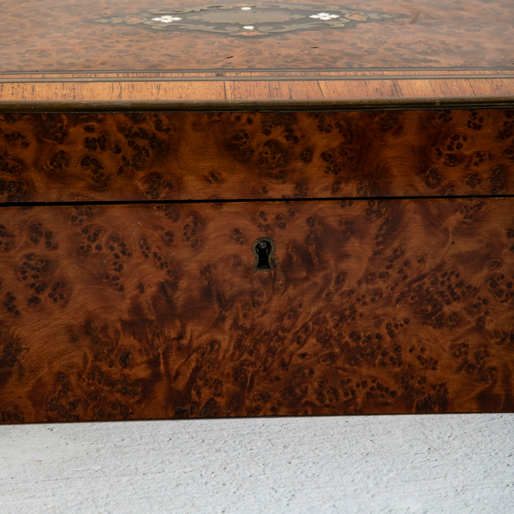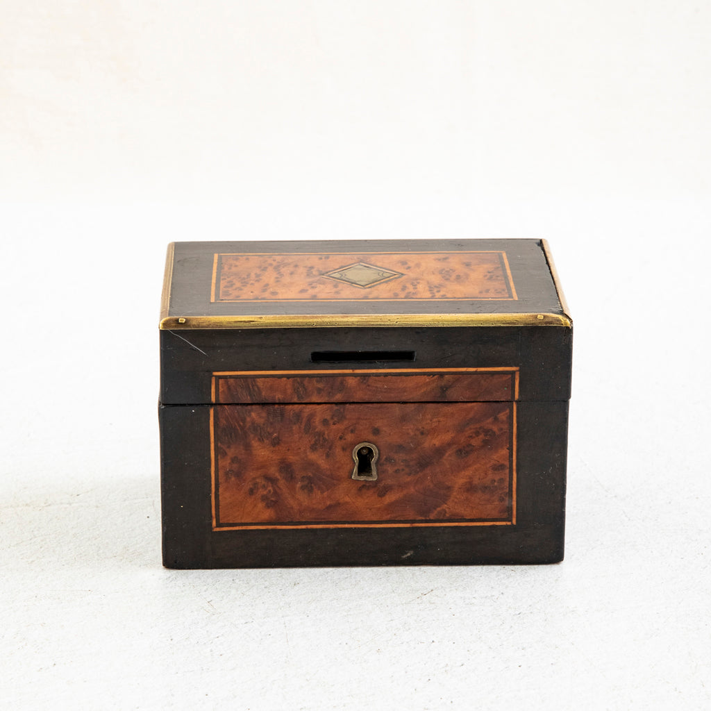 Nineteenth century Napoleon III marquetry coin bank box. Slot on the front was to drop coins in, and box locks with its original key. Thuya wood, ebonized pearwood, lemonwood, and...