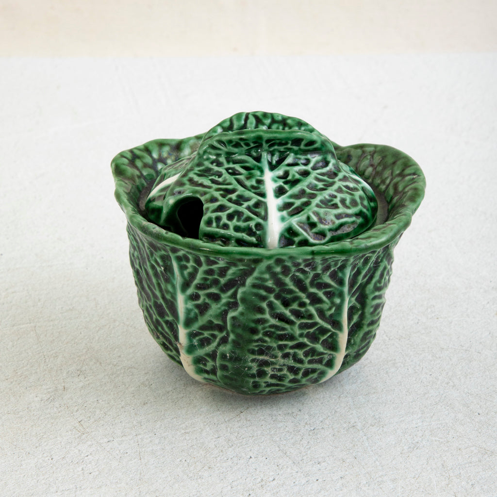 Majolica dish with lid in the shape of a cabbage. 4" H X 4.5" Diameter