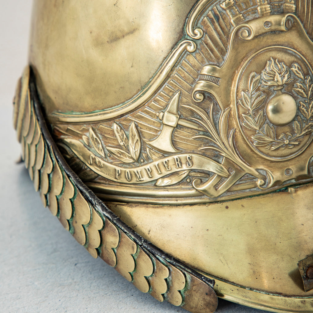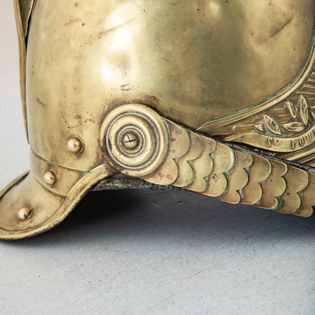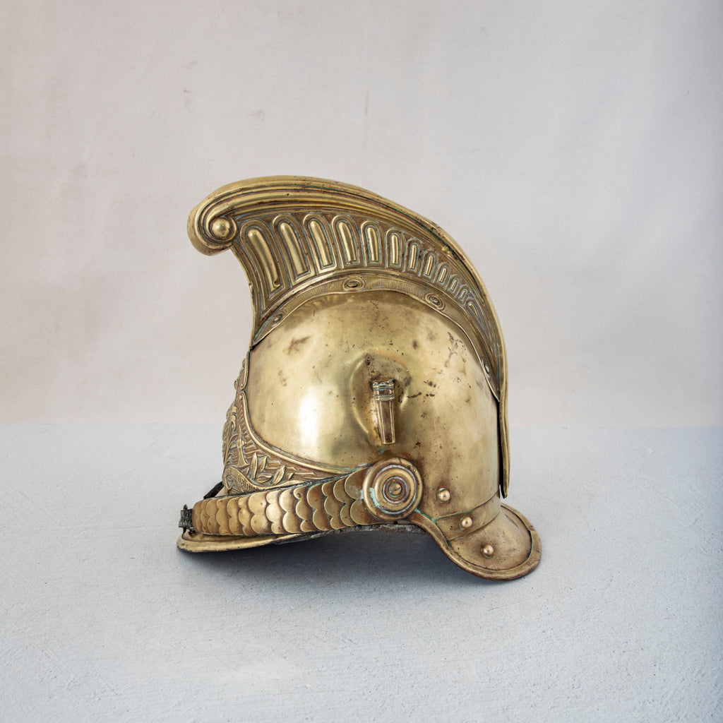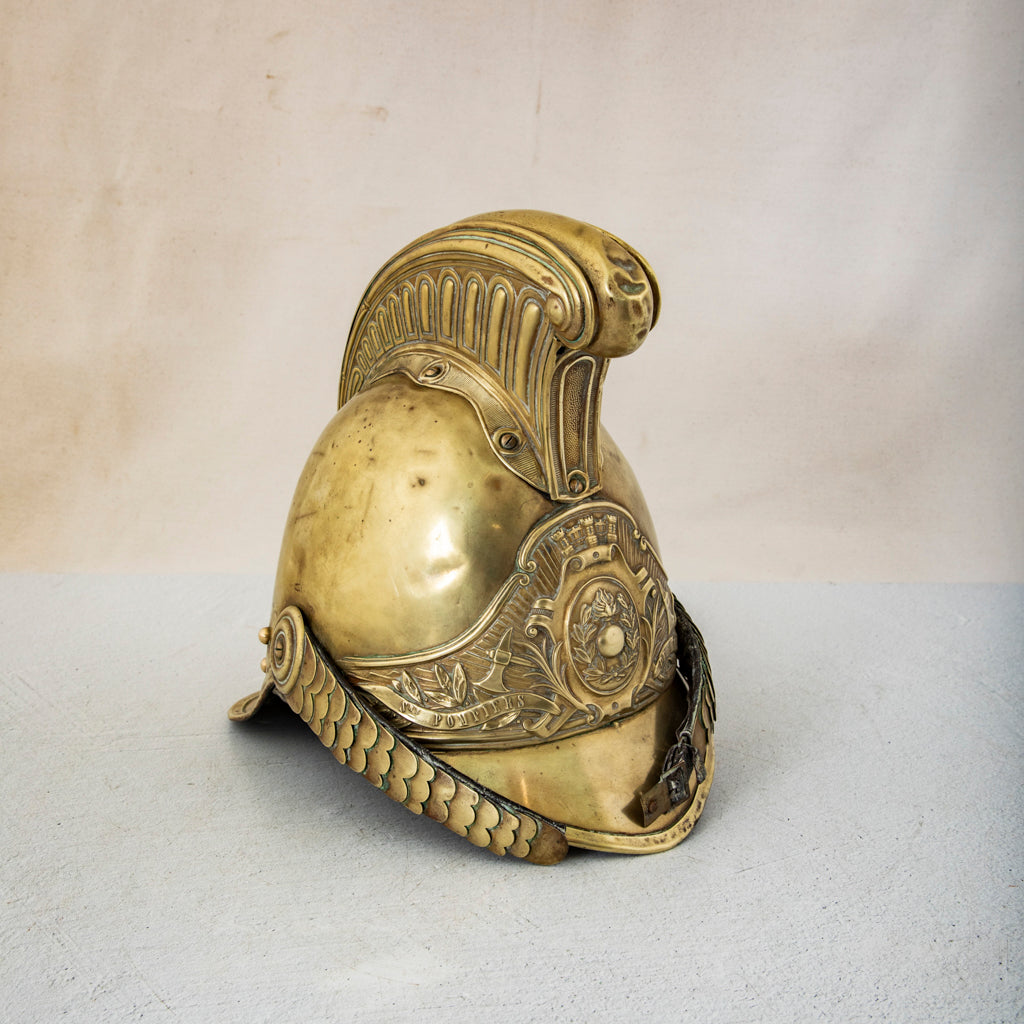 Nineteenth century crested brass fireman's helmet shaped like a Roman soldier's helmet, c. 1880. Marked Sapeurs Pompiers de Merrey. Includes original brass chinstrap and leather liner. 10" H X...