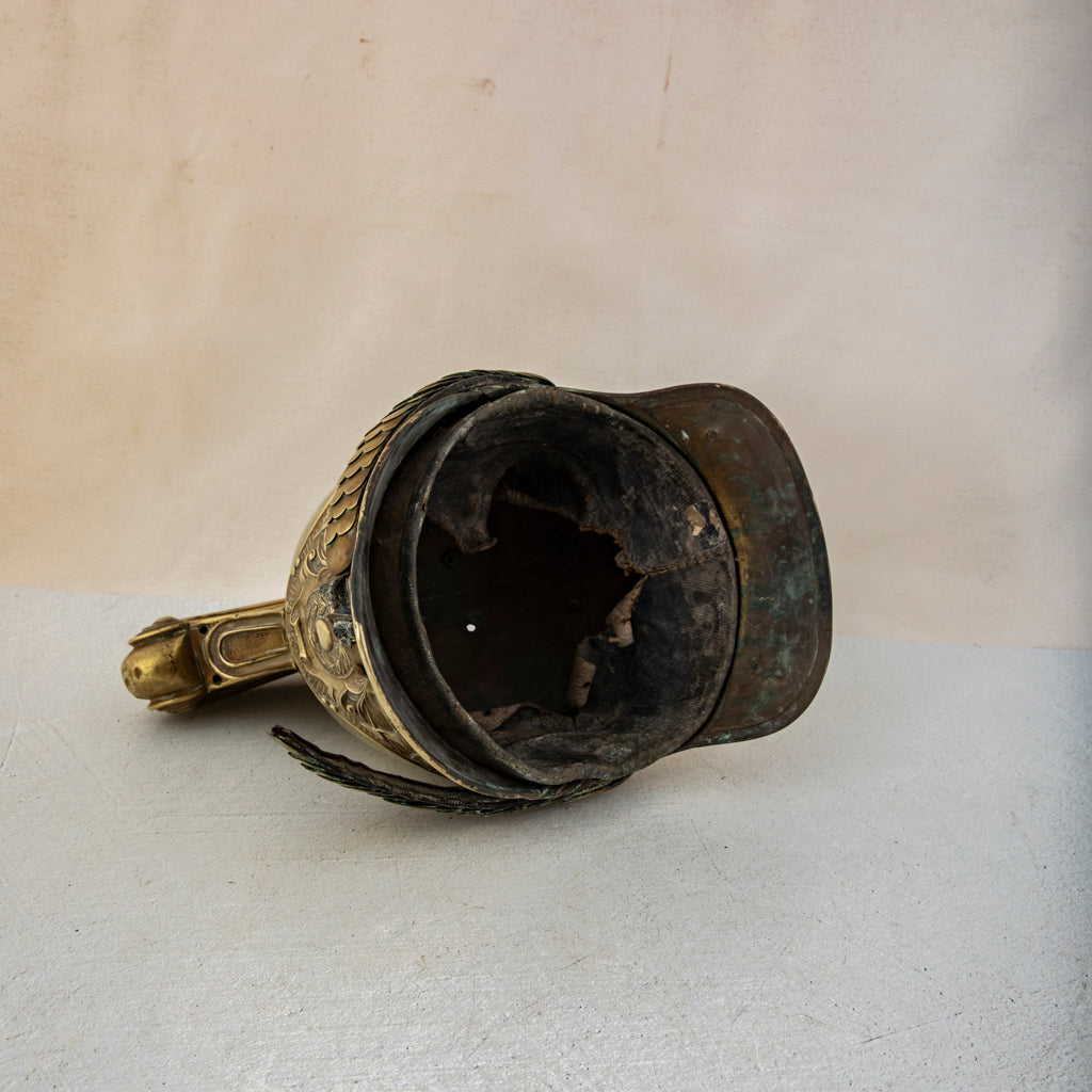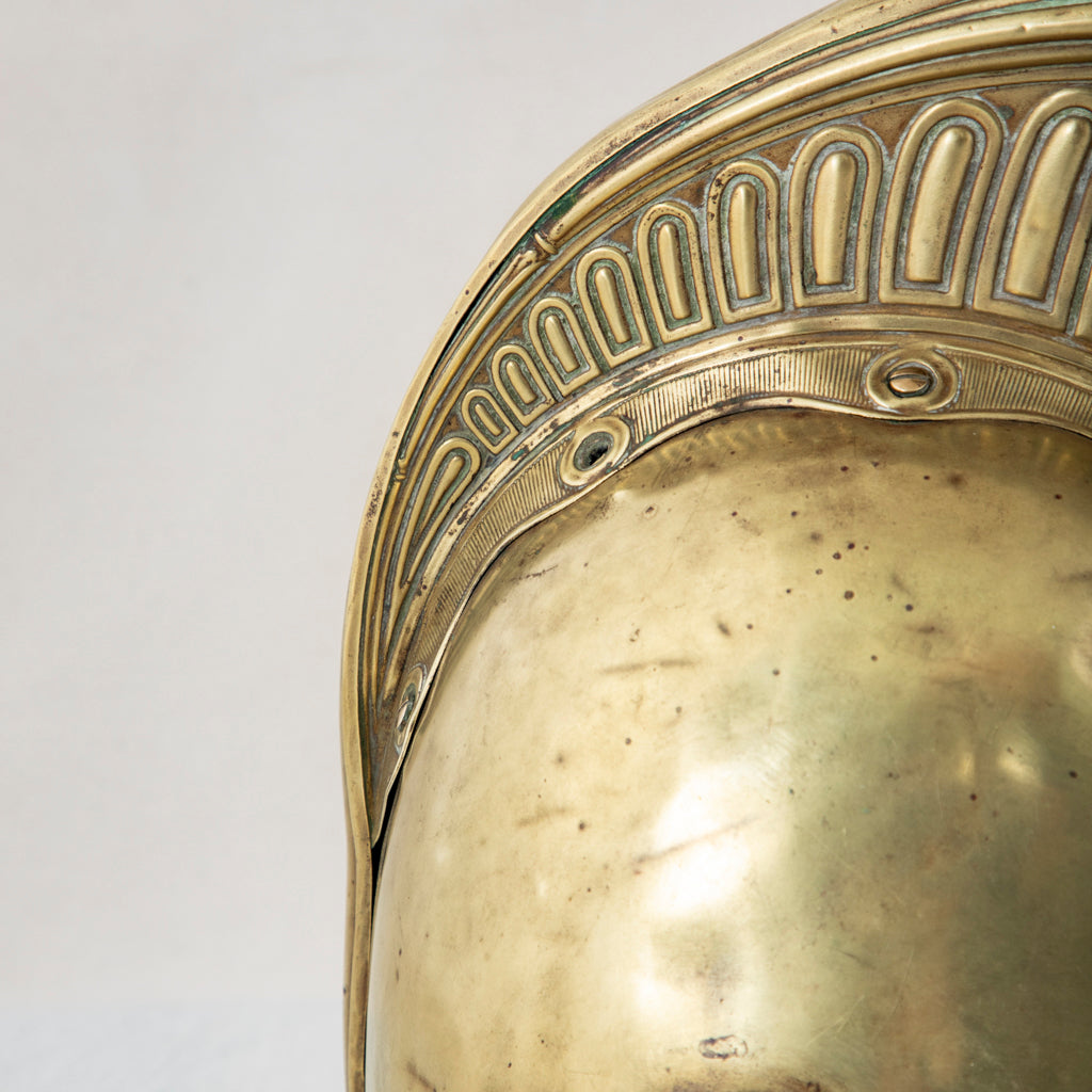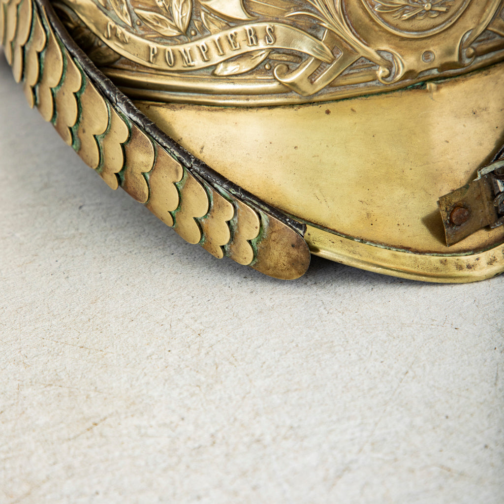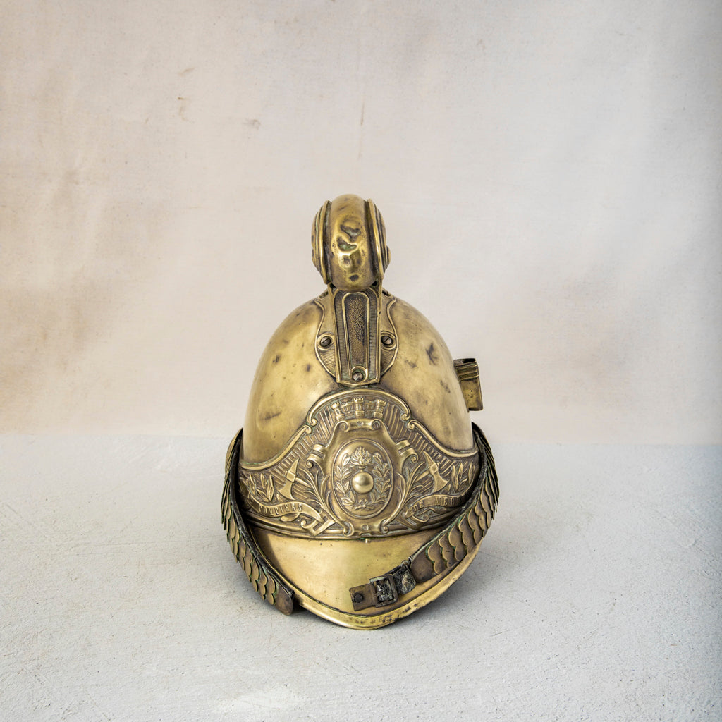Nineteenth century crested brass fireman's helmet shaped like a Roman soldier's helmet, c. 1880. Marked Sapeurs Pompiers de Merrey. Includes original brass chinstrap and leather liner. 10" H X...