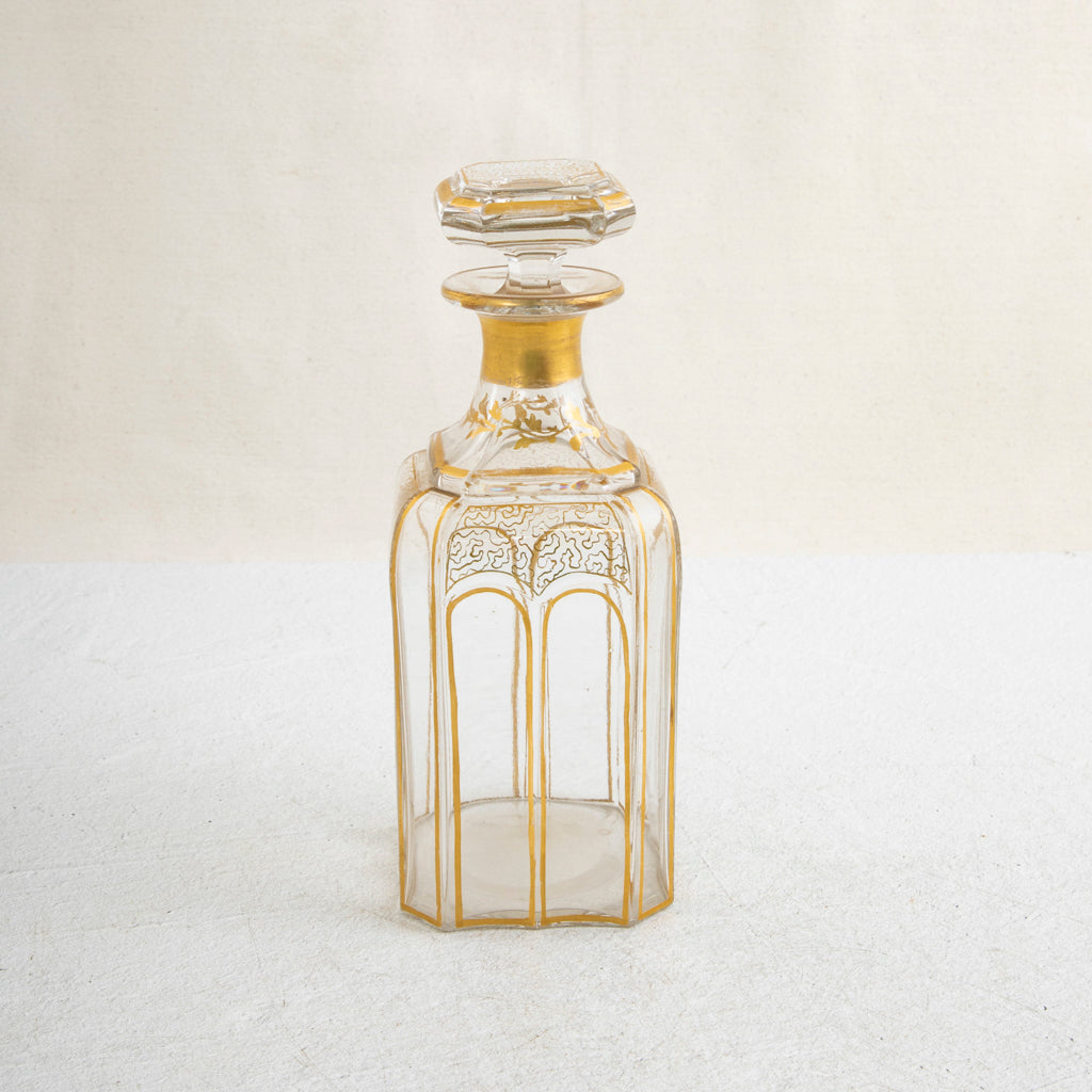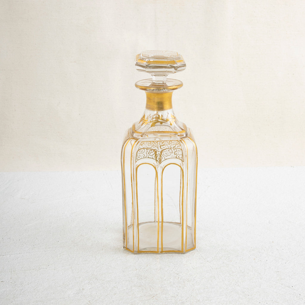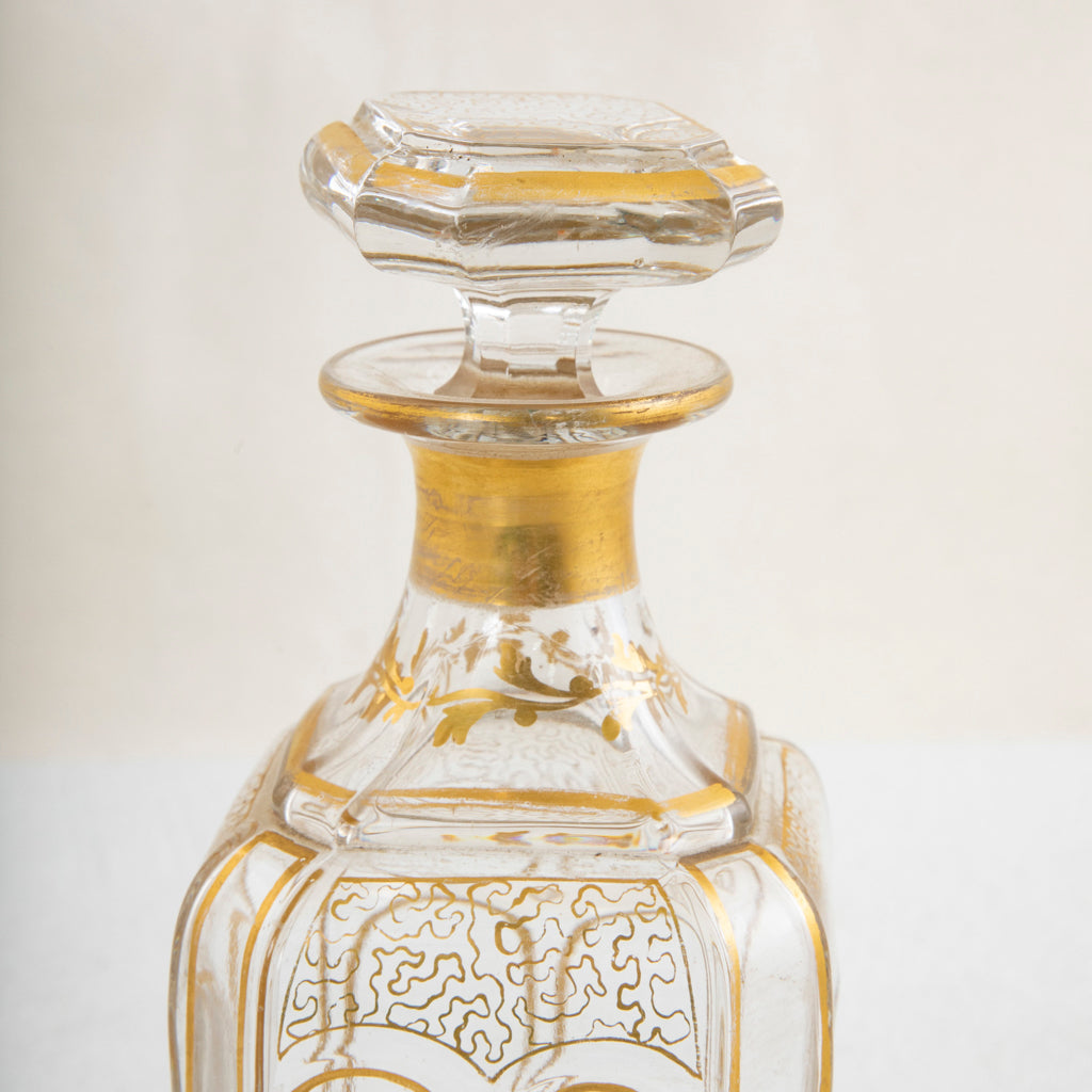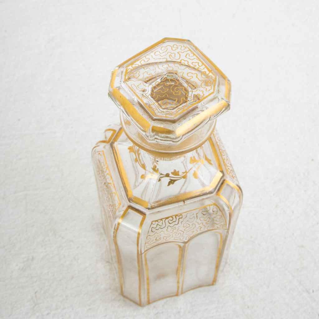 Nineteenth century crystal carafe with stopper and hand painted gold details. 8" H X 3" Square
