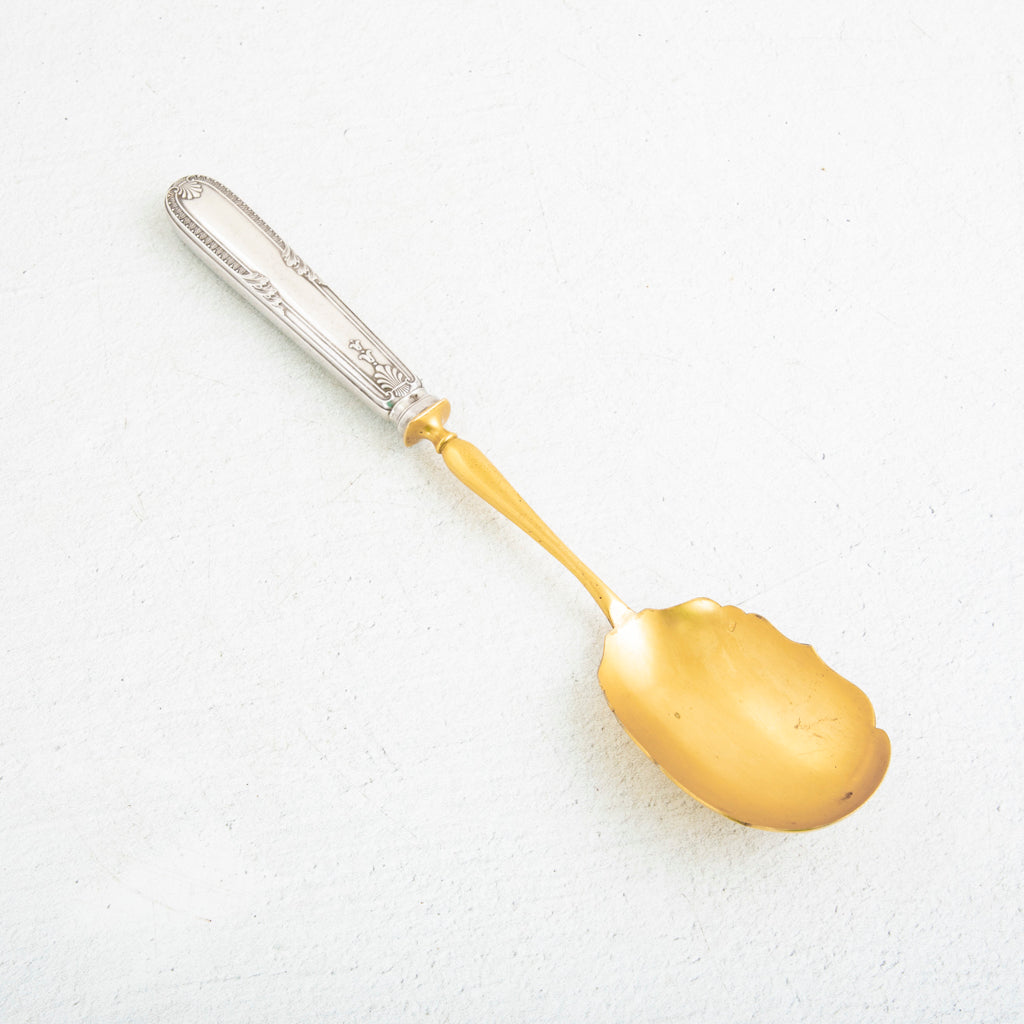 Late nineteenth century gold vermeil serving spoon with sterling silver handle. Hallmark is Head of Minerva. 10.75" L