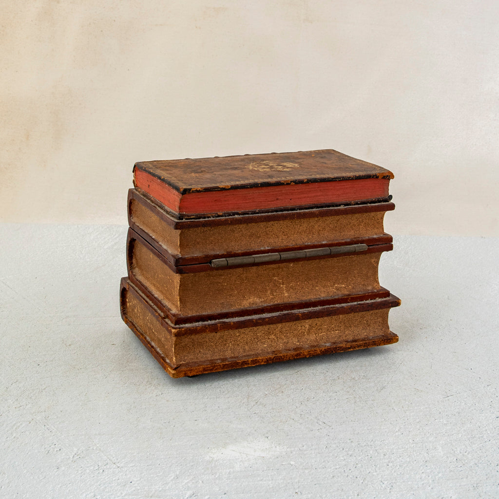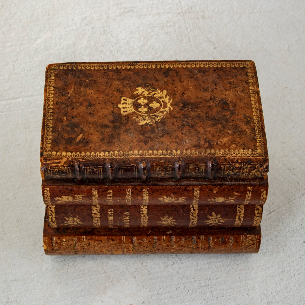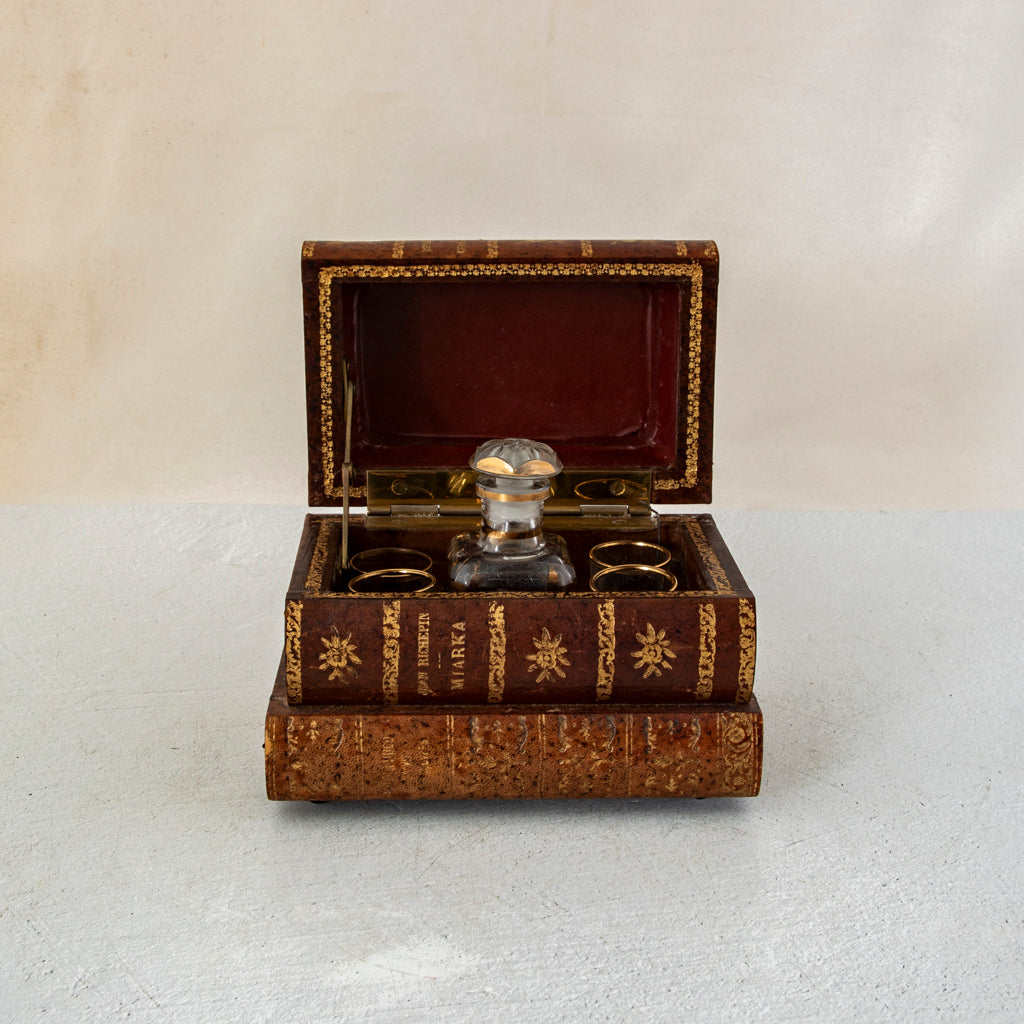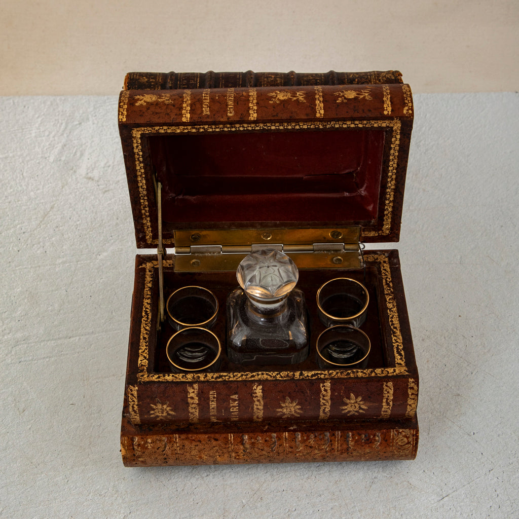 Antique leather book box with concealed glass liqueur service. Two carafes, two stoppers and five glasses. 5.5" H X 7" W X 5" D Box 2" H glasses