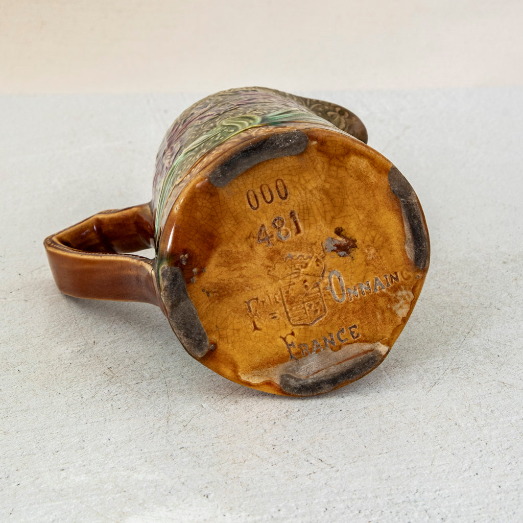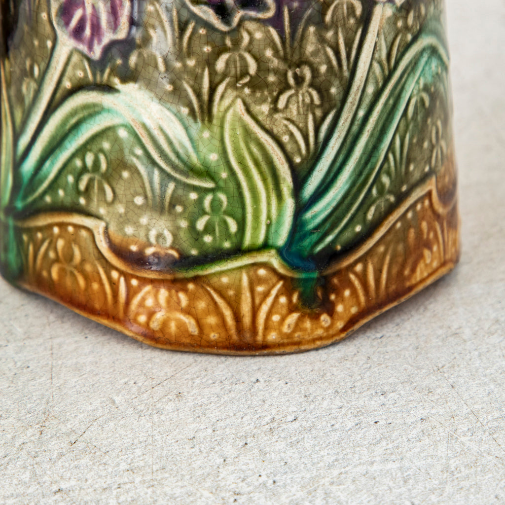 Nineteenth century Majolica pitcher with irises. 5.5" H X 3.5" Diameter 5.5" L with handle