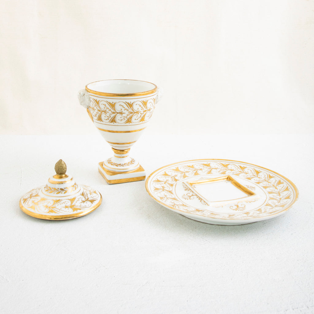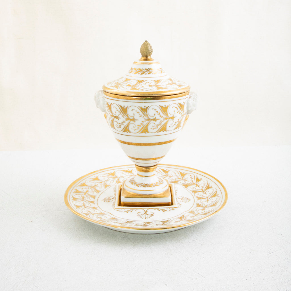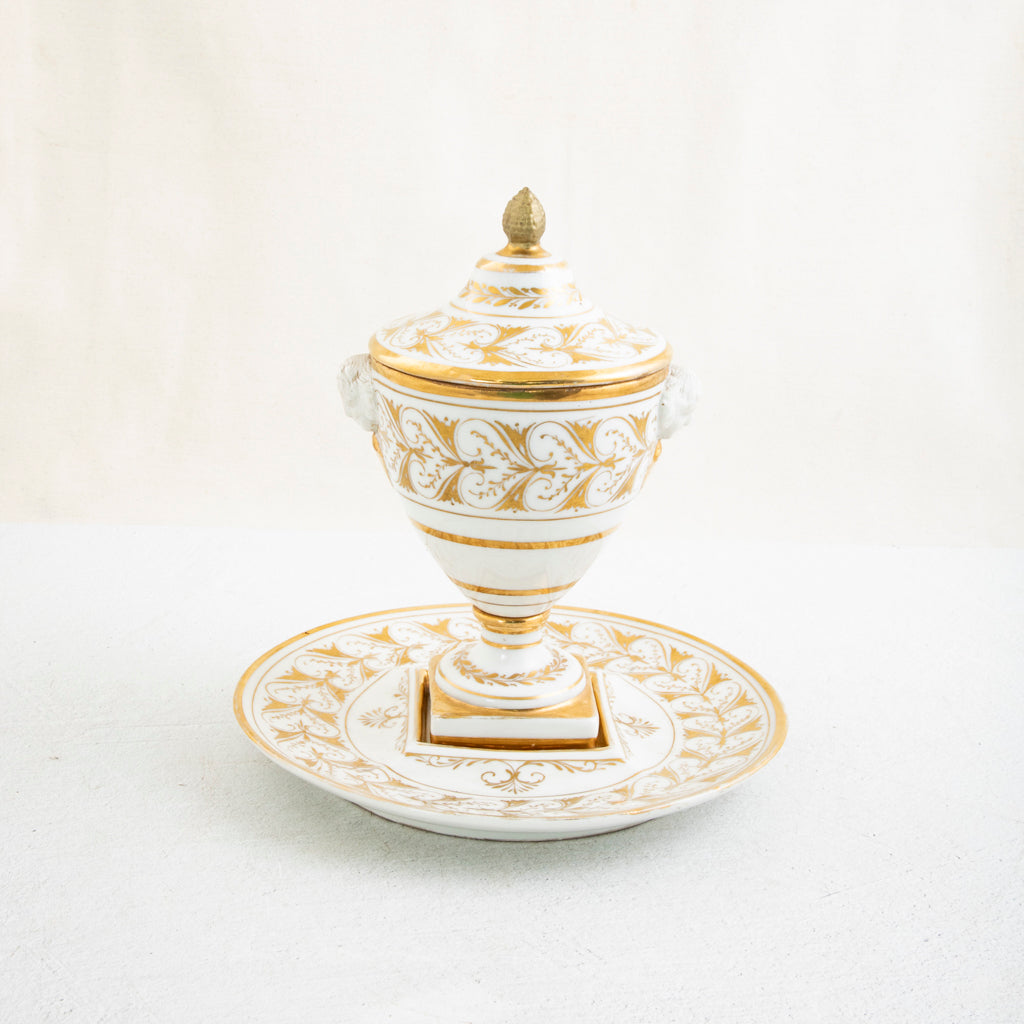 Nineteenth century Old Paris porcelain urn with lid and accompanying plate, with hand painted gold detailing. 10" H X 9" Diameter