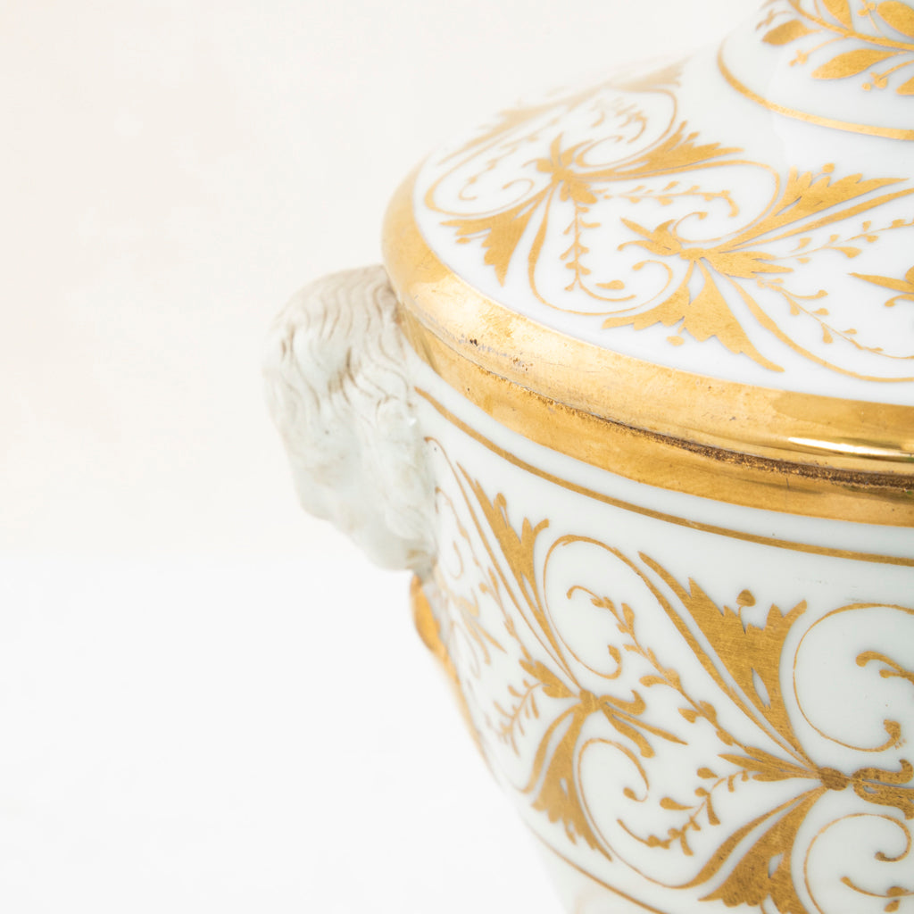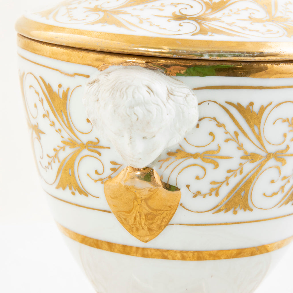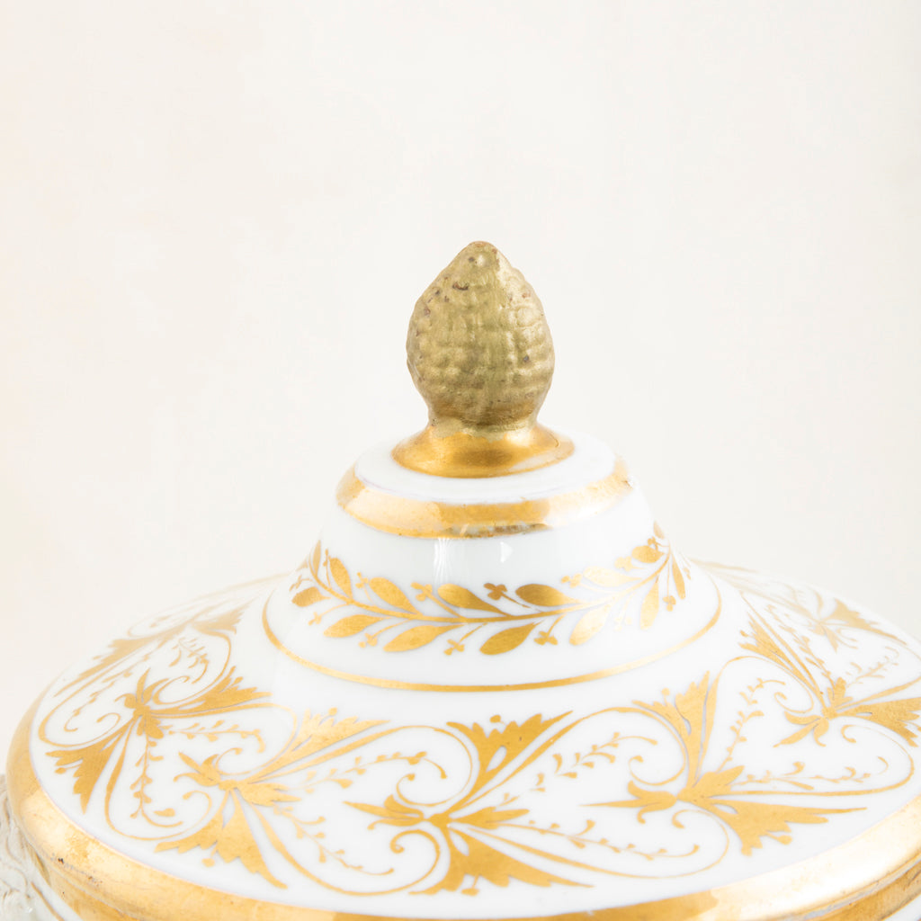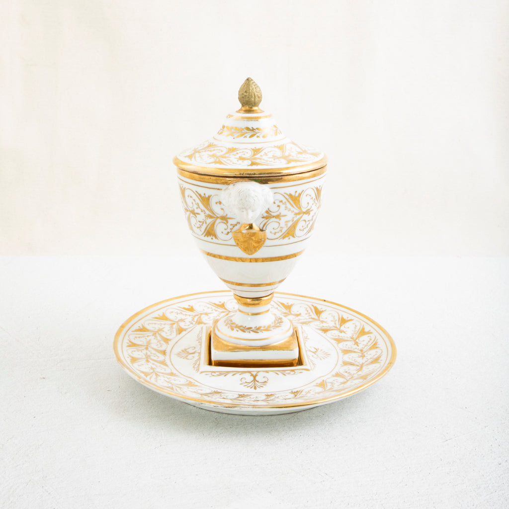 Nineteenth century Old Paris porcelain urn with lid and accompanying plate, with hand painted gold detailing. 10" H X 9" Diameter