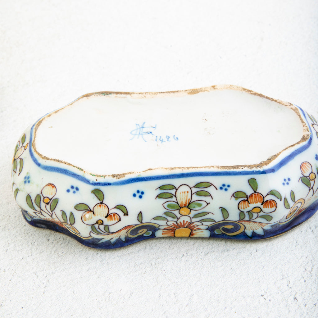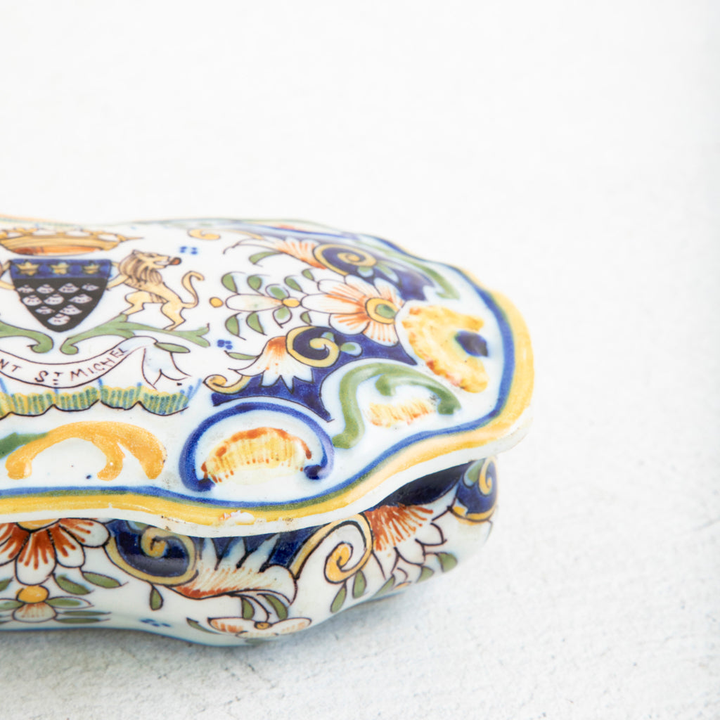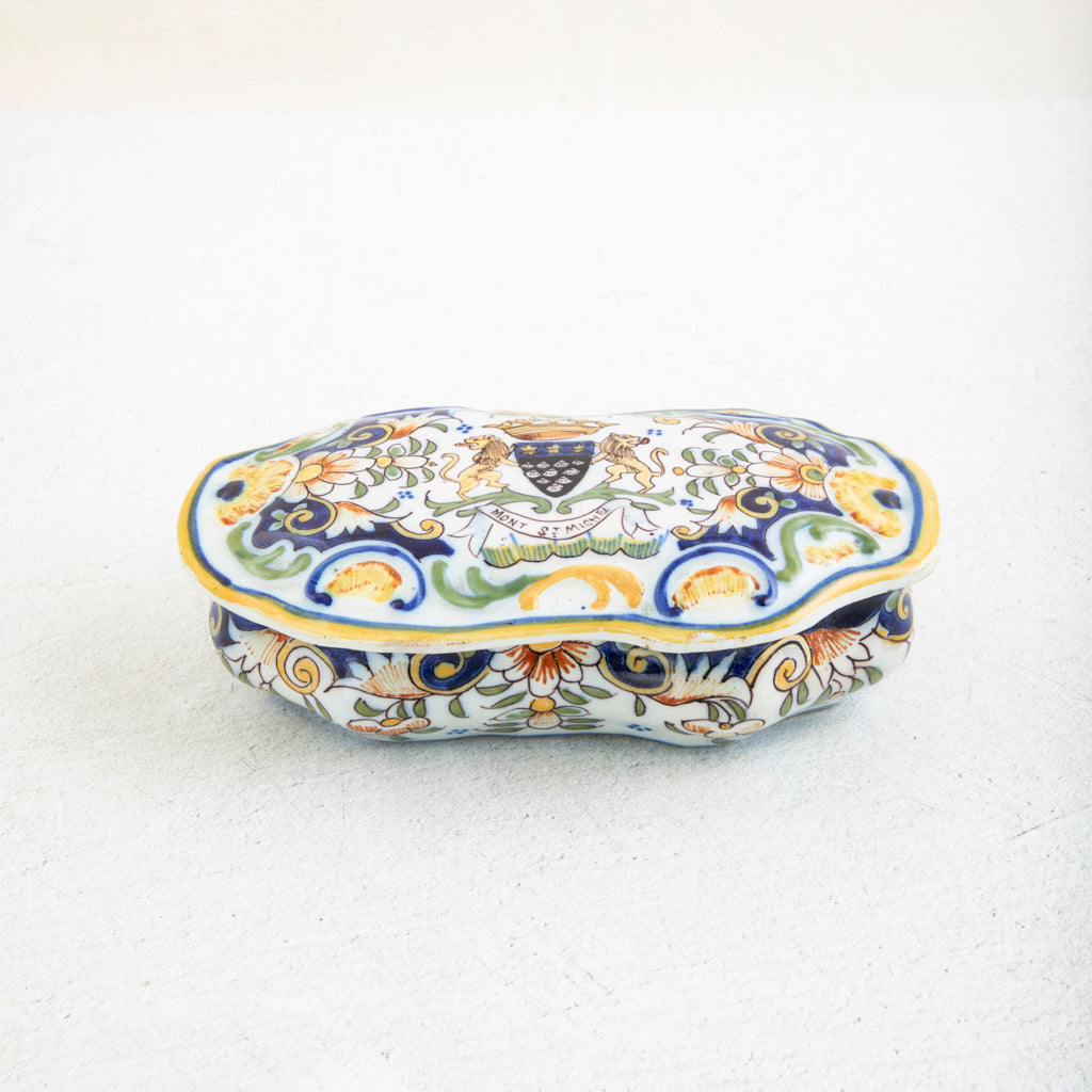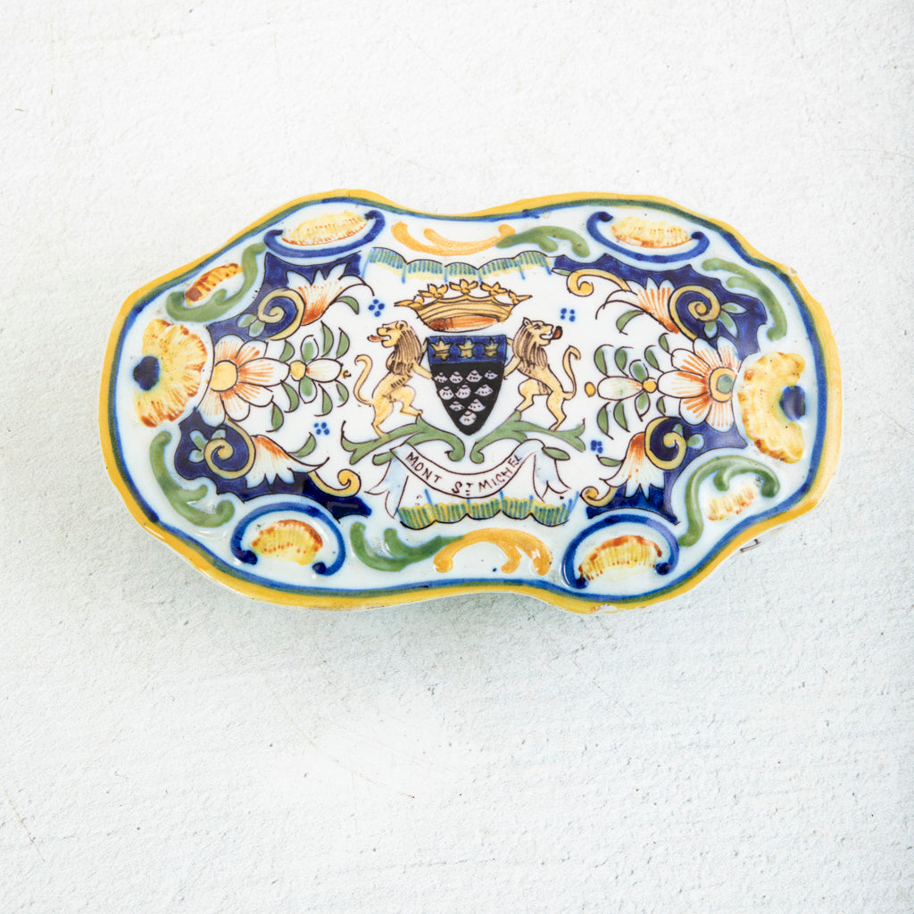Nineteenth century hand painted faience box with lid. Lid detailed with coat of arms, lions, and marked Mont Saint Michel. 2" H X 6.5" W X 4" D ...