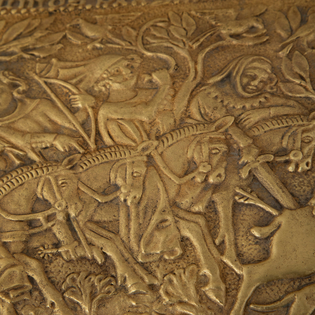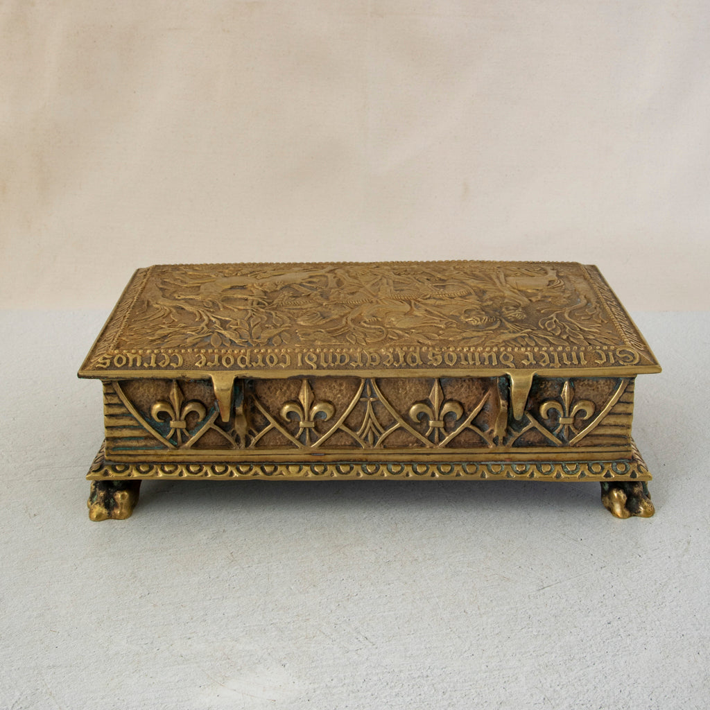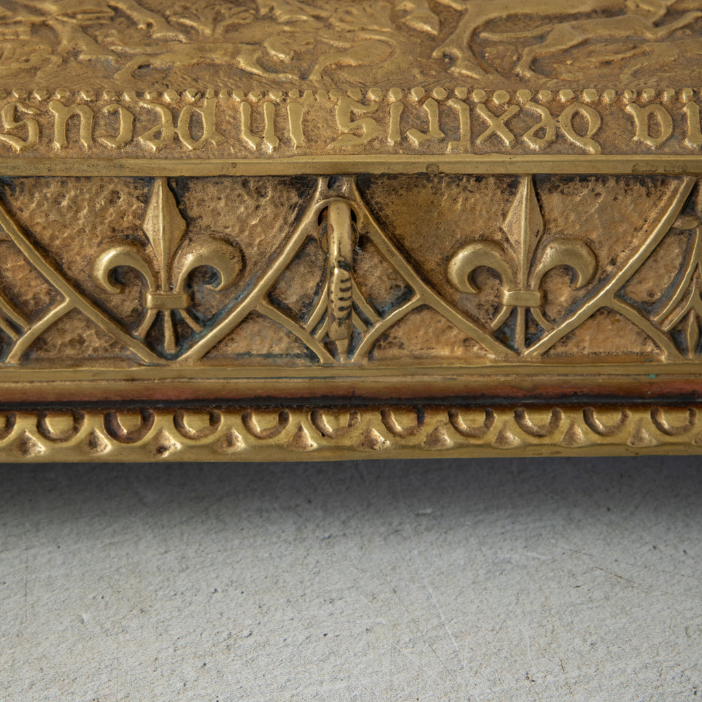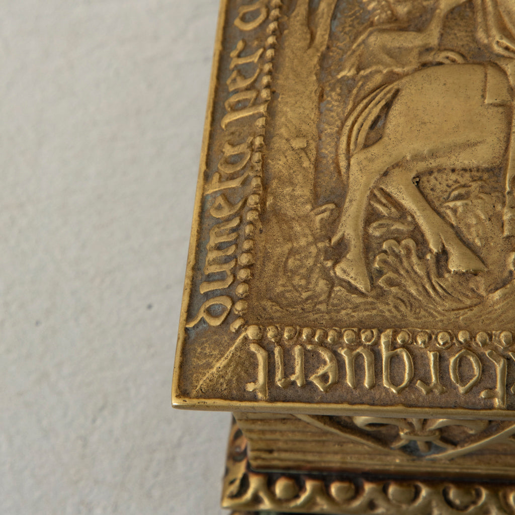 Large Art Deco period bronze box with medieval hunting scene. Signed Max Le Verrier. c. 1940. Includes one key. 12" L X 7.75" W X 3.5" HT