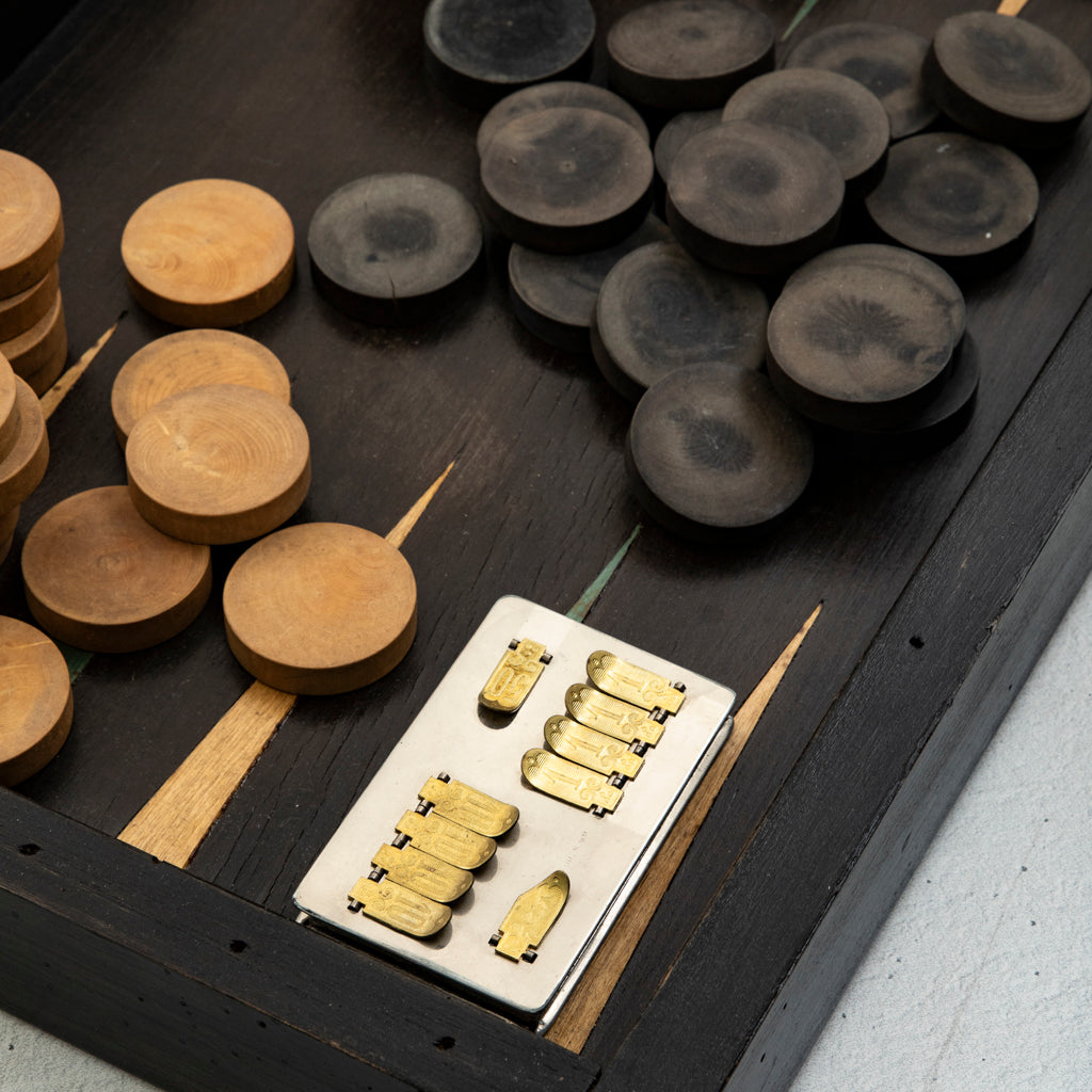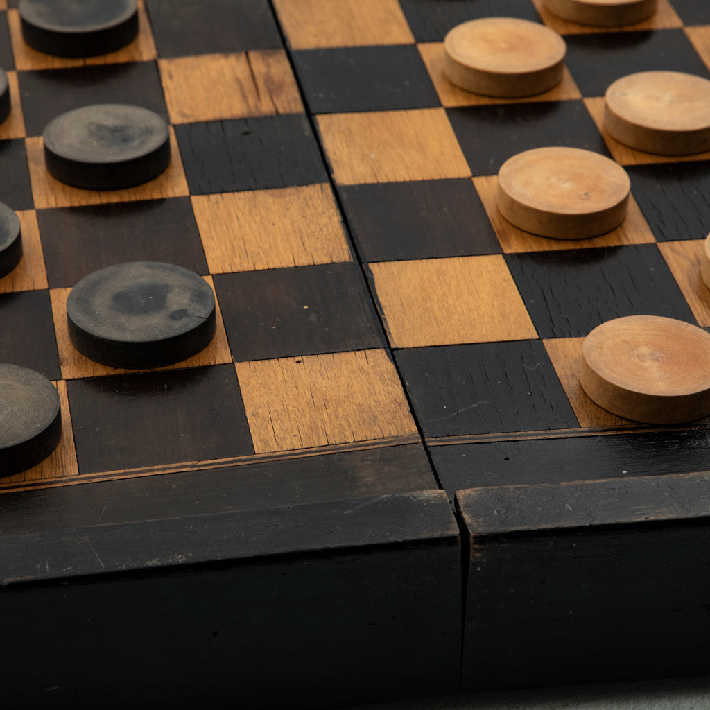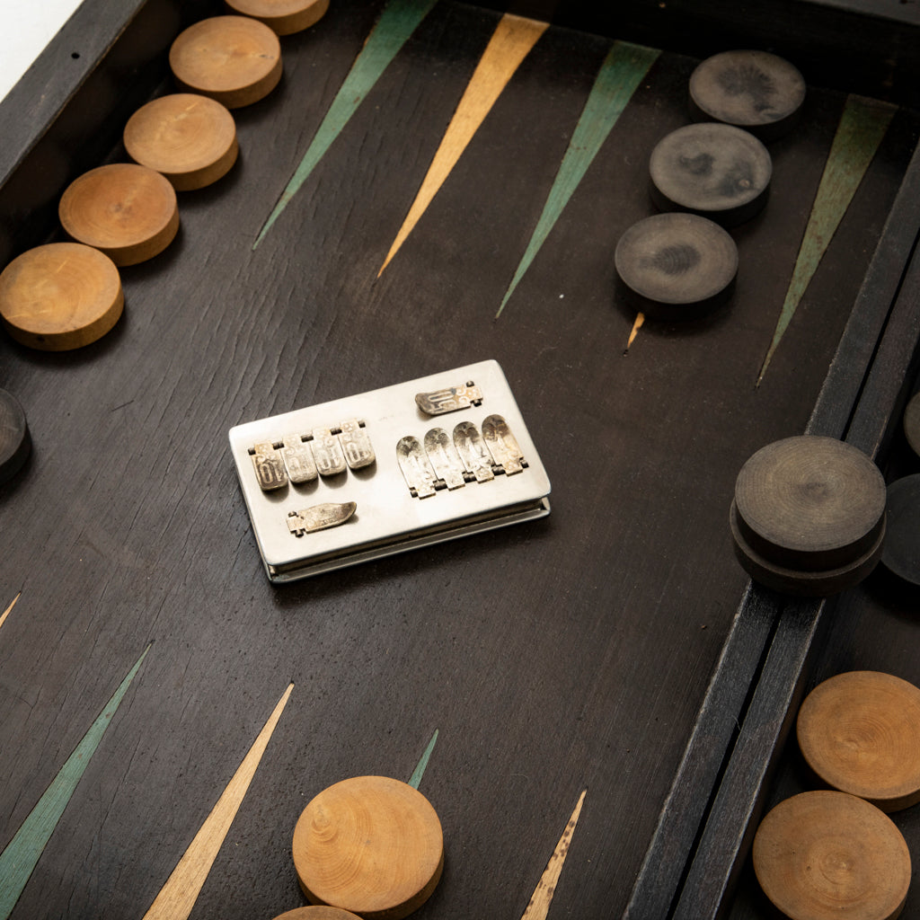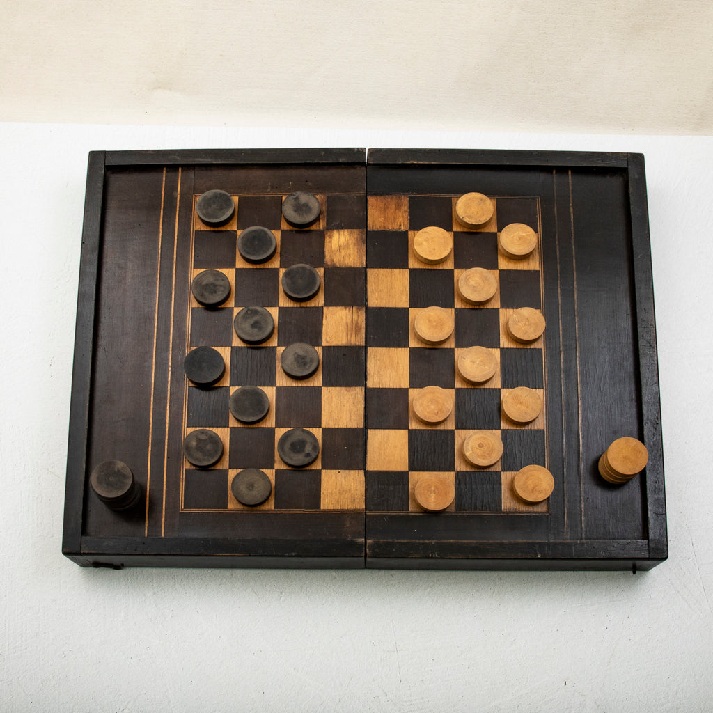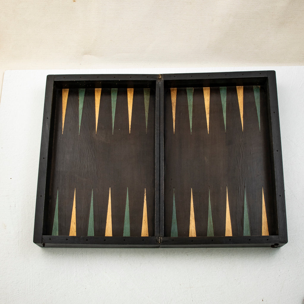 Late nineteenth century marquetry game box for backgammon, checkers, and chess. Backgammon board is on one side and chess/checker board is on the other. Includes 30 game pieces, two shakers,...