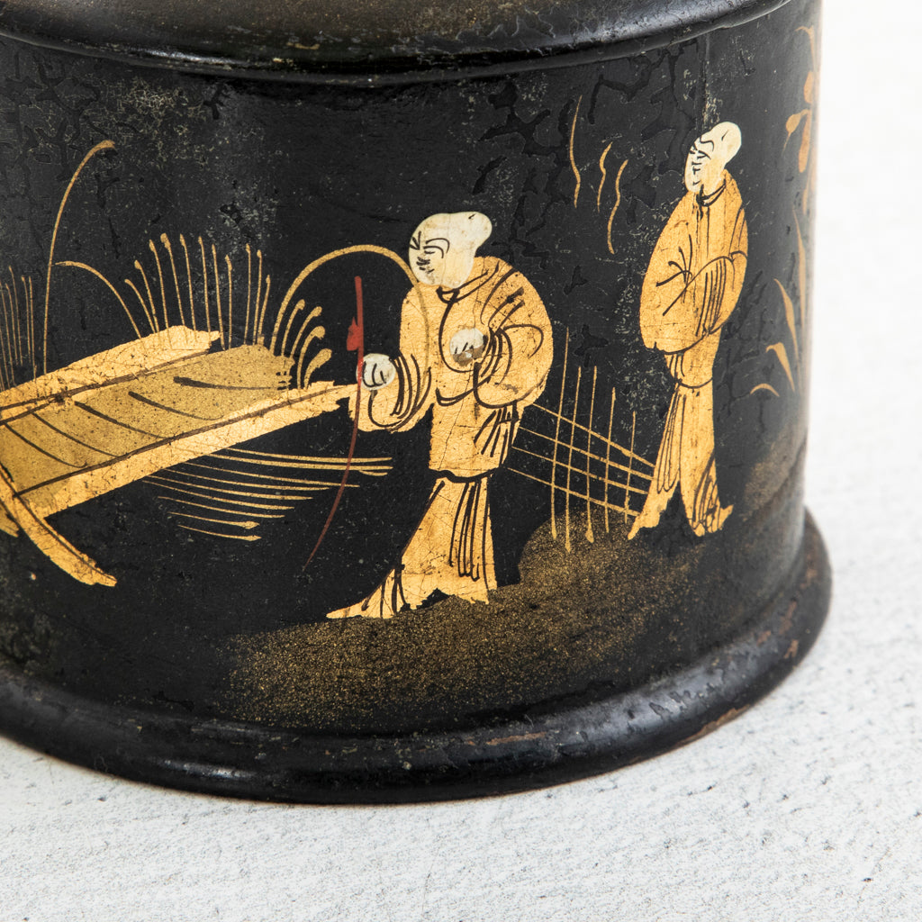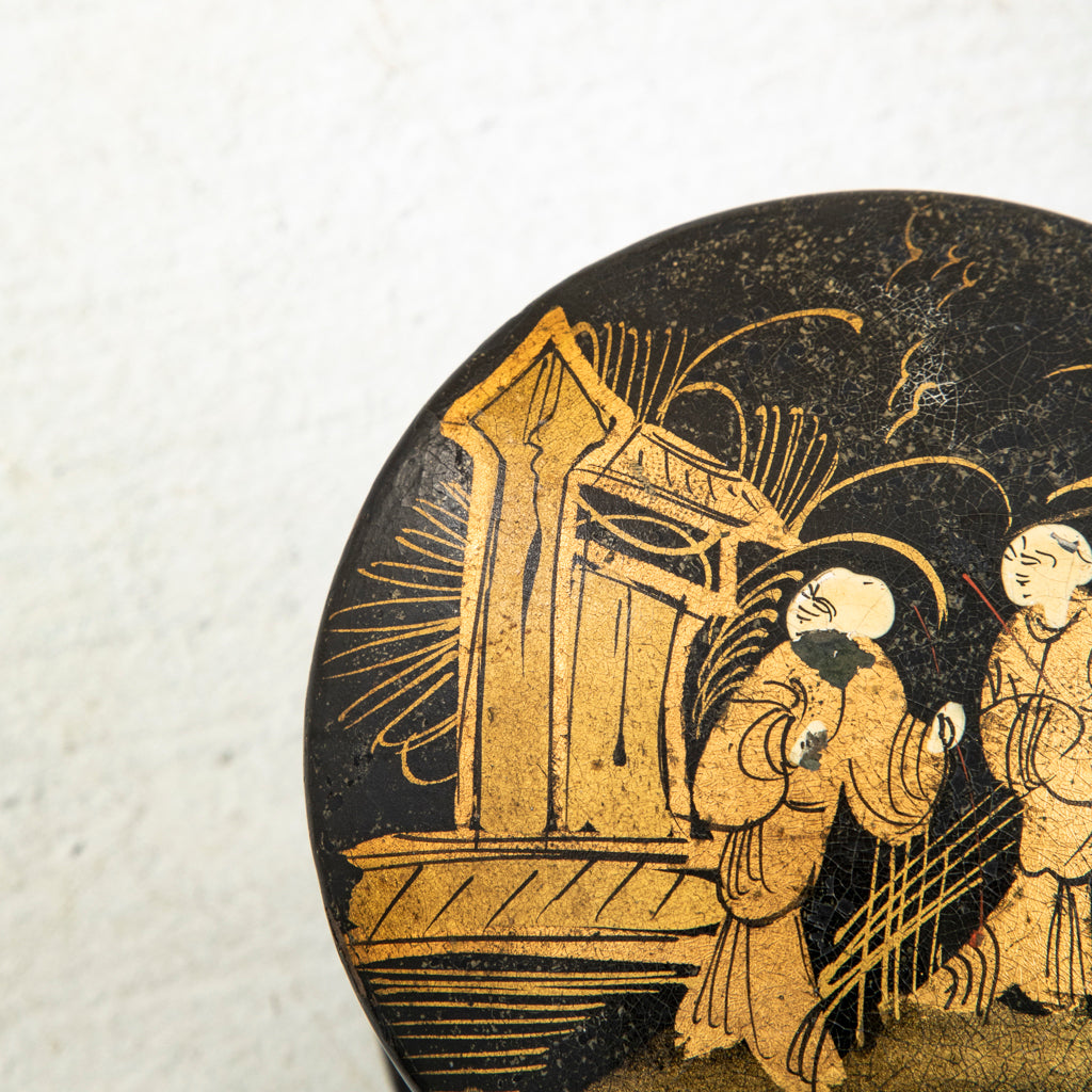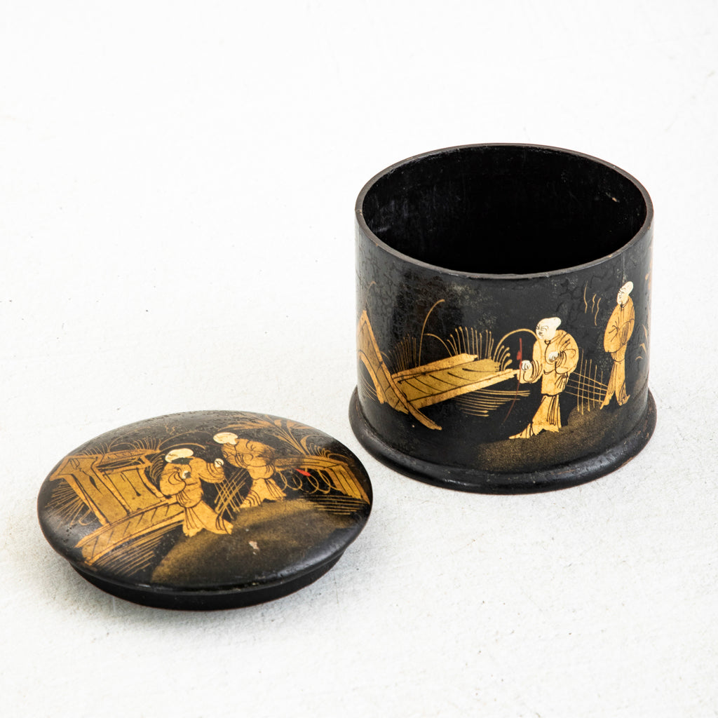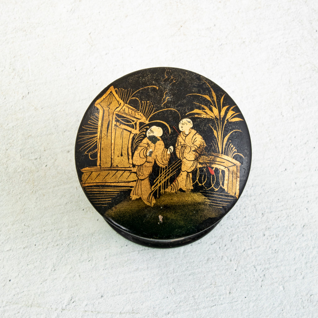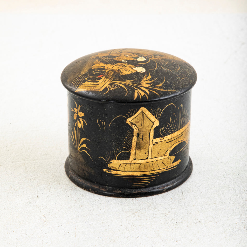 Mid nineteenth century Napoleon III period papier mache chinoiserie box, c. 1860. 3" H X 3.25 " Diameter