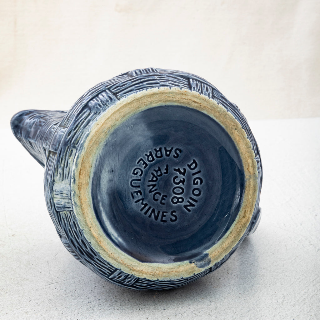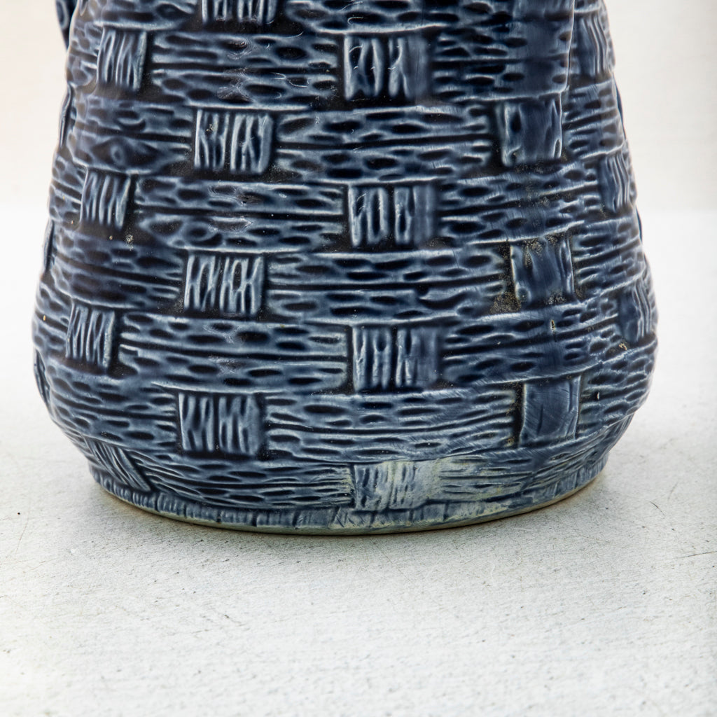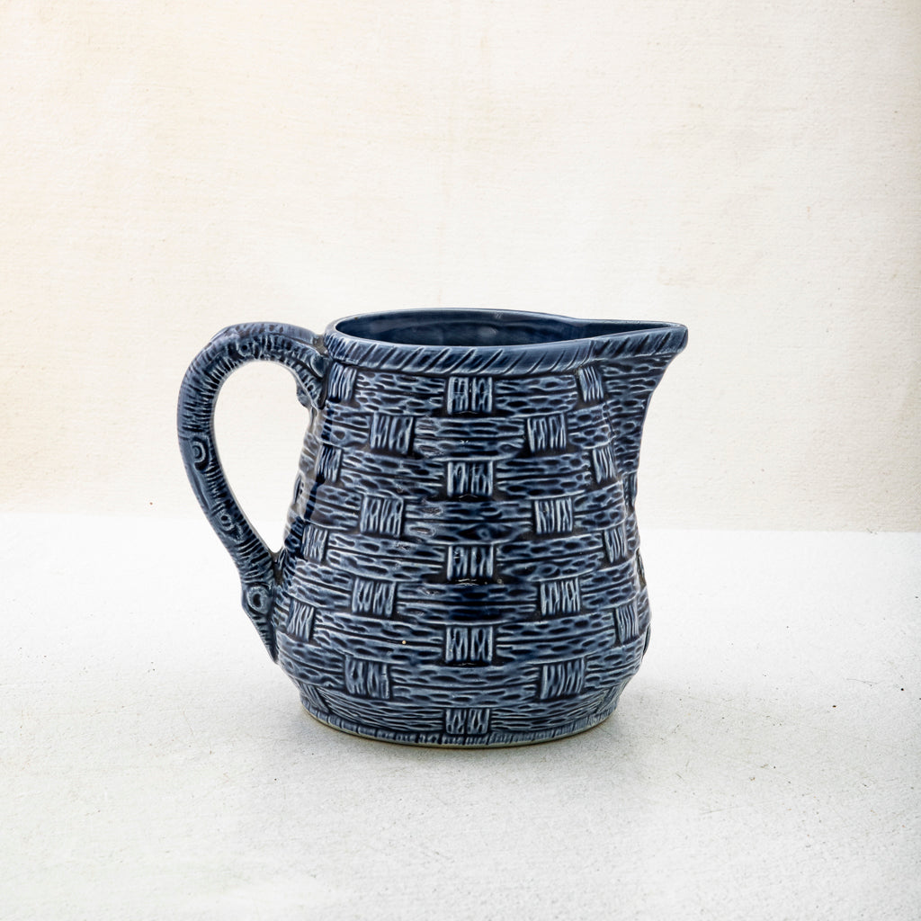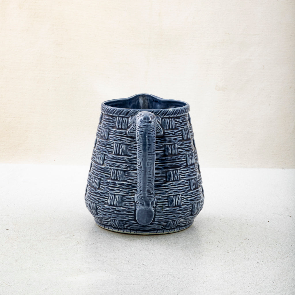 Blue Majolica pitcher with basket weave motif. 5.5" H X 5.5" Diameter 7.5" L with handle