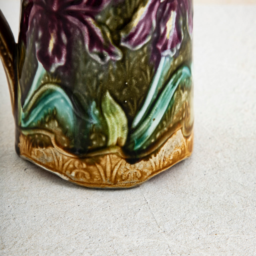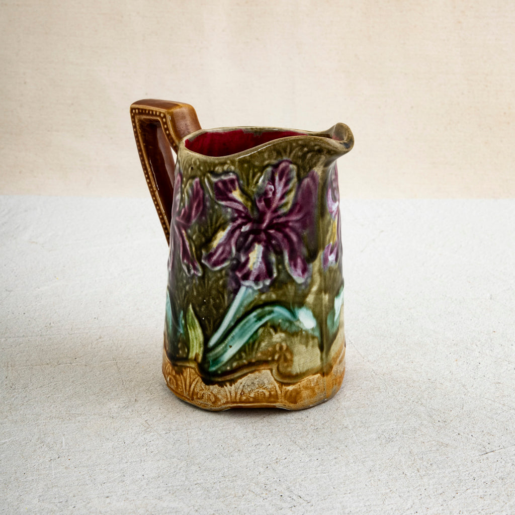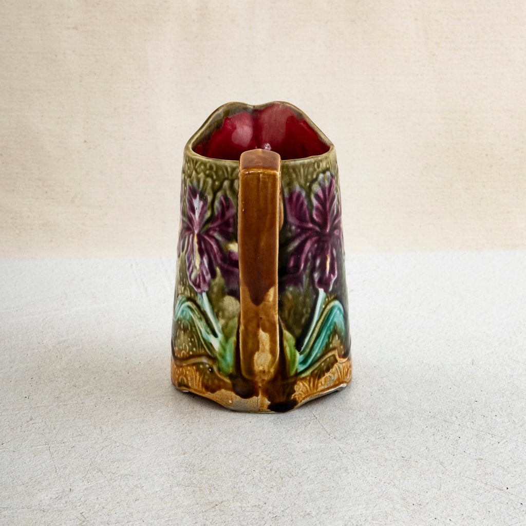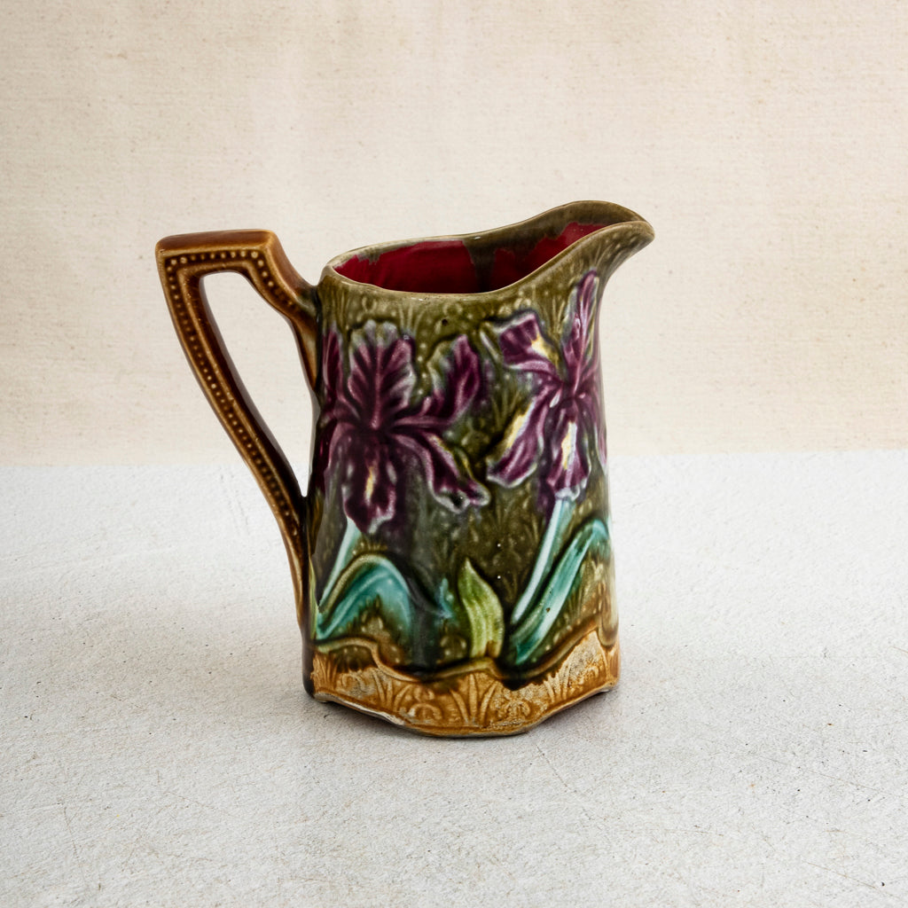 Early twentieth century Majolica pitcher with irises. 5.5" H X 3.5" Diameter 5.5" L with handle