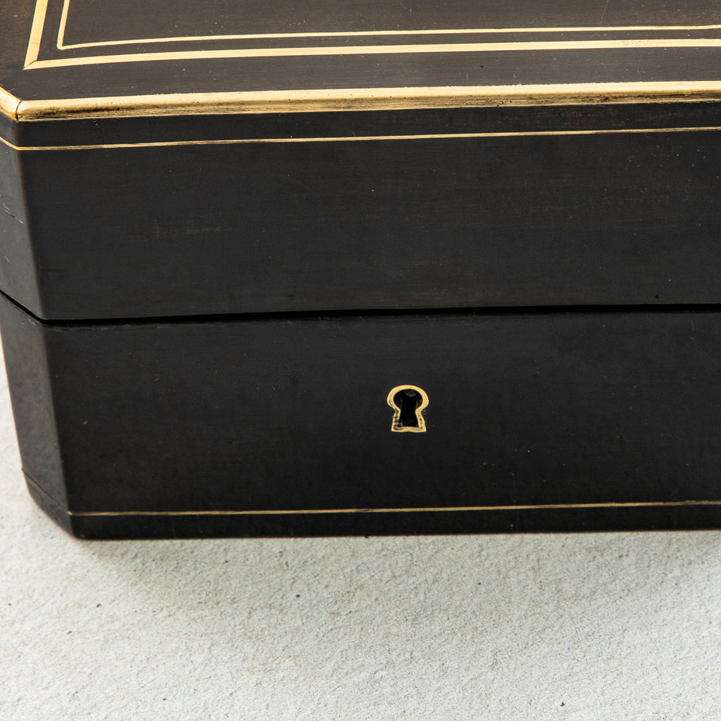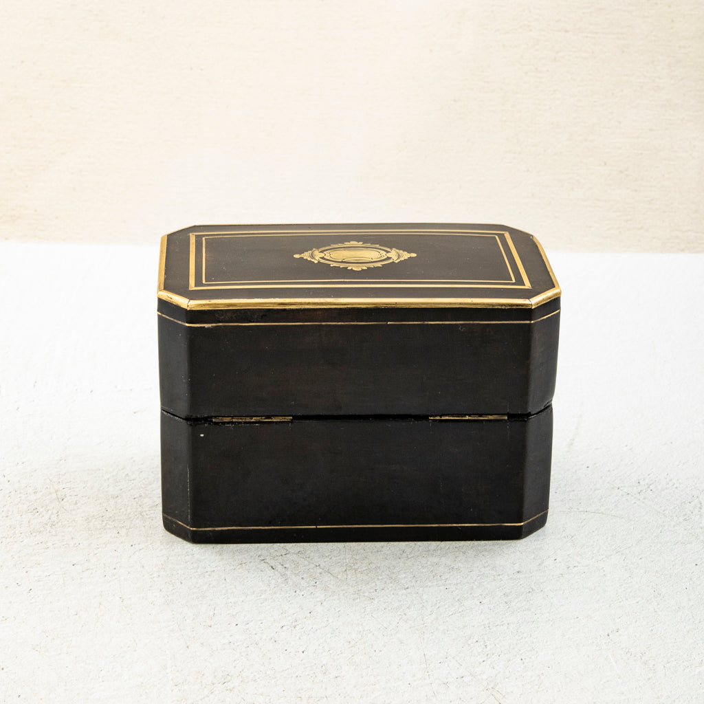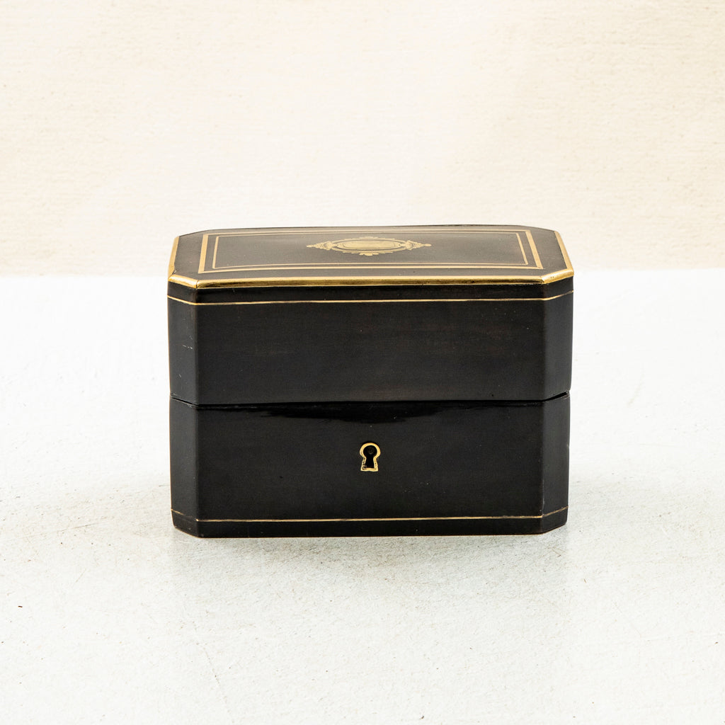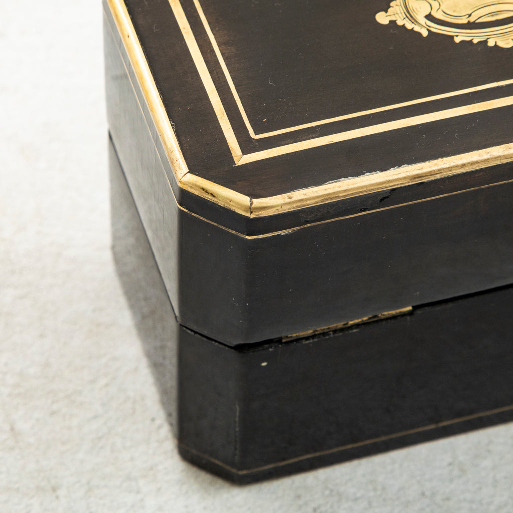 Small nineteenth century Napoleon III period black lacquer box with bronze inlay, c. 1860. No key. 5.25" L X 3" W X 3.5" H