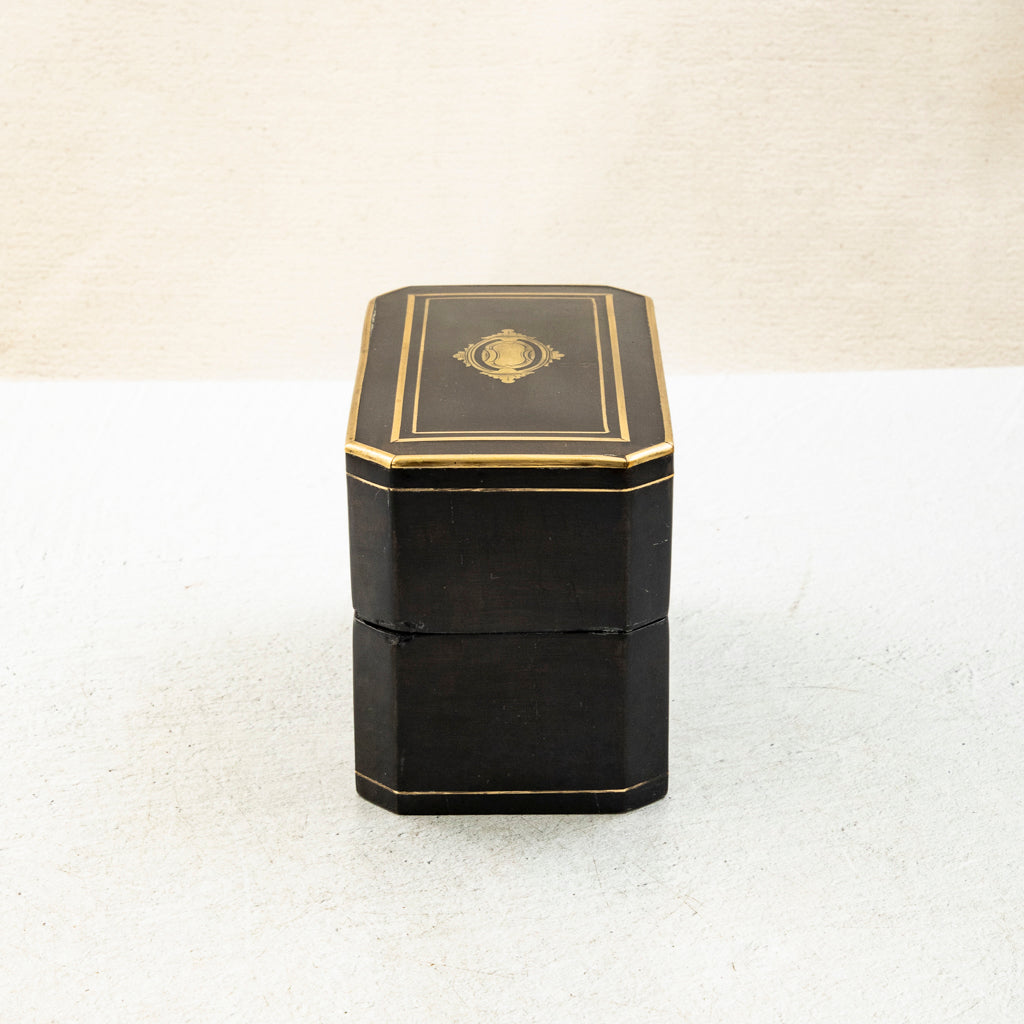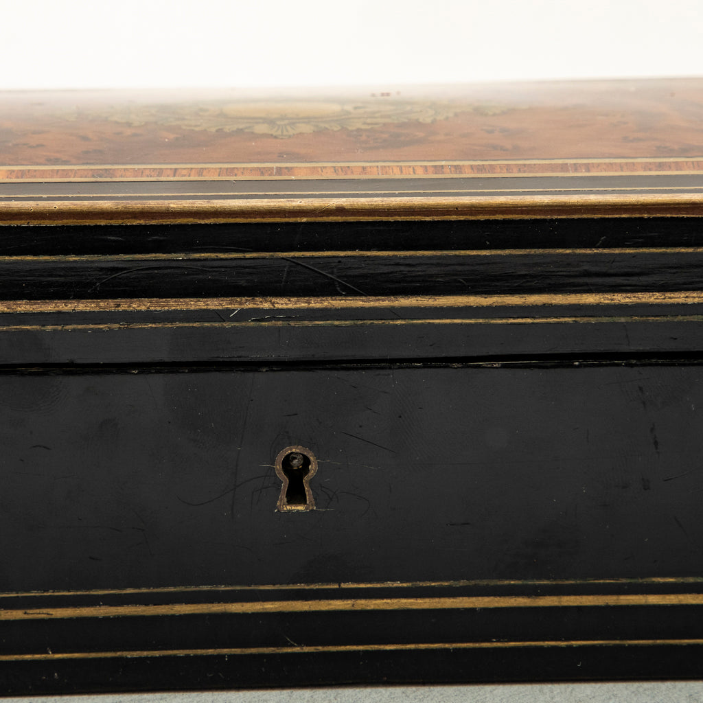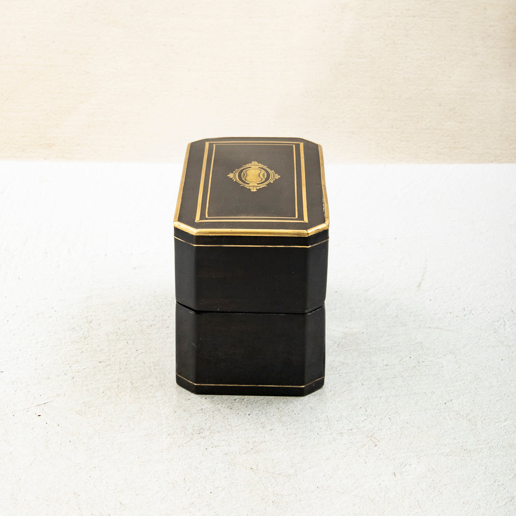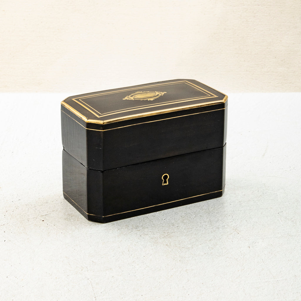 Small nineteenth century Napoleon III period black lacquer box with bronze inlay, c. 1860. No key. 5.25" L X 3" W X 3.5" H