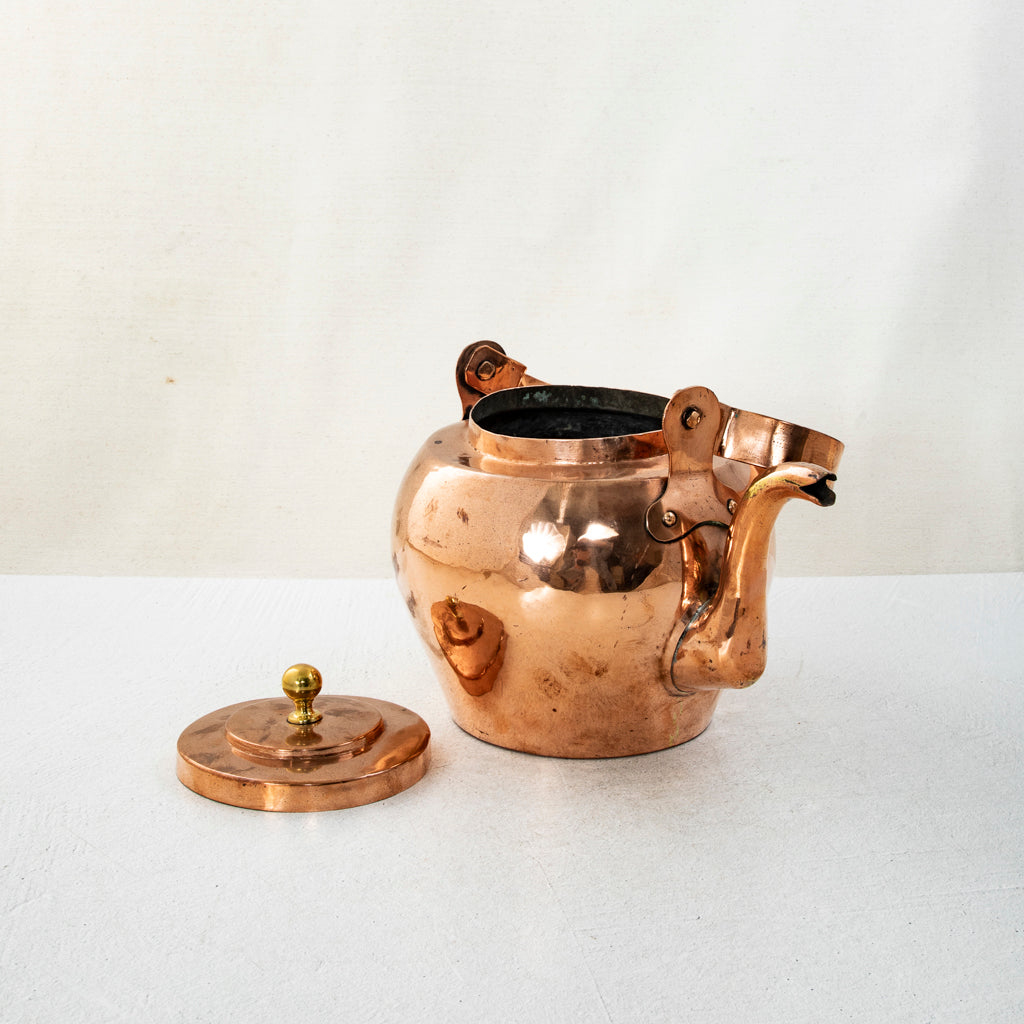 Nineteenth century copper tea kettle with copper riveted handle. 11.5" H X 7.5" Diameter 11.5" L with spout and handle