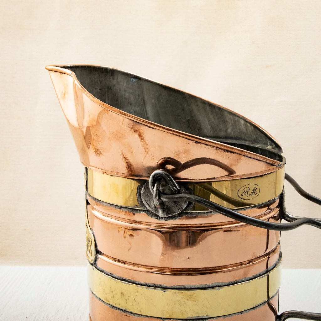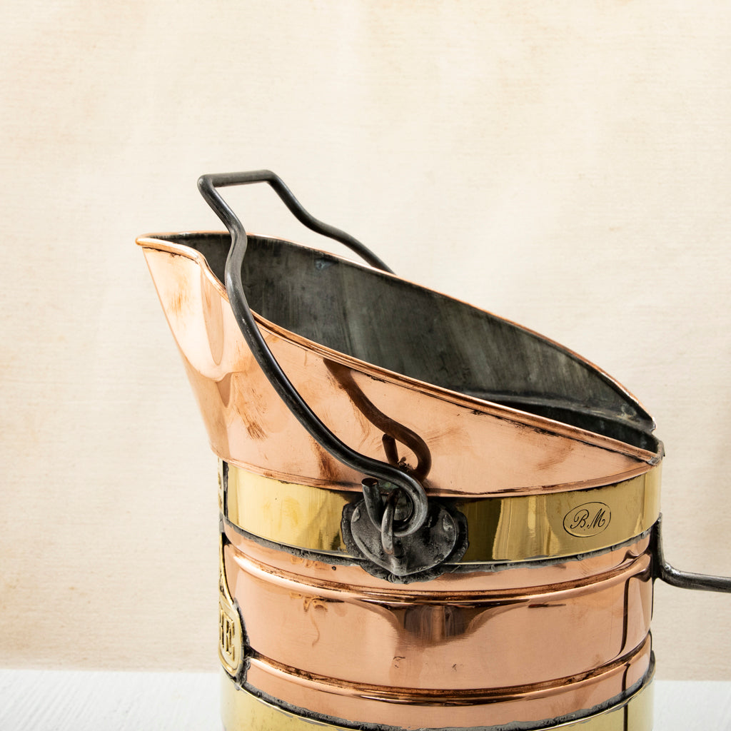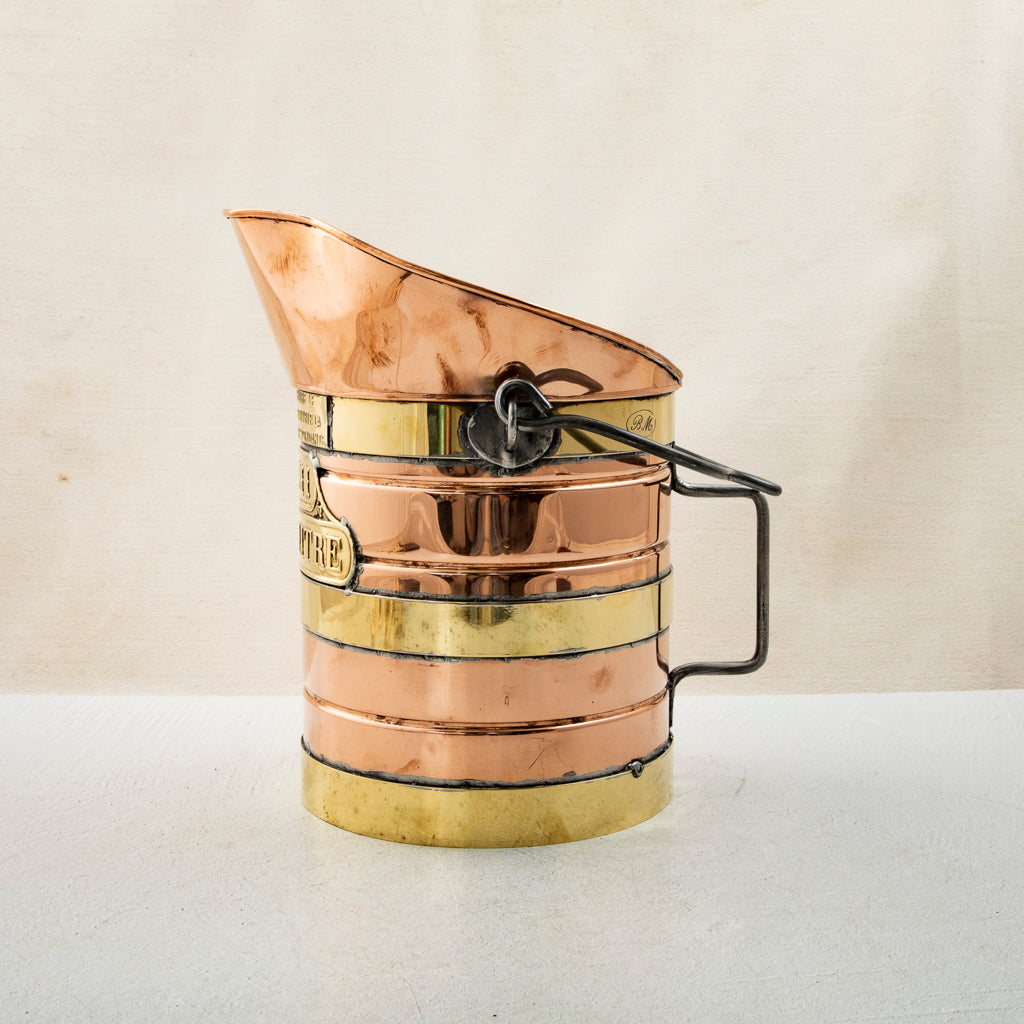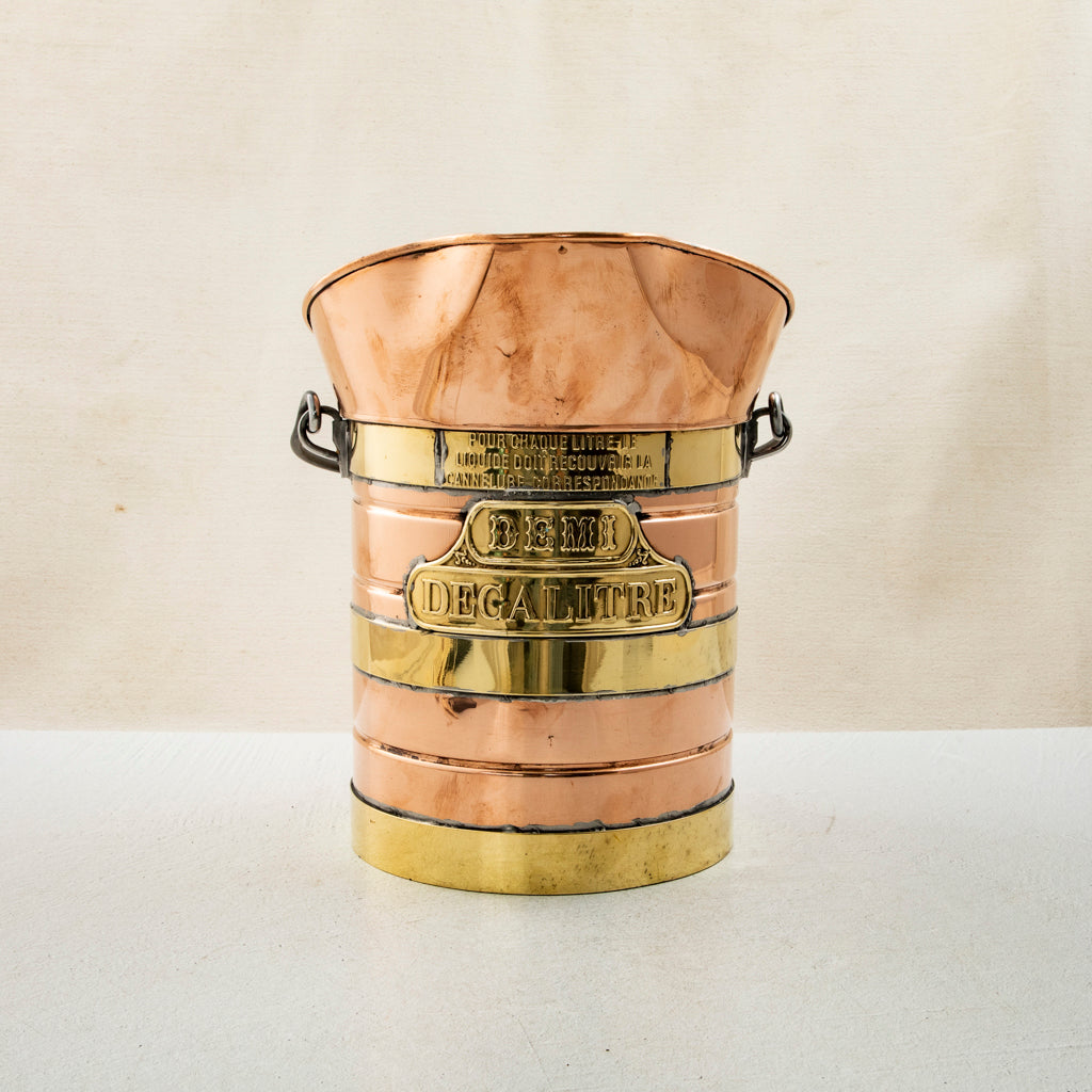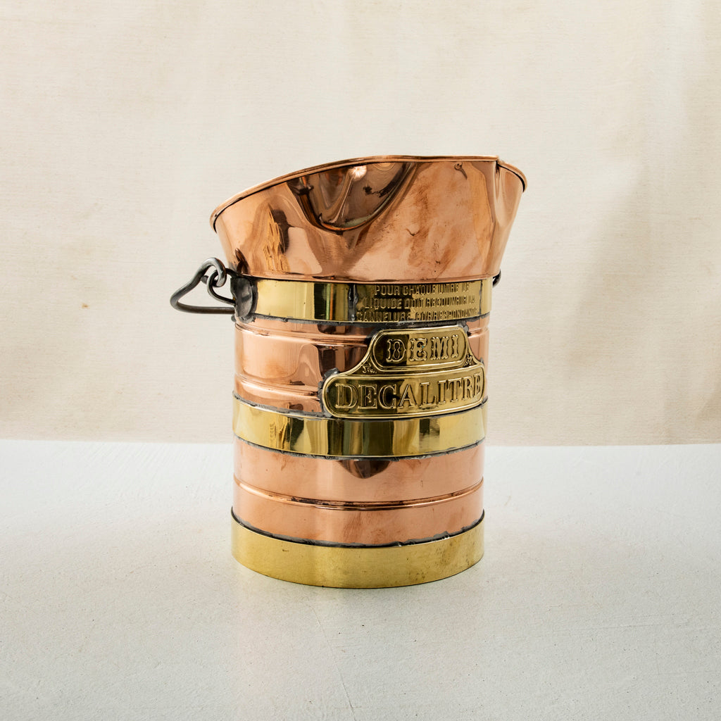 Large early twentieth century copper and brass bucket with spout used for measuring in the production of calvados, an apple brandy from Normandy. Rare demi decalitre size. 11.5" H...