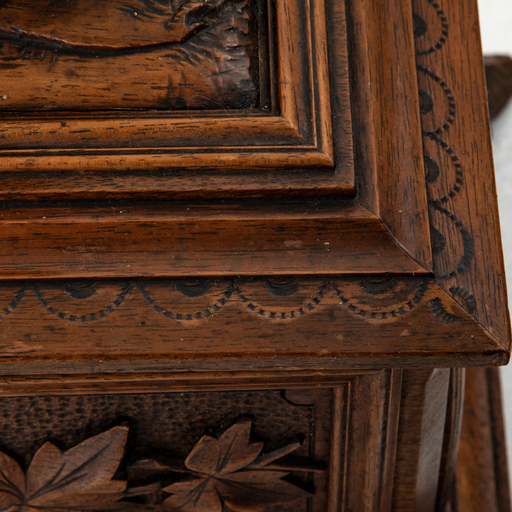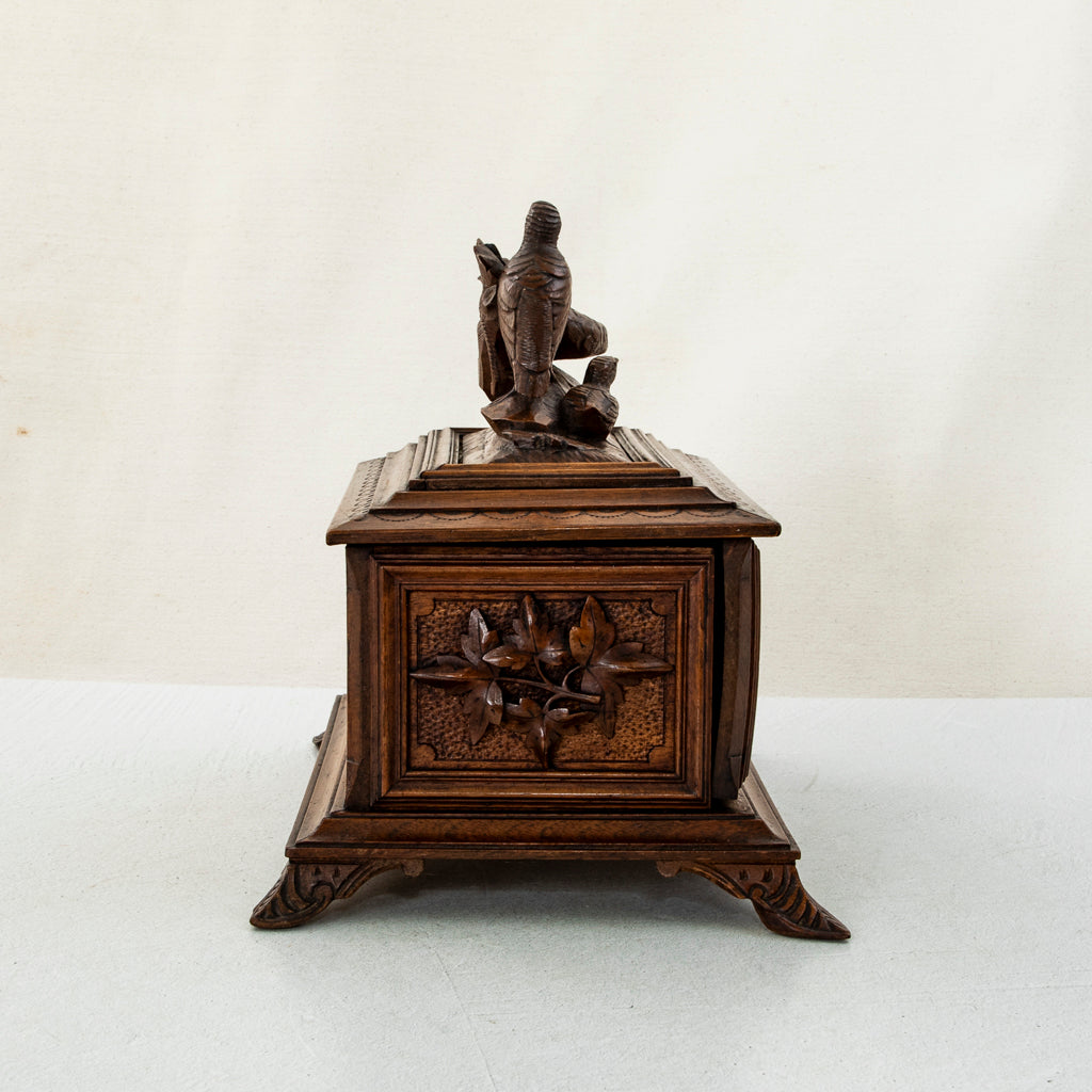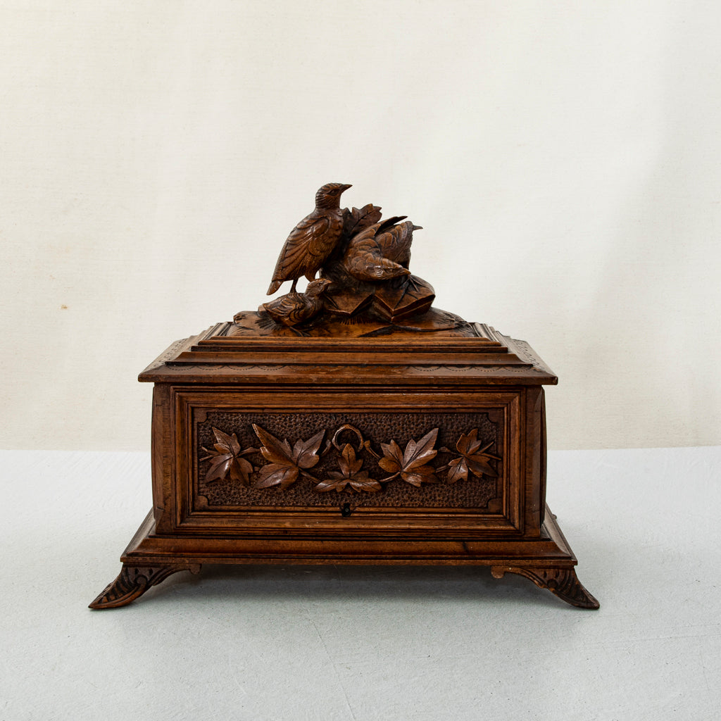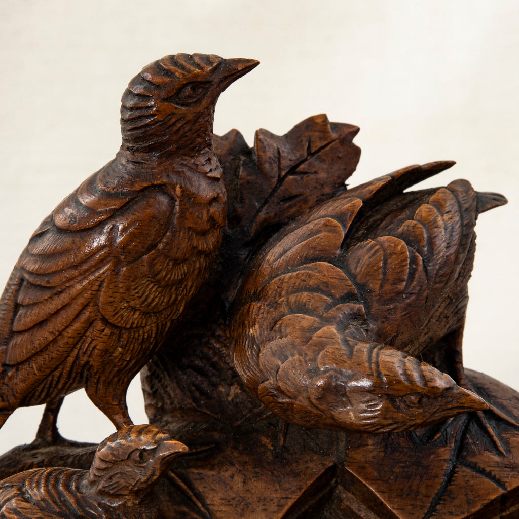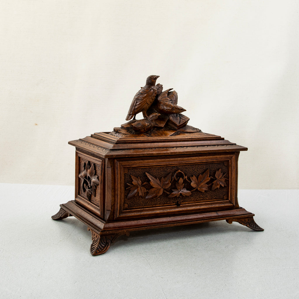 Hand carved Black Forest cigar presentation box with game birds on top. Three interior pull out trays to present cigars. c. 1900. 10" H X 12" W X 8.25"...