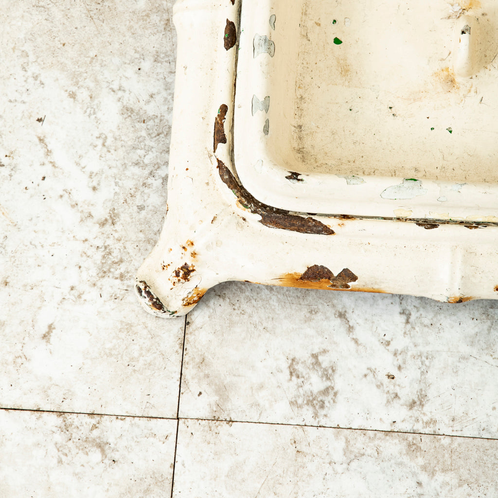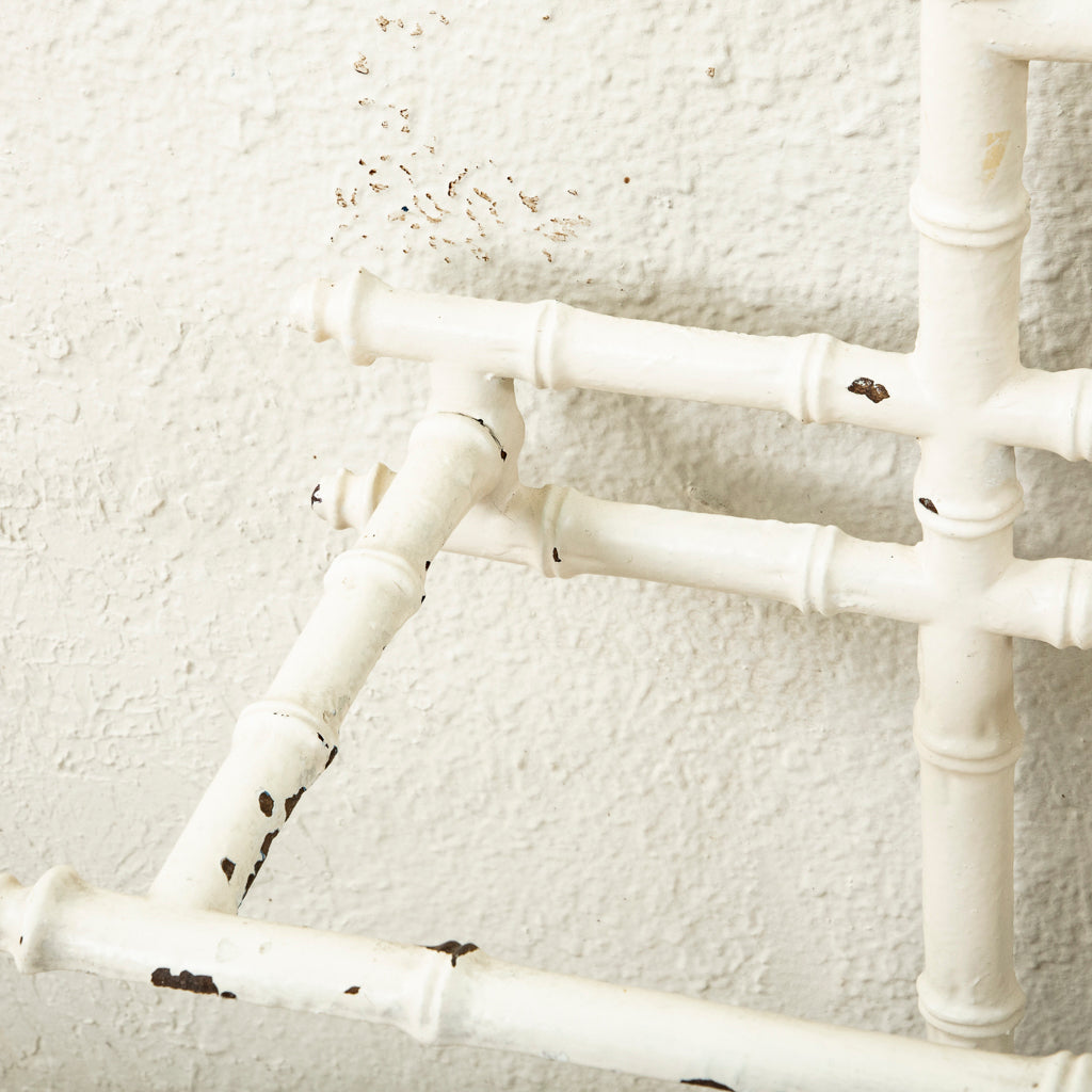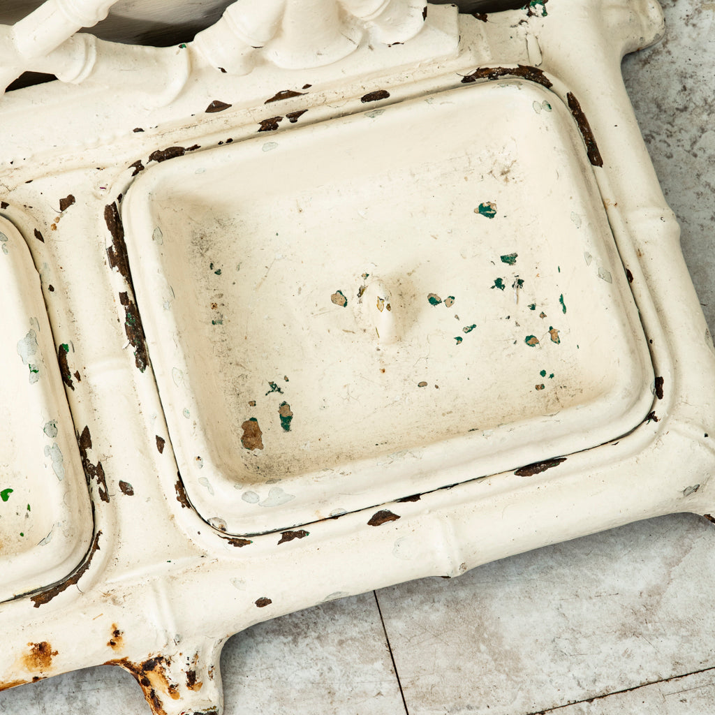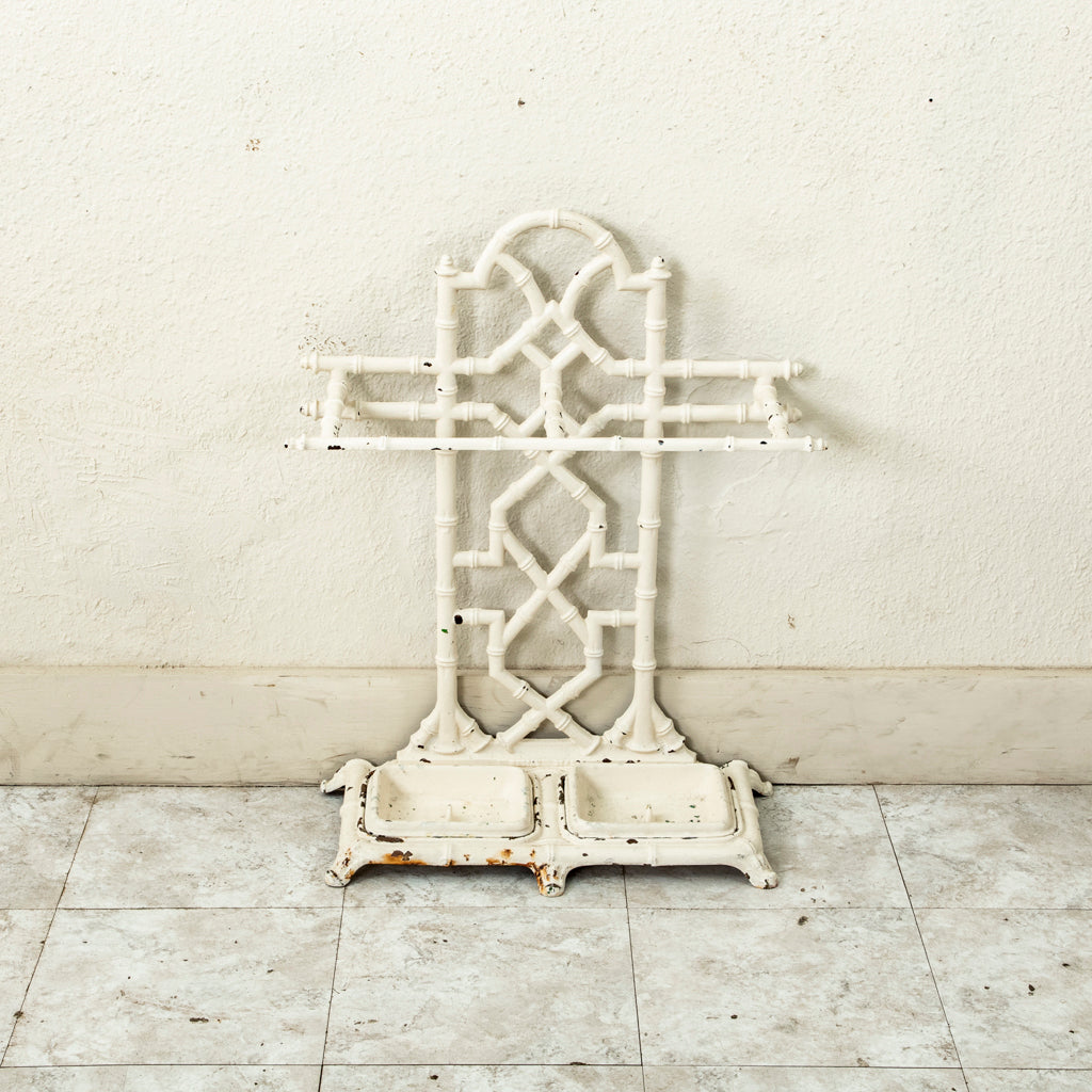 Late nineteenth century cast iron umbrella stand with bamboo motif and two original umbrella pans, c. 1900. 27.75" H X 22.5" W X 9.5" D