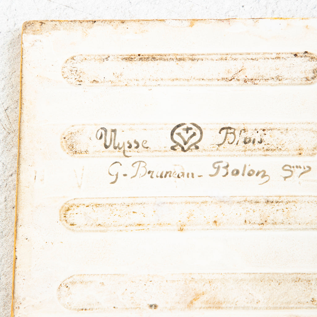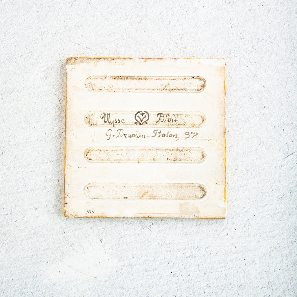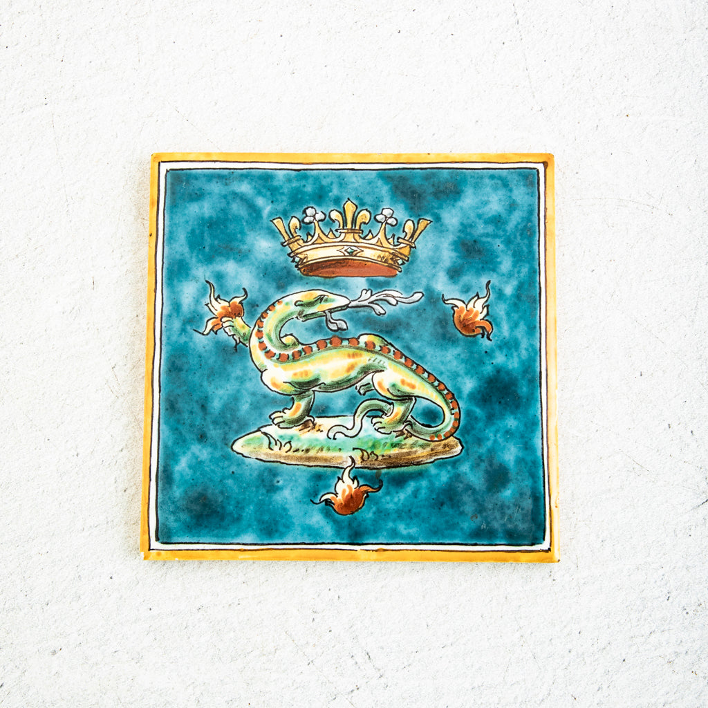 Faience de Blois tile with fire breathing salamander and crown, the coat of arms of Francois I, the Renaissance king of France. 4.25" Square