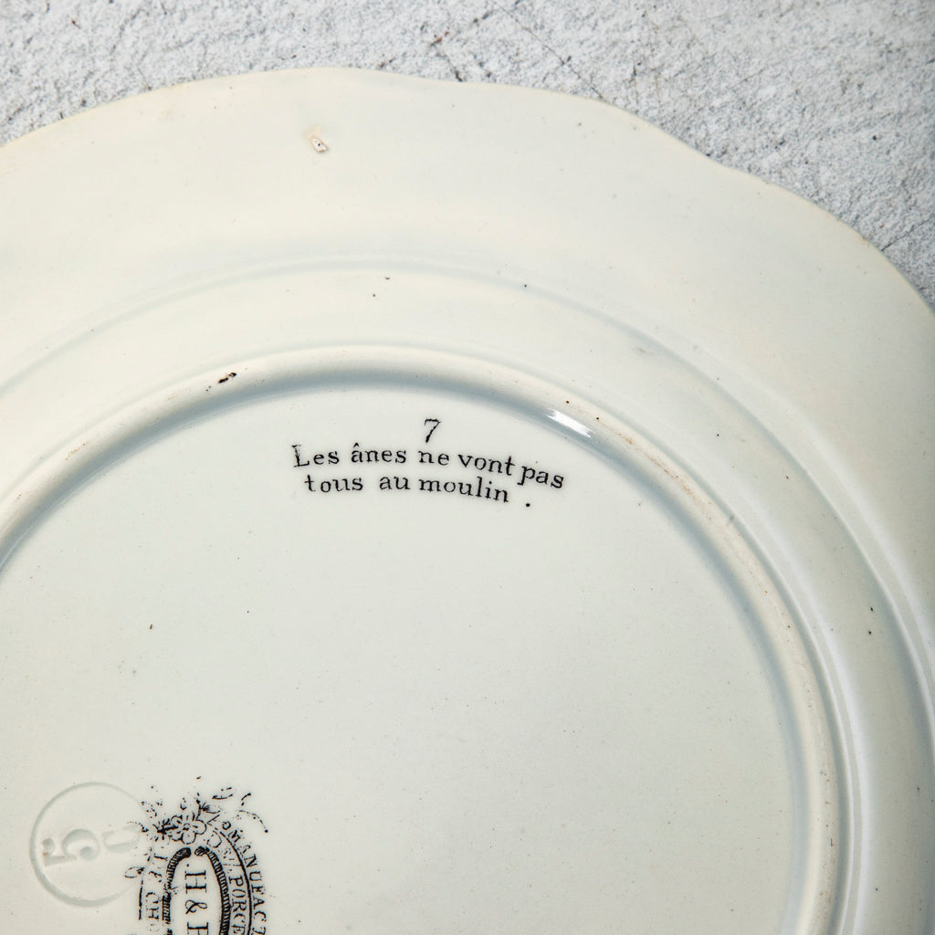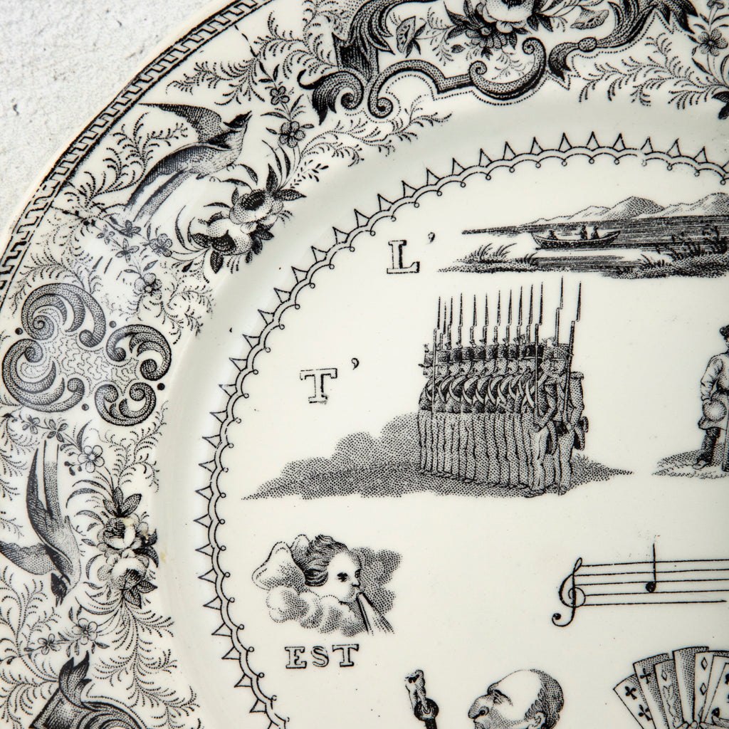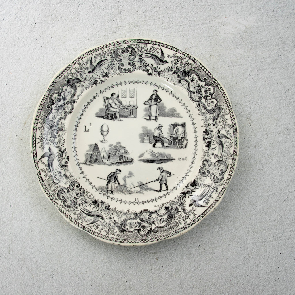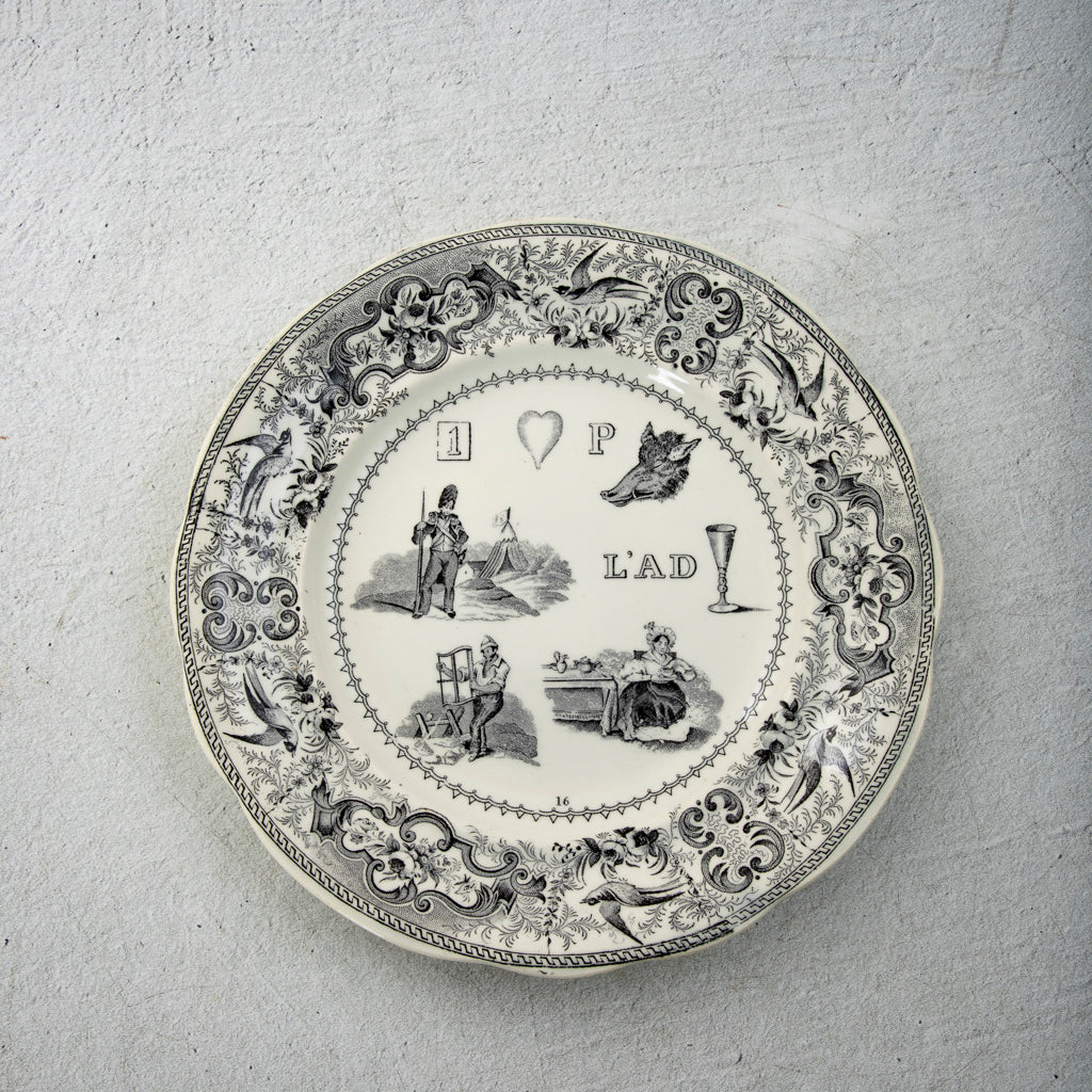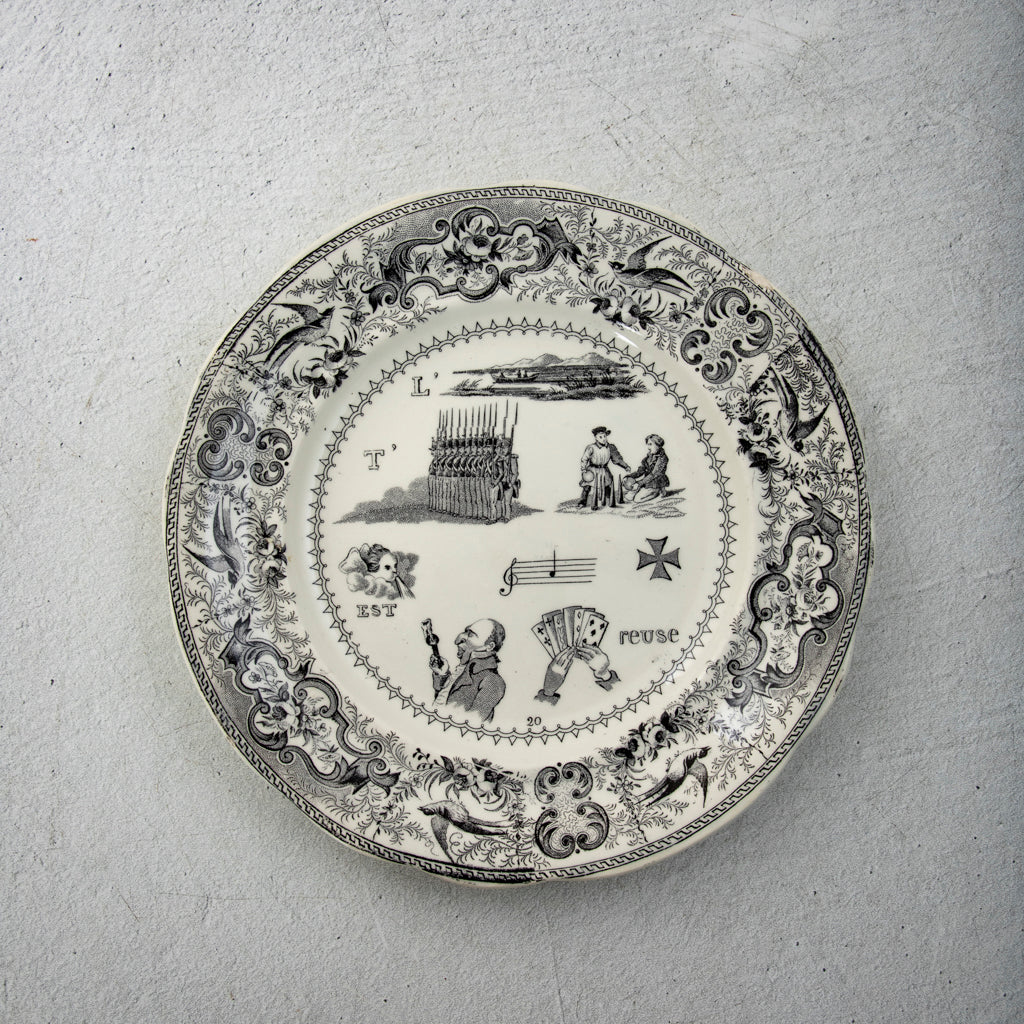 Set of eight late nineteenth century black and white faience rebus plates. A rebus is a puzzle in which words are represented by combinations of pictures and individual letters. Used...