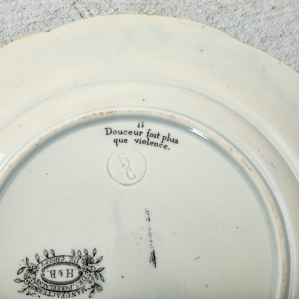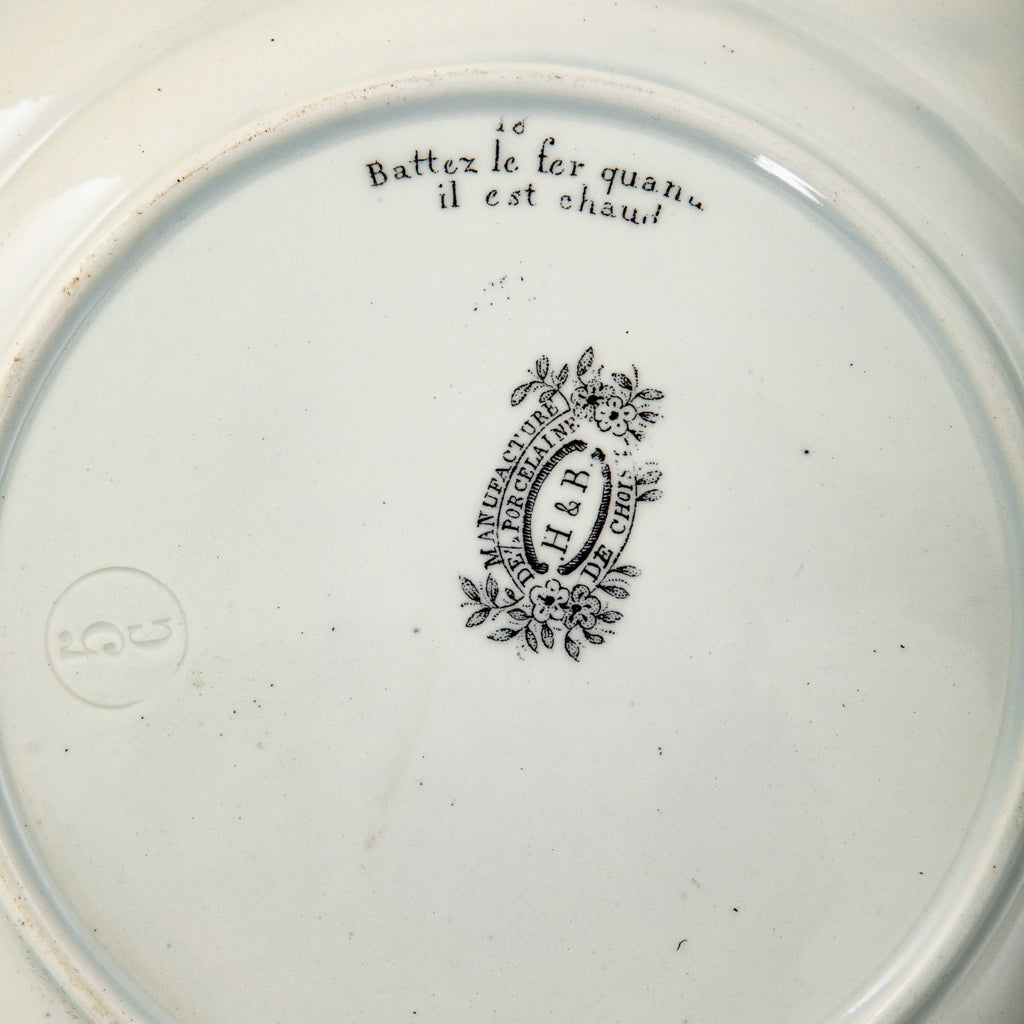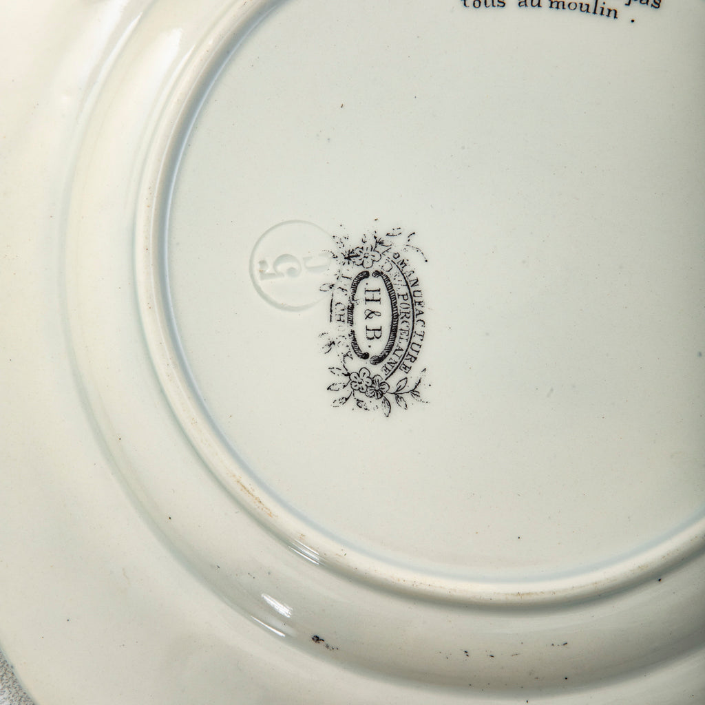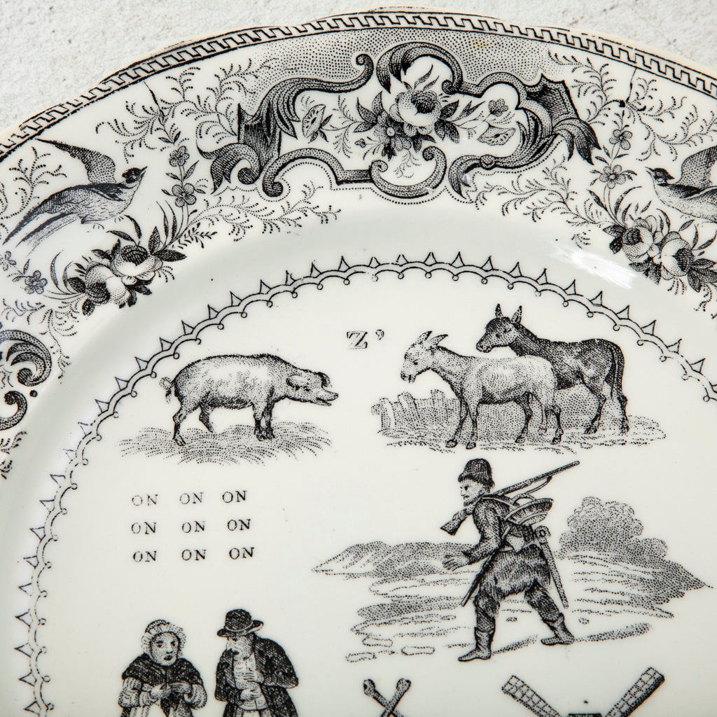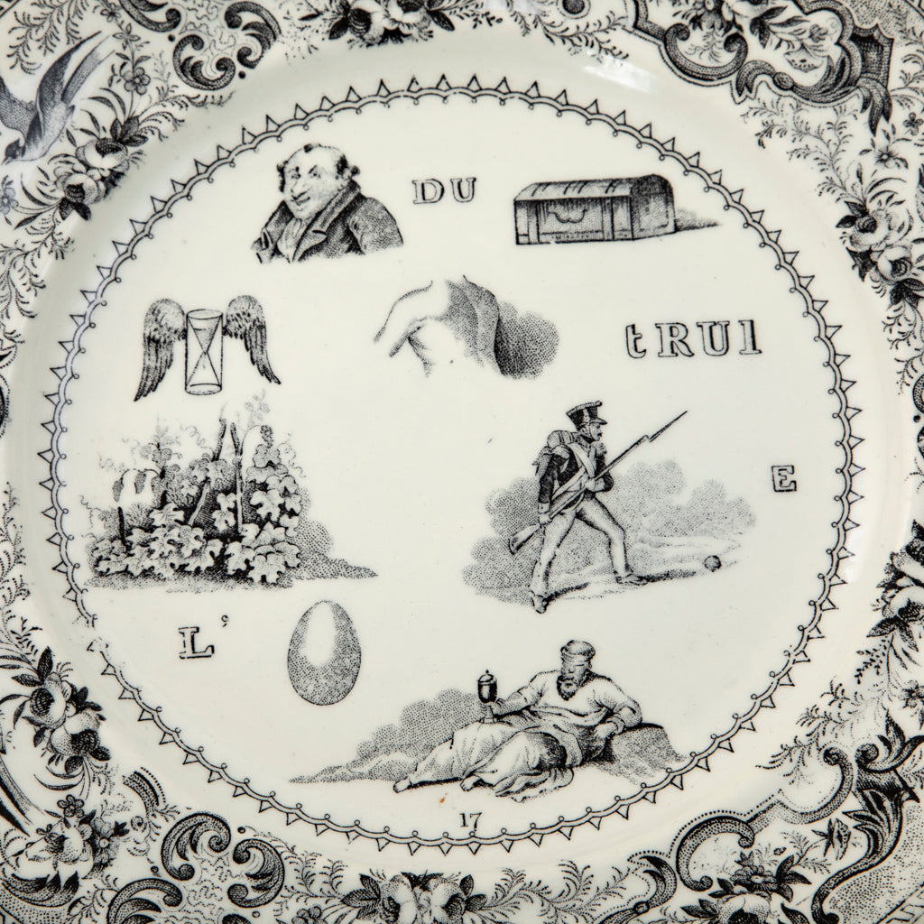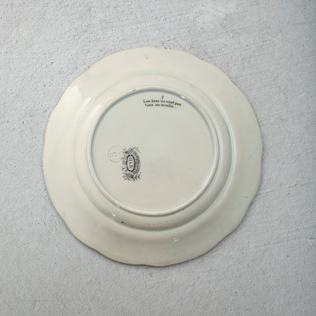 Set of eight late nineteenth century black and white faience rebus plates. A rebus is a puzzle in which words are represented by combinations of pictures and individual letters. Used...