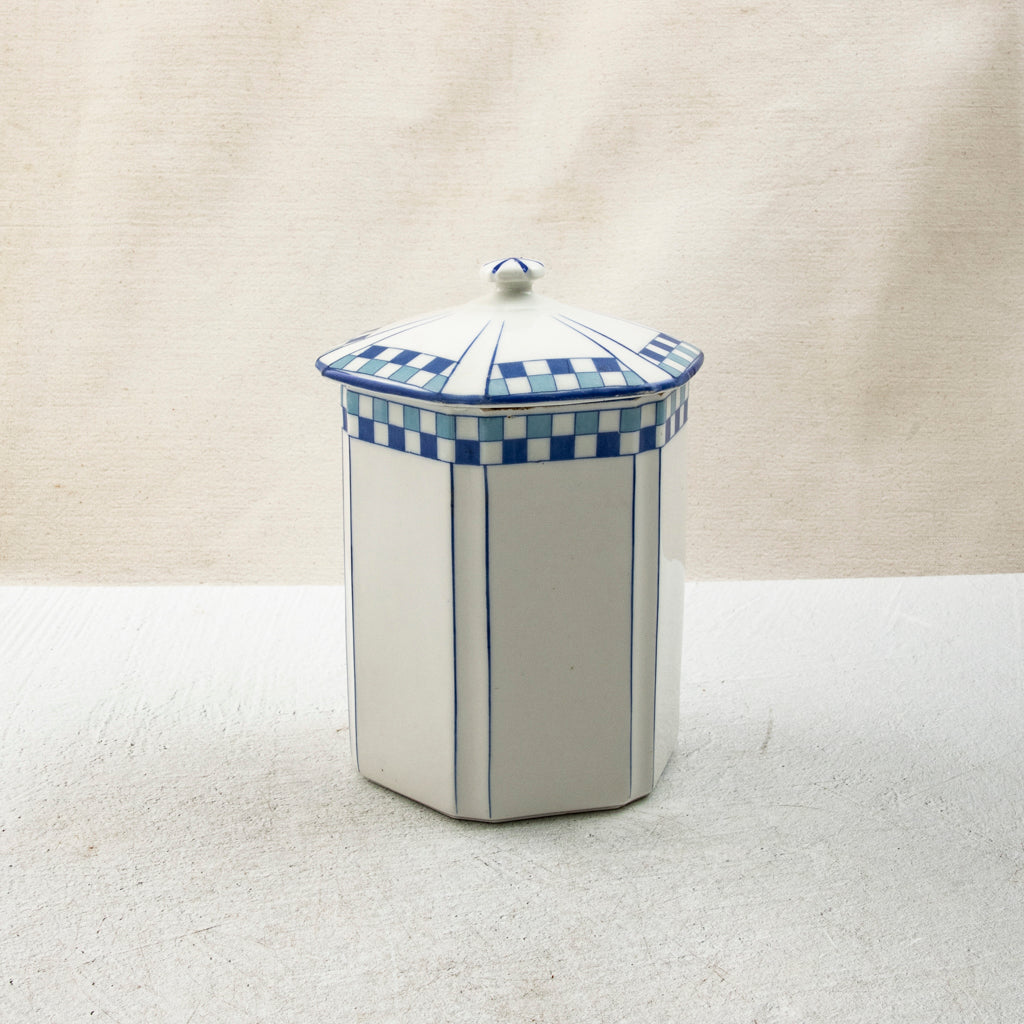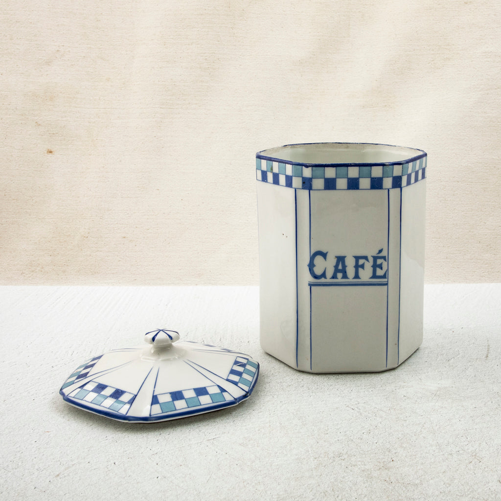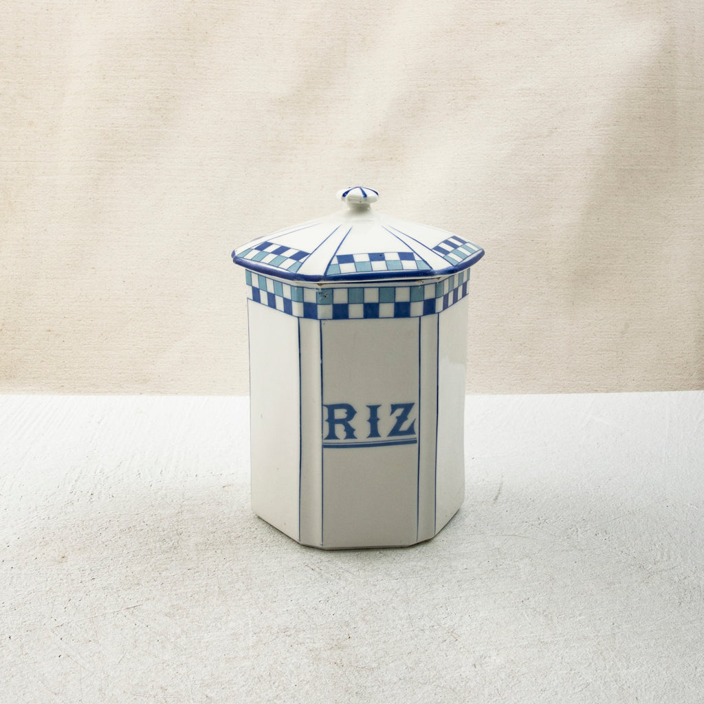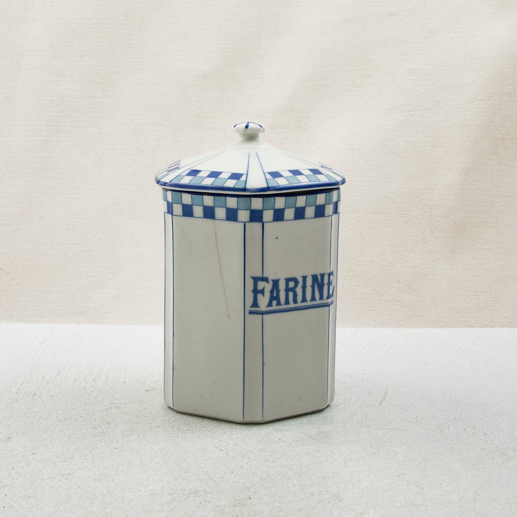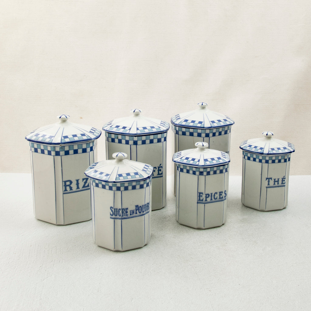 Set of six faience pots d'epices or canisters with lids. Lustucru design. Marked Farine, Riz, Cafe, Epices, Sucre en Poudre, The (Flour, Rice, Coffee, Spices, Powdered Sugar, Tea). 6"...