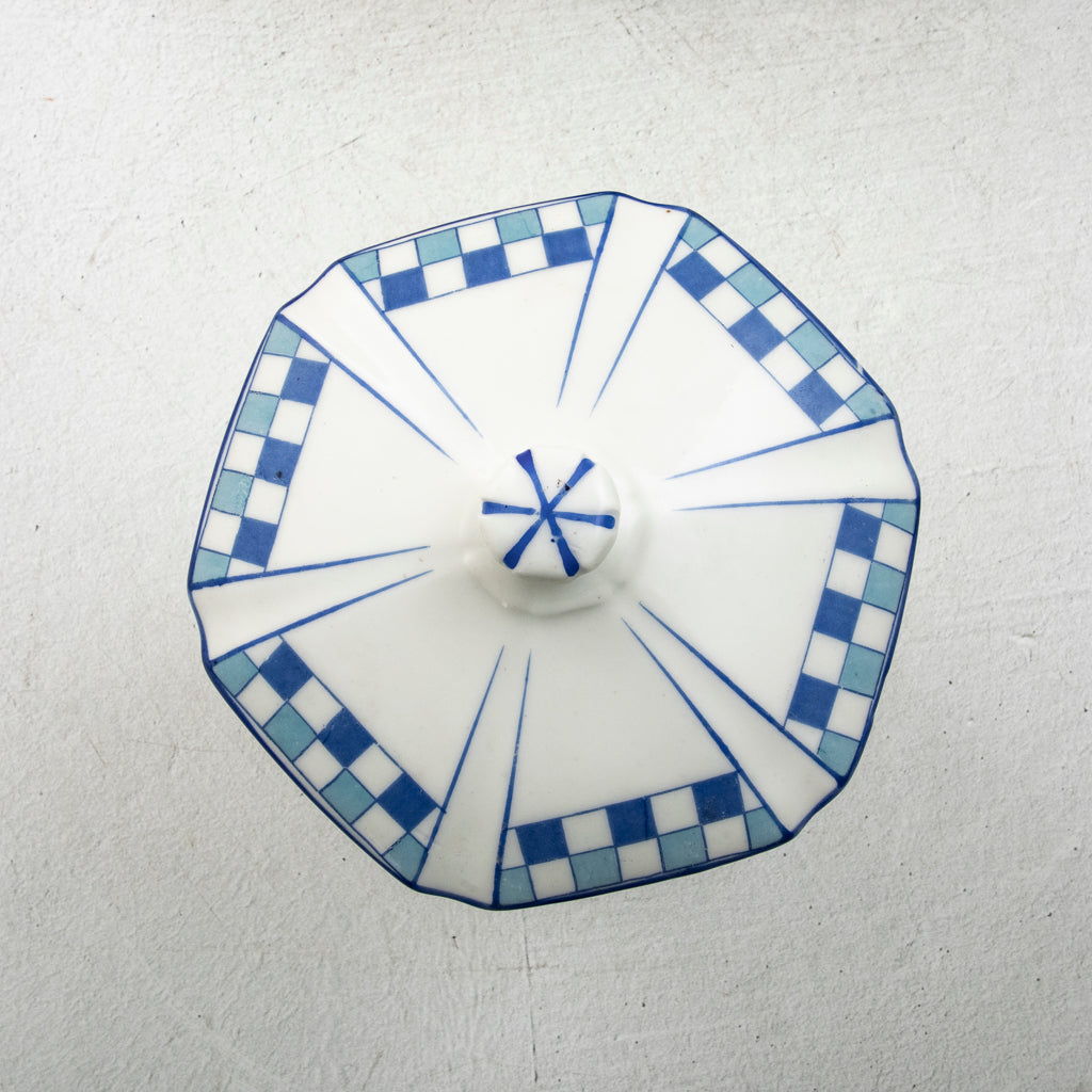 Early twentieth century glass vanity set with blue detailing. Includes three bottles with stoppers and one dish with lid. 4.5" to 6" H