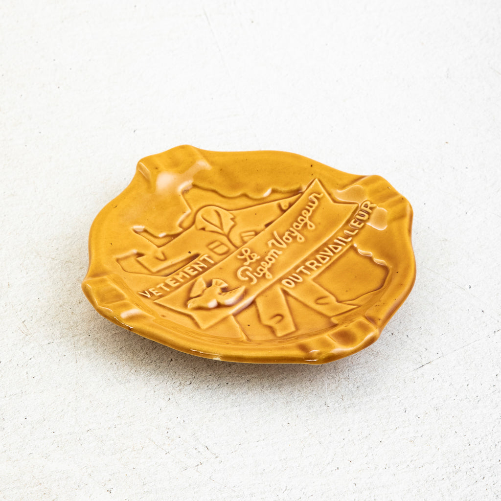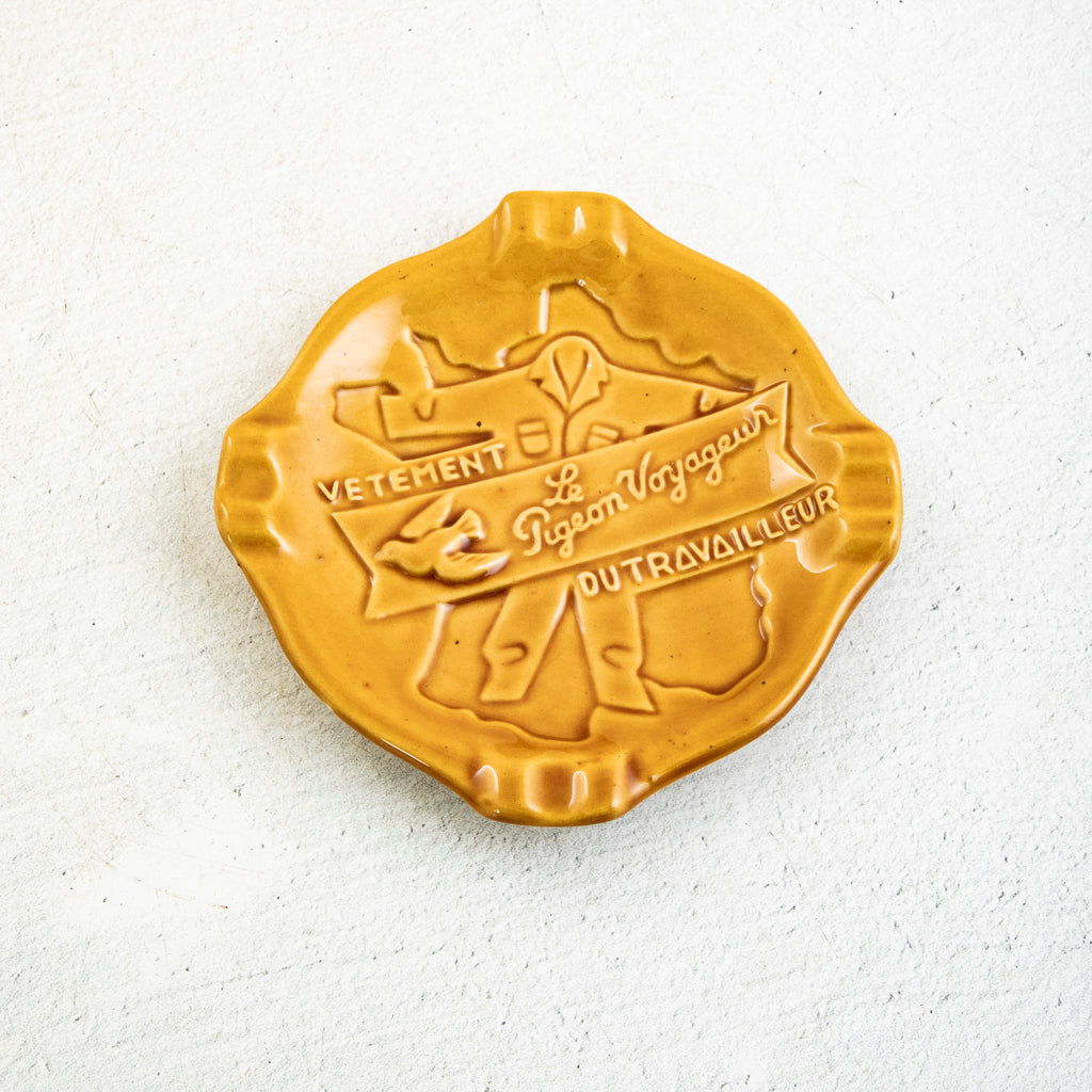 Mid-century faience ashtray advertising Pigeon Voyageur work clothes. Two available. Sold separately. 6" Diameter