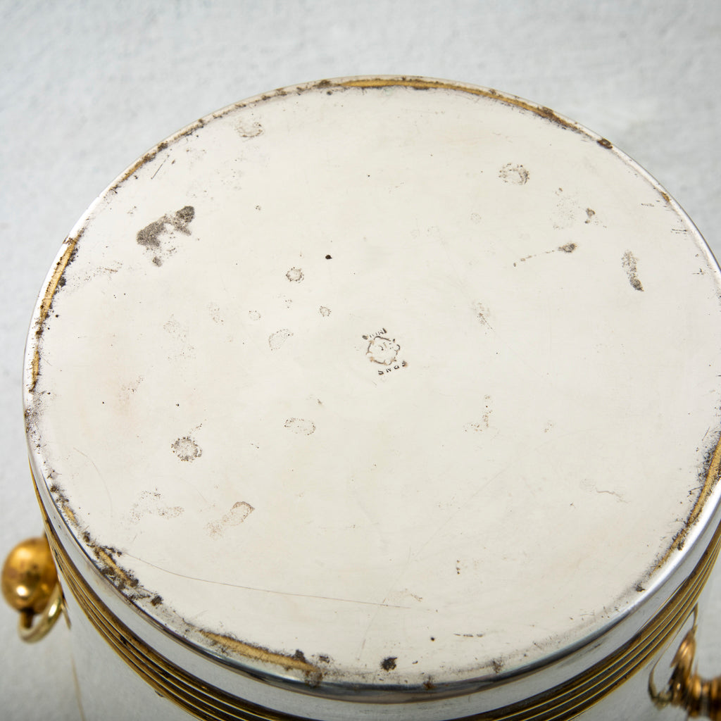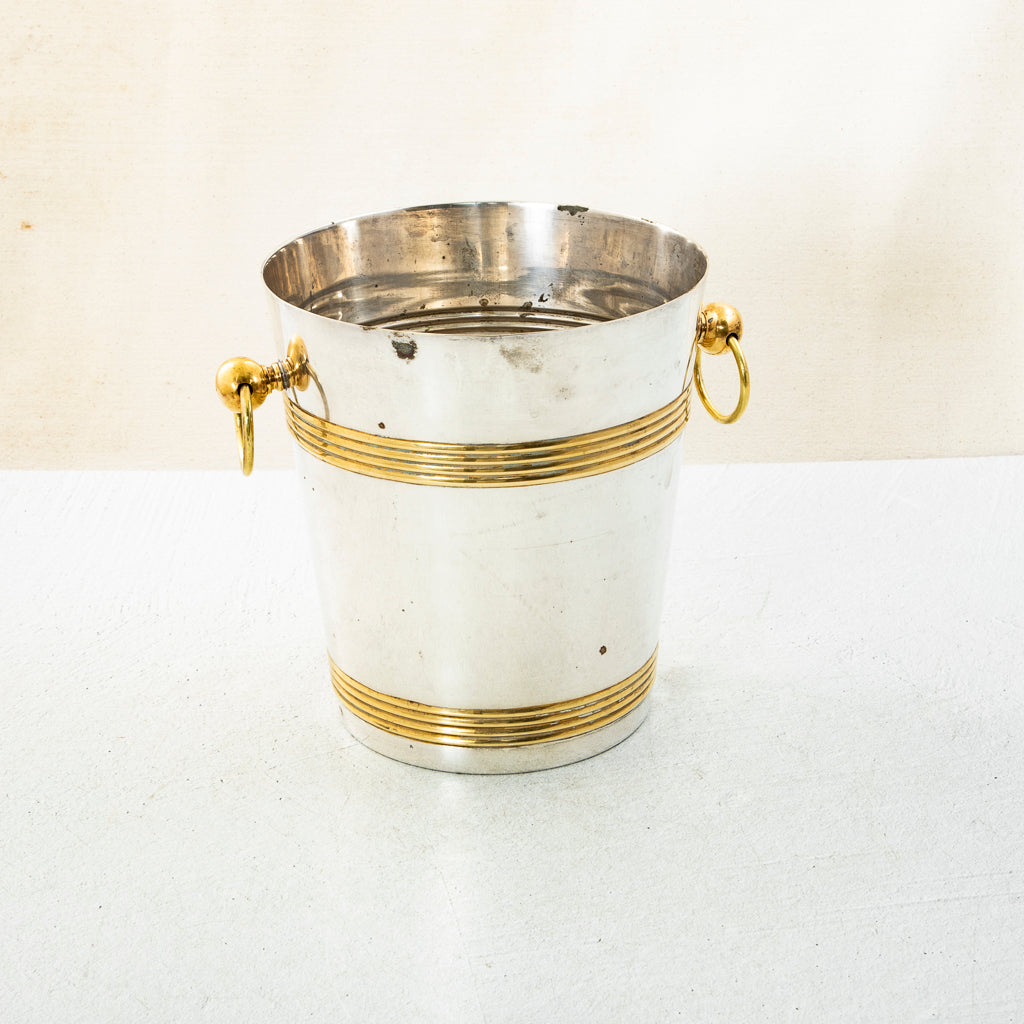 Silver plate and brass champagne bucket with drop ring handles. 8.5" H X 7.75" Diameter 9.5" W with handles