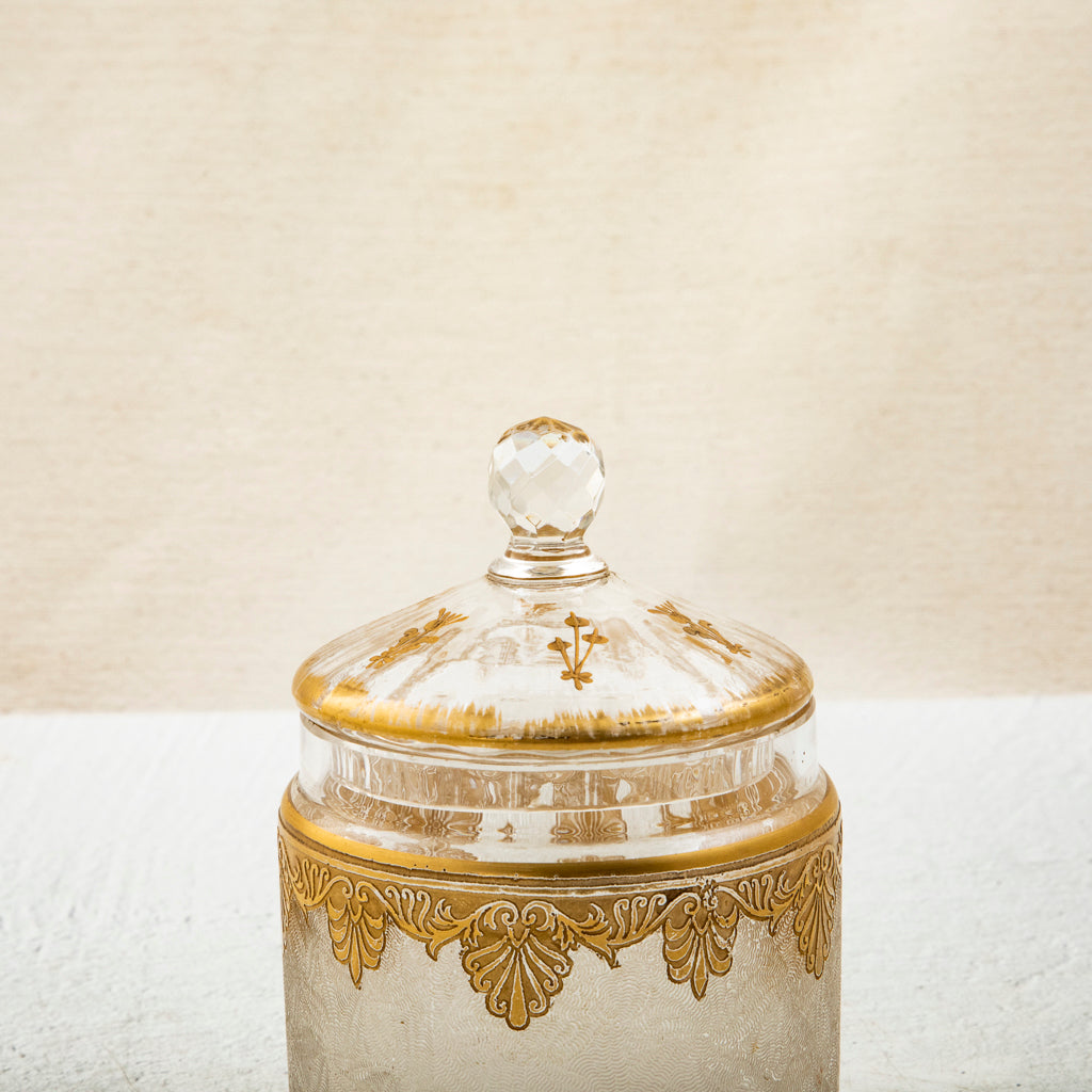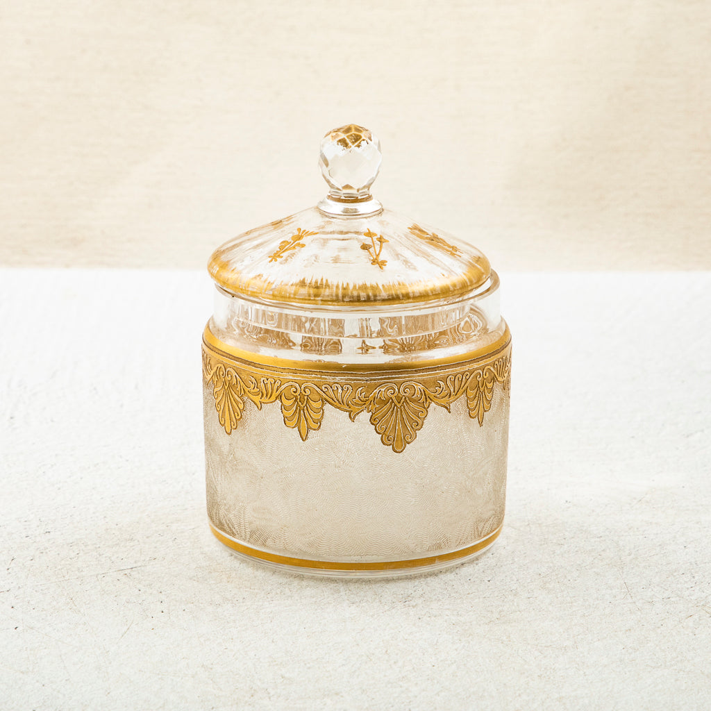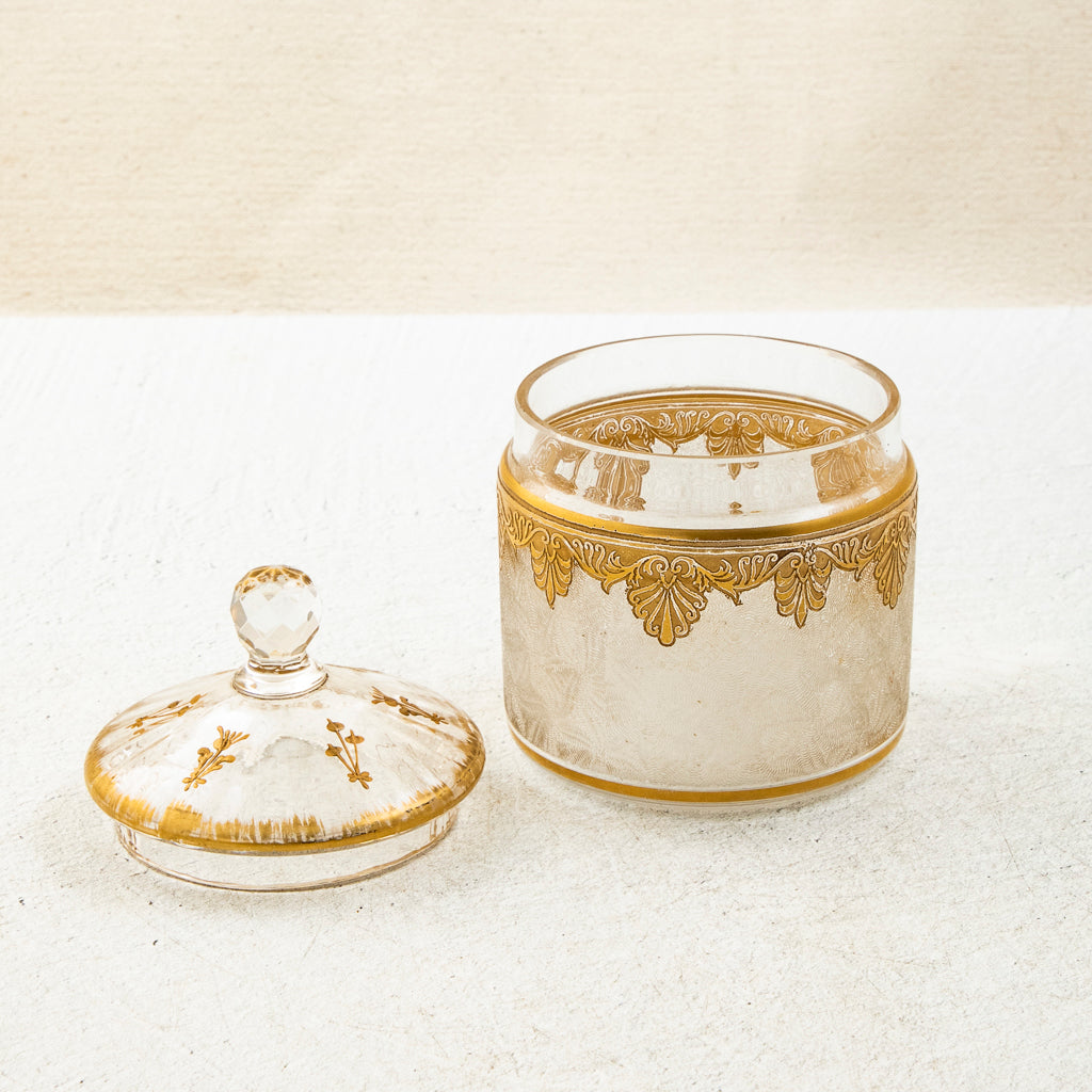 Early twentieth century crystal powder box with lid and gold detailing, c. 1920. 4.75" H X 3.25" Diameter